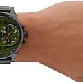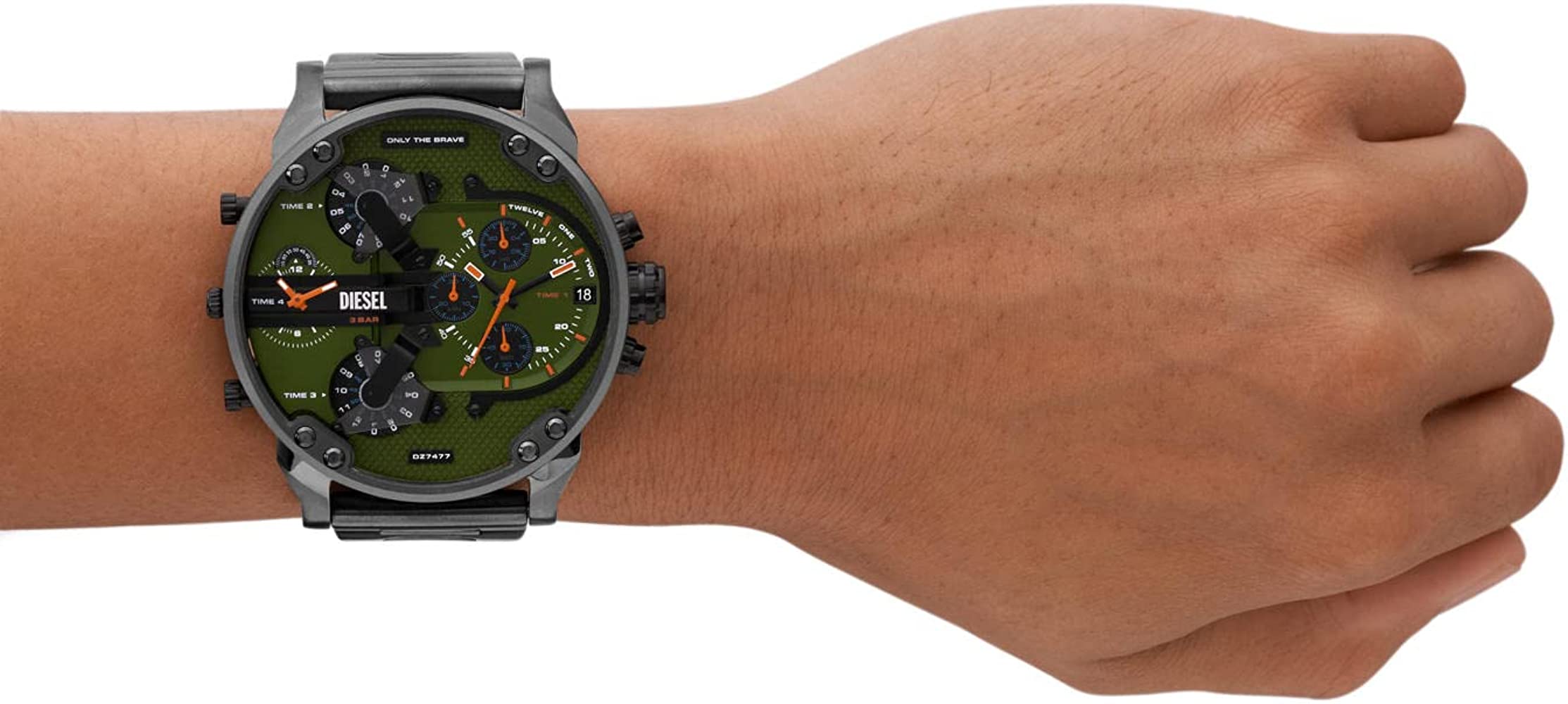 Мужские американские часы-хронографХронографФункция позволяет измерять отрезки времени с особой точностью: часы, минуты, секунды. Верным признаком хронографа является наличие на циферблате 3 дополнительных окошек-счётчиков. с секундомеромСекундомерСекундоме́р — прибор, способный измерять интервалы времени с точностью до долей секунды. Diesel Mr. Daddy 2.0 DZ7477, кварцевый механизм с высокой точностью. Минеральное стеклоМинеральное стеклоМинеральное стекло представляет собой искусственно выращенный минерал кварца. Такое стекло отличается особой устойчивостью к повреждениям и царапинам. Уступает по некоторым качествам сапфировому стеклу. устойчивое к мелким механическим повреждениям. Класс водозащиты: 30 метров, позволит защитить корпус от случайных брызг или капель дождя. Корпус часов изготовлен из стали с IP-покрытиемIP-покрытиеМетод ионного напыления. Демонстрирует повышенную устойчивость к истиранию, окислению и химическим веществам. Под воздействием высокого давления и температуры около 1500°C молекулы металла надёжно соединяются с частицами корпуса часов.. Стальной браслет на раскладной застёжкеРаскладная застёжкаТакой тип застёжки используется только на браслетах из металла. Она никогда не раскрывается полностью, происходит разделение на 2 и более частей. Раскладывающая застёжка снизит вероятность потери часов к минимуму. с IP-покрытиемIP-покрытиеМетод ионного напыления. Демонстрирует повышенную устойчивость к истиранию, окислению и химическим веществам. Под воздействием высокого давления и температуры около 1500°C молекулы металла надёжно соединяются с частицами корпуса часов.. мирового времениМировое время Полезное часовое усложнение, отображающее время в основных городах и известных областях по всему миру, оно связано с часовыми поясами, удобно для путешественников и бизнесменов. включает 4 часовые зоны.