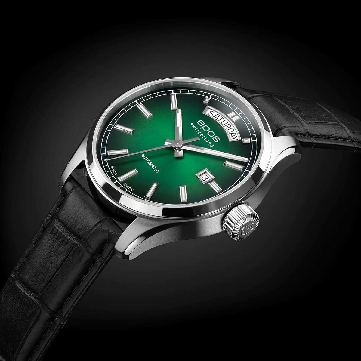 Мужские механические часы с автоподзаводом Epos из коллекции Passion — это сочетание швейцарского мастерства и современного дизайна. Корпус диаметром 41 мм и толщиной 11 мм выполнен из нержавеющей стали 316L. Циферблат зелёного цвета оформлен индексами и дополнен окошками даты и дня недели. Циферблат защищён сапфировым стекломСапфировое стеклоПрочный и надёжный материал из кристалла сапфира синтетического происхождения, характеризующийся особой твёрдостью и устойчивостью к царапинам и повреждениям.. Стрелки и метки с люминесцентным покрытиемЛюминесцентное покрытиеПозволяет считывать показания времени в темноте. Производители наносят на стрелки, часовые индексы, безель или поверхность циферблата светонакопительный состав, дающий холодное свечение., обеспечивающим хорошую читаемость в темноте. Прозрачная задняя крышка позволяет наблюдать за работой механизма. Часы оснащены кожаным ремешком чёрного цвета с раскладной застёжкойРаскладная застёжкаТакой тип застёжки используется только на браслетах из металла. Она никогда не раскрывается полностью, происходит разделение на 2 и более частей. Раскладывающая застёжка снизит вероятность потери часов к минимуму.. Водонепроницаемость 100 м позволяет использовать часы для плавания и повседневного ношения. Гарантия — 24 месяца. Универсальный выбор для ценителя механики и выразительного стиля.