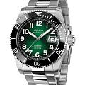 Мужские механические часы с автоподзаводом Epos — это профессиональный дайверский инструмент с швейцарским качеством. Корпус диаметром 41,5 мм и толщиной 13,3 мм выполнен из титана, что обеспечивает лёгкость и высокую прочность. Циферблат зелёного цвета оформлен контрастными метками и стрелками. Циферблат защищён сапфировым стекломСапфировое стеклоПрочный и надёжный материал из кристалла сапфира синтетического происхождения, характеризующийся особой твёрдостью и устойчивостью к царапинам и повреждениям.. Механизм — швейцарский калибр Sellita SW200. Окошко даты расположено в положении 3 часов. БезельБезельВнешний ободок, закрепляющий стекло. В спортивных часах так называется поворотное кольцо с делениями на циферблате, выполняет роль таймера – замеряет отрезки времени на шкале. Неподвижный безель – элемент декора. Однонаправленно вращающийся безель на дайверских часах позволяет фиксировать моменты погружения и выныривания на поверхность. — однонаправленный вращающийся. Завинчивающаяся коронка и автоматический гелиевый клапан позволяют использовать часы при глубоководных погружениях. Часы оснащены титановым браслетом на раскладной застёжкеРаскладная застёжкаТакой тип застёжки используется только на браслетах из металла. Она никогда не раскрывается полностью, происходит разделение на 2 и более частей. Раскладывающая застёжка снизит вероятность потери часов к минимуму.. Водонепроницаемость 500 м соответствует требованиям для профессионального дайвинга. Гарантия — 24 месяца. Идеальный выбор для тех, кто ценит надёжность, точность и экстремальные условия.