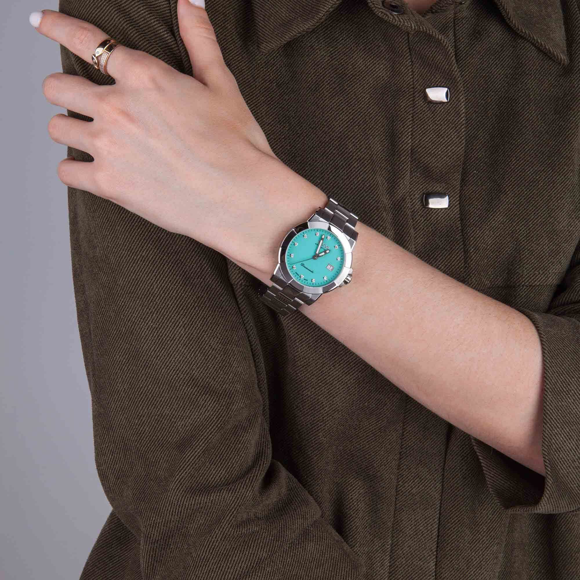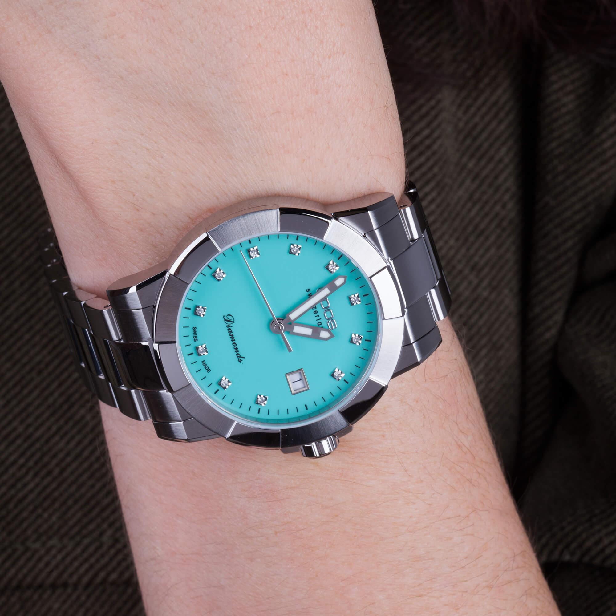 Женские кварцевые часы Epos из коллекции Ladies Diamonds — это элегантный аксессуар, сочетающий швейцарское качество и изысканный дизайн. Корпус диаметром 36 мм и толщиной 9 мм выполнен из нержавеющей стали 316L. Циферблат бирюзового цвета выполнен по технологии «солнечные лучи» и украшен синтетическими бриллиантами. Циферблат защищён сапфировым стекломСапфировое стеклоПрочный и надёжный материал из кристалла сапфира синтетического происхождения, характеризующийся особой твёрдостью и устойчивостью к царапинам и повреждениям.. Метки в виде точек инкрустированы бриллиантами. Стрелки с люминесцентным покрытиемЛюминесцентное покрытиеПозволяет считывать показания времени в темноте. Производители наносят на стрелки, часовые индексы, безель или поверхность циферблата светонакопительный состав, дающий холодное свечение., обеспечивающим хорошую читаемость в темноте. Окошко даты расположено в положении 3 часов. Механизм — швейцарский кварцевый калибр Ronda 705. Часы оснащены стальным браслетом на раскладной застёжкеРаскладная застёжкаТакой тип застёжки используется только на браслетах из металла. Она никогда не раскрывается полностью, происходит разделение на 2 и более частей. Раскладывающая застёжка снизит вероятность потери часов к минимуму.. Водонепроницаемость 50 м позволяет использовать часы в повседневных условиях. Гарантия — 24 месяца. Идеальный выбор для тех, кто ценит роскошь, стиль и точность.
