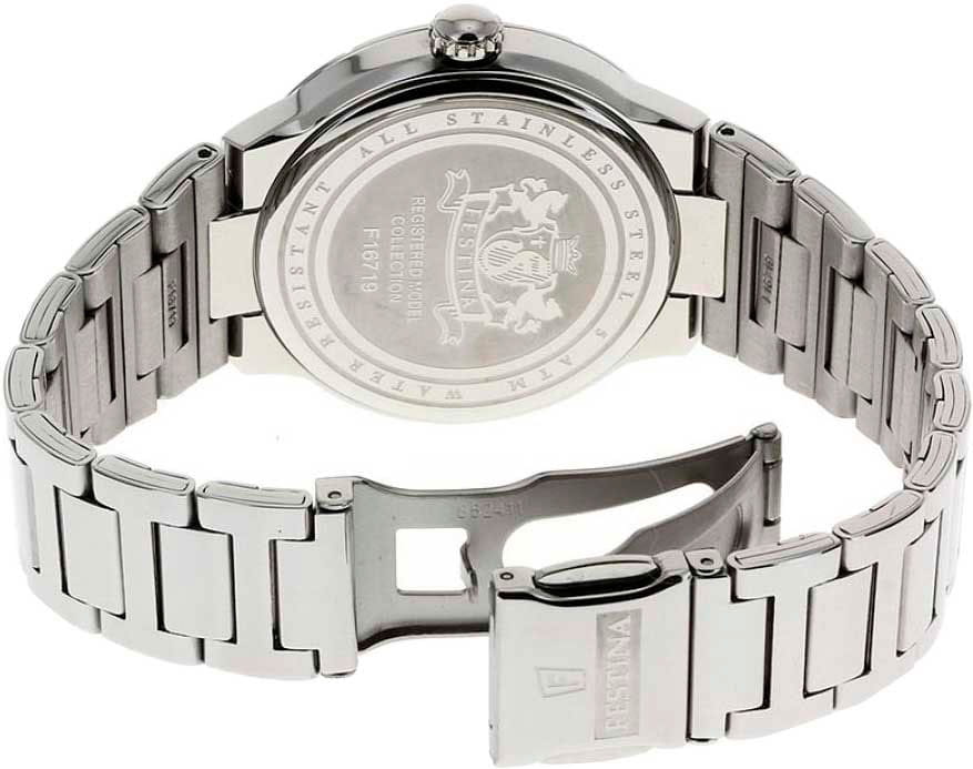 Женские кварцевые часы с минеральным стекломМинеральное стеклоМинеральное стекло представляет собой искусственно выращенный минерал кварца. Такое стекло отличается особой устойчивостью к повреждениям и царапинам. Уступает по некоторым качествам сапфировому стеклу. Festina Boyfriend F16719/4, кварцевый механизм с высокой точностью. Класс водозащиты: 50 метров, позволит защитить корпус от случайных брызг или капель дождя. Корпус часов изготовлен из стали. Стальной браслет на раскладной застёжкеРаскладная застёжкаТакой тип застёжки используется только на браслетах из металла. Она никогда не раскрывается полностью, происходит разделение на 2 и более частей. Раскладывающая застёжка снизит вероятность потери часов к минимуму.. Циферблат инкрустирован цирконами. Метки в виде точек (цирконы) и римских цифр. Рифленая заводная головка.