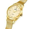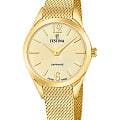 Женские кварцевые часы Festina F20077/3 из коллекции Swiss Made — это элегантный аксессуар с изысканным дизайном. Корпус диаметром 32 мм и толщиной 7,3 мм выполнен из нержавеющей стали с IP-покрытиемIP-покрытиеМетод ионного напыления. Демонстрирует повышенную устойчивость к истиранию, окислению и химическим веществам. Под воздействием высокого давления и температуры около 1500°C молекулы металла надёжно соединяются с частицами корпуса часов. золотого цвета. Циферблат золотого оттенка оформлен в минималистичном стиле. Циферблат защищён сапфировым стекломСапфировое стеклоПрочный и надёжный материал из кристалла сапфира синтетического происхождения, характеризующийся особой твёрдостью и устойчивостью к царапинам и повреждениям.. Заводная головка — вытягивающегося типа, задняя крышка — прижимная. Часы оснащены браслетом миланского плетения золотистого цвета на раскладном замкеРаскладной замокДанный вариант застежки используется только на часах с металлическим браслетом. Отличительная особенность такого крепления в том, что длина браслета становится универсальной и вы можете самостоятельно отрегулировать нужный вам размер – застежка просто двигается по браслету часов.. Механизм кварцевый, калибр Ronda 762 с 10-летним сроком службы батареи. Водонепроницаемость 50 м позволяет использовать часы в повседневных условиях, защищая от брызг и дождя. Универсальный выбор для тех, кто ценит стиль, комфорт и безупречный внешний вид.