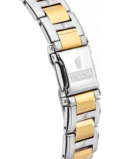 Женские кварцевые часы-хронографХронографФункция позволяет измерять отрезки времени с особой точностью: часы, минуты, секунды. Верным признаком хронографа является наличие на циферблате 3 дополнительных окошек-счётчиков. с секундомеромСекундомерСекундоме́р — прибор, способный измерять интервалы времени с точностью до долей секунды. Festina Boyfriend F20402/1, кварцевый механизм с высокой точностью. Минеральное стеклоМинеральное стеклоМинеральное стекло представляет собой искусственно выращенный минерал кварца. Такое стекло отличается особой устойчивостью к повреждениям и царапинам. Уступает по некоторым качествам сапфировому стеклу. устойчивое к мелким механическим повреждениям. Класс водозащиты: 50 метров, позволит защитить корпус от случайных брызг или капель дождя. Стрелки с люминесцентным покрытиемЛюминесцентное покрытиеПозволяет считывать показания времени в темноте. Производители наносят на стрелки, часовые индексы, безель или поверхность циферблата светонакопительный состав, дающий холодное свечение..