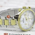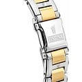 Корпус из нержавеющей стали. Браслет из стали с частичным PVDPVDУльтратонкое покрытие наносится в технике вакуумного напыления, сочетает в себе нитрид титана особой прочности со слоем золота или оксида хрома. Несёт в себе декоративную или защитную функцию. покрытием. Браслет на раскладной застёжкеРаскладная застёжкаТакой тип застёжки используется только на браслетах из металла. Она никогда не раскрывается полностью, происходит разделение на 2 и более частей. Раскладывающая застёжка снизит вероятность потери часов к минимуму.. БезельБезельВнешний ободок, закрепляющий стекло. В спортивных часах так называется поворотное кольцо с делениями на циферблате, выполняет роль таймера – замеряет отрезки времени на шкале. Неподвижный безель – элемент декора. Однонаправленно вращающийся безель на дайверских часах позволяет фиксировать моменты погружения и выныривания на поверхность. и циферблат инкрустированы кристаллами. Рифленая заводная головка.