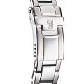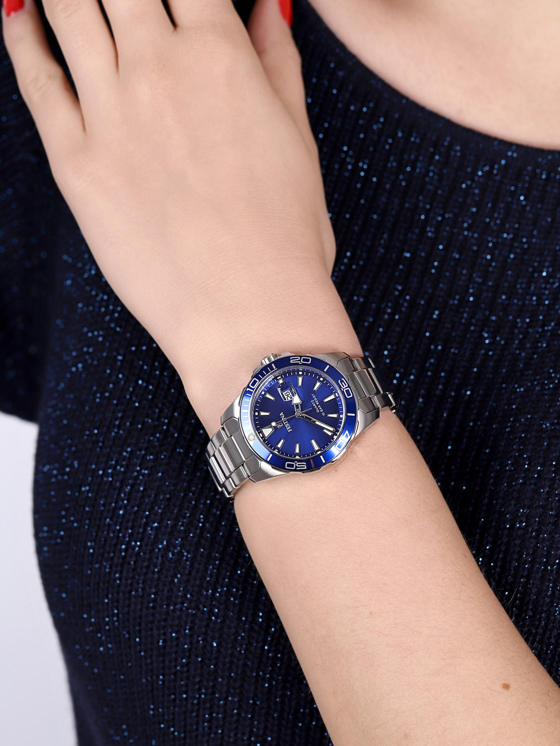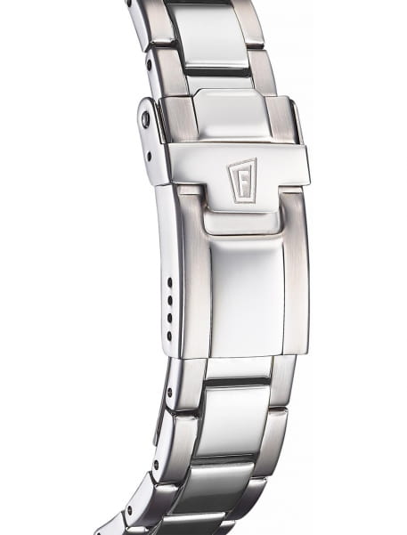 Кварцевый механизм с высокой точностью. Минеральное стеклоМинеральное стеклоМинеральное стекло представляет собой искусственно выращенный минерал кварца. Такое стекло отличается особой устойчивостью к повреждениям и царапинам. Уступает по некоторым качествам сапфировому стеклу. устойчивое к появлению царапин, обладающее высокой прозрачностью. Стрелки и метки с люминесцентным покрытиемЛюминесцентное покрытиеПозволяет считывать показания времени в темноте. Производители наносят на стрелки, часовые индексы, безель или поверхность циферблата светонакопительный состав, дающий холодное свечение.. Окошко даты с увеличительным стеклом. Класс водозащиты: 100 метров, позволит плавать, нырять и заниматься другими водными видами спорта. Поворотный безельБезельВнешний ободок, закрепляющий стекло. В спортивных часах так называется поворотное кольцо с делениями на циферблате, выполняет роль таймера – замеряет отрезки времени на шкале. Неподвижный безель – элемент декора. Однонаправленно вращающийся безель на дайверских часах позволяет фиксировать моменты погружения и выныривания на поверхность.с PVDPVDУльтратонкое покрытие наносится в технике вакуумного напыления, сочетает в себе нитрид титана особой прочности со слоем золота или оксида хрома. Несёт в себе декоративную или защитную функцию. покрытием. Корпус часов изготовлен из нержавеющей стали. Браслет с раскладной застёжкойРаскладная застёжкаТакой тип застёжки используется только на браслетах из металла. Она никогда не раскрывается полностью, происходит разделение на 2 и более частей. Раскладывающая застёжка снизит вероятность потери часов к минимуму.. Застежка с системой блокировки.