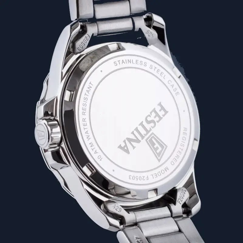 Наручные часы Festina F20503/6 — это стильный аксессуар, сочетающий в себе элегантный дизайн и современные технологии. Кварцевый механизм обеспечивает высокую точность хода, не требуя частой подзаводки. Минеральное стеклоМинеральное стеклоМинеральное стекло представляет собой искусственно выращенный минерал кварца. Такое стекло отличается особой устойчивостью к повреждениям и царапинам. Уступает по некоторым качествам сапфировому стеклу. защищает циферблат от царапин и отличается отличной прозрачностью. Стрелки с люминесцентным покрытиемЛюминесцентное покрытиеПозволяет считывать показания времени в темноте. Производители наносят на стрелки, часовые индексы, безель или поверхность циферблата светонакопительный состав, дающий холодное свечение. позволяют легко считывать время даже в темноте. Циферблат украшен сияющими фианитами, придающими часам изысканный вид. Окошко даты выделяется увеличительным стеклом, что облегчает чтение информации. Водозащита до 100 метров позволяет плавать и заниматься спортом. Поворотный безельБезельВнешний ободок, закрепляющий стекло. В спортивных часах так называется поворотное кольцо с делениями на циферблате, выполняет роль таймера – замеряет отрезки времени на шкале. Неподвижный безель – элемент декора. Однонаправленно вращающийся безель на дайверских часах позволяет фиксировать моменты погружения и выныривания на поверхность. и корпус из нержавеющей стали обеспечивают долговечность. Браслет с раскладной застёжкойРаскладная застёжкаТакой тип застёжки используется только на браслетах из металла. Она никогда не раскрывается полностью, происходит разделение на 2 и более частей. Раскладывающая застёжка снизит вероятность потери часов к минимуму. и системой блокировки гарантирует удобство и безопасность при ношении.
