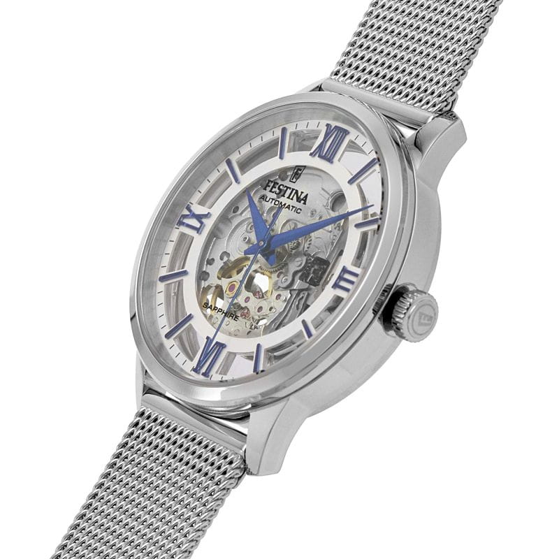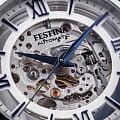 Мужские механические часы-скелетоны Festina Automatic F20534/1, механический механизм (автоматический калибр) с высокой точностью. Сапфировое стеклоСапфировое стеклоПрочный и надёжный материал из кристалла сапфира синтетического происхождения, характеризующийся особой твёрдостью и устойчивостью к царапинам и повреждениям. устойчивое к появлению царапин, обладающее высокой прозрачностью. Класс водозащиты: 50 метров, позволит защитить корпус от случайных брызг или капель дождя. Корпус часов изготовлен из стали. Стальной браслет на раскладной застёжкеРаскладная застёжкаТакой тип застёжки используется только на браслетах из металла. Она никогда не раскрывается полностью, происходит разделение на 2 и более частей. Раскладывающая застёжка снизит вероятность потери часов к минимуму.. В механизме 21 камень. Циферблат с метками в виде штрихов и римских цифр.