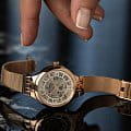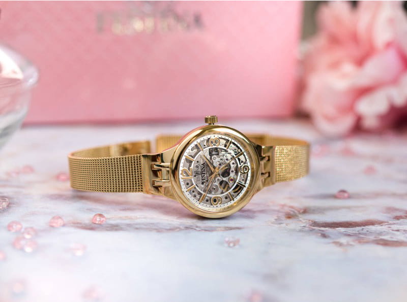 Женские механические часы-скелетоны Festina Automatic F20580/1, механический механизм (автоматический калибр) с высокой точностью. Сапфировое стеклоСапфировое стеклоПрочный и надёжный материал из кристалла сапфира синтетического происхождения, характеризующийся особой твёрдостью и устойчивостью к царапинам и повреждениям. устойчивое к появлению царапин, обладающее высокой прозрачностью. Класс водозащиты: 50 метров, позволит защитить корпус от случайных брызг или капель дождя. Корпус часов изготовлен из стали с PVD-покрытиемPVDУльтратонкое покрытие наносится в технике вакуумного напыления, сочетает в себе нитрид титана особой прочности со слоем золота или оксида хрома. Несёт в себе декоративную или защитную функцию.. Стальной миланского плетения браслет на раскладной застёжкеРаскладная застёжкаТакой тип застёжки используется только на браслетах из металла. Она никогда не раскрывается полностью, происходит разделение на 2 и более частей. Раскладывающая застёжка снизит вероятность потери часов к минимуму. с PVD-покрытиемPVDУльтратонкое покрытие наносится в технике вакуумного напыления, сочетает в себе нитрид титана особой прочности со слоем золота или оксида хрома. Несёт в себе декоративную или защитную функцию.. БезельБезельВнешний ободок, закрепляющий стекло. В спортивных часах так называется поворотное кольцо с делениями на циферблате, выполняет роль таймера – замеряет отрезки времени на шкале. Неподвижный безель – элемент декора. Однонаправленно вращающийся безель на дайверских часах позволяет фиксировать моменты погружения и выныривания на поверхность. с PVD-покрытиемPVDУльтратонкое покрытие наносится в технике вакуумного напыления, сочетает в себе нитрид титана особой прочности со слоем золота или оксида хрома. Несёт в себе декоративную или защитную функцию.. Циферблат с метками в виде штрихов и арабских цифр. Рифленая заводная головка.