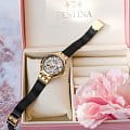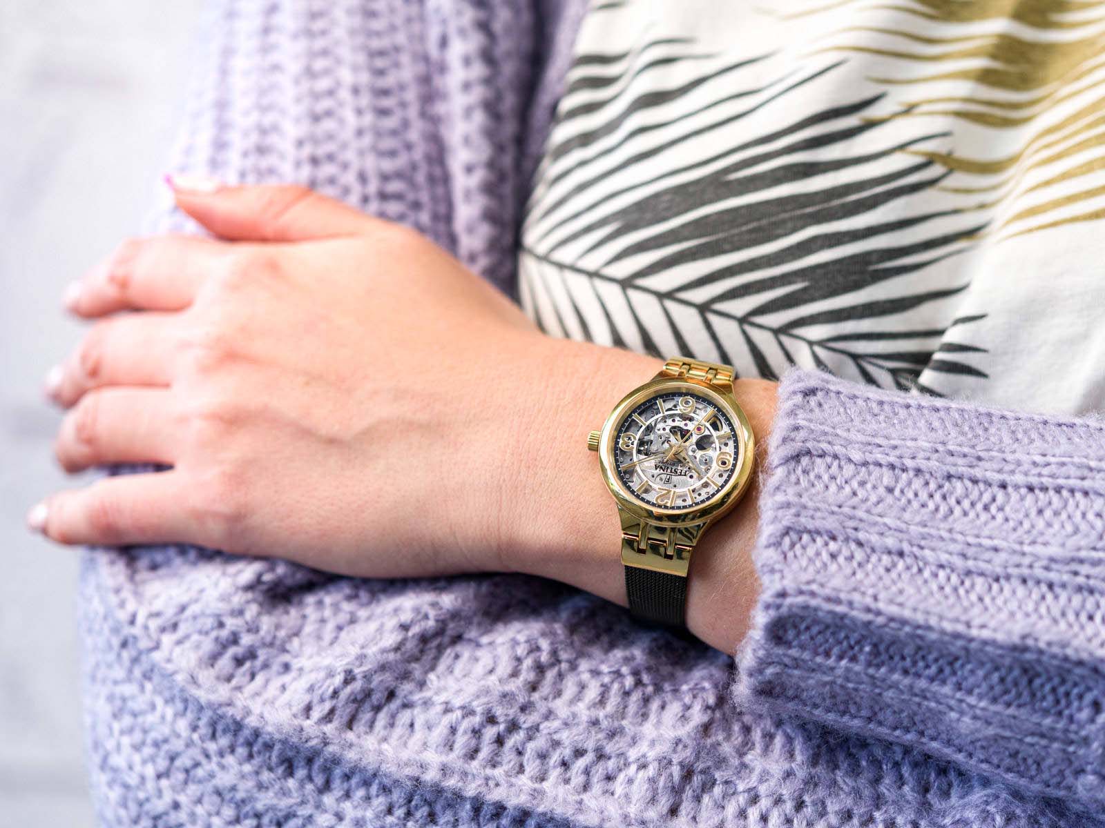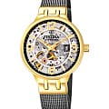 Женские механические часы-скелетоны Festina Automatic F20580/2, механический механизм (автоматический калибр) с высокой точностью. Сапфировое стеклоСапфировое стеклоПрочный и надёжный материал из кристалла сапфира синтетического происхождения, характеризующийся особой твёрдостью и устойчивостью к царапинам и повреждениям. устойчивое к появлению царапин, обладающее высокой прозрачностью. Класс водозащиты: 50 метров, позволит защитить корпус от случайных брызг или капель дождя. Корпус часов изготовлен из стали с PVD-покрытиемPVDУльтратонкое покрытие наносится в технике вакуумного напыления, сочетает в себе нитрид титана особой прочности со слоем золота или оксида хрома. Несёт в себе декоративную или защитную функцию.. Стальной миланского плетения браслет на раскладной застёжкеРаскладная застёжкаТакой тип застёжки используется только на браслетах из металла. Она никогда не раскрывается полностью, происходит разделение на 2 и более частей. Раскладывающая застёжка снизит вероятность потери часов к минимуму. с PVD-покрытиемPVDУльтратонкое покрытие наносится в технике вакуумного напыления, сочетает в себе нитрид титана особой прочности со слоем золота или оксида хрома. Несёт в себе декоративную или защитную функцию.. БезельБезельВнешний ободок, закрепляющий стекло. В спортивных часах так называется поворотное кольцо с делениями на циферблате, выполняет роль таймера – замеряет отрезки времени на шкале. Неподвижный безель – элемент декора. Однонаправленно вращающийся безель на дайверских часах позволяет фиксировать моменты погружения и выныривания на поверхность. с PVD-покрытиемPVDУльтратонкое покрытие наносится в технике вакуумного напыления, сочетает в себе нитрид титана особой прочности со слоем золота или оксида хрома. Несёт в себе декоративную или защитную функцию.. Циферблат с метками в виде штрихов и арабских цифр. Рифленая заводная головка.