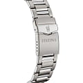 Титановые наручные часы Festina Titanium F20698/2 имеют кварцевый механизм с высокой точностью. Минеральное стеклоМинеральное стеклоМинеральное стекло представляет собой искусственно выращенный минерал кварца. Такое стекло отличается особой устойчивостью к повреждениям и царапинам. Уступает по некоторым качествам сапфировому стеклу. устойчивое к появлению царапин, обладающее высокой прозрачностью, защищает синий циферблат. БезельБезельВнешний ободок, закрепляющий стекло. В спортивных часах так называется поворотное кольцо с делениями на циферблате, выполняет роль таймера – замеряет отрезки времени на шкале. Неподвижный безель – элемент декора. Однонаправленно вращающийся безель на дайверских часах позволяет фиксировать моменты погружения и выныривания на поверхность. с часовыми метками выполнен из нержавеющей стали с синим PVDPVDУльтратонкое покрытие наносится в технике вакуумного напыления, сочетает в себе нитрид титана особой прочности со слоем золота или оксида хрома. Несёт в себе декоративную или защитную функцию. покрытием. Класс водозащиты: 100 метров, позволит плавать, нырять и заниматься другими водными видами спорта. Корпус часов изготовлен из титана, браслет также изготовлен из титана и имеет раскладную застёжкуРаскладная застёжкаТакой тип застёжки используется только на браслетах из металла. Она никогда не раскрывается полностью, происходит разделение на 2 и более частей. Раскладывающая застёжка снизит вероятность потери часов к минимуму.. Люминесцентное покрытиеЛюминесцентное покрытиеПозволяет считывать показания времени в темноте. Производители наносят на стрелки, часовые индексы, безель или поверхность циферблата светонакопительный состав, дающий холодное свечение. на стрелках и метках обеспечивает отличную видимость в темноте, а окошко даты с днем недели, расположенное в позиции 3 часа, добавляет практичности.
