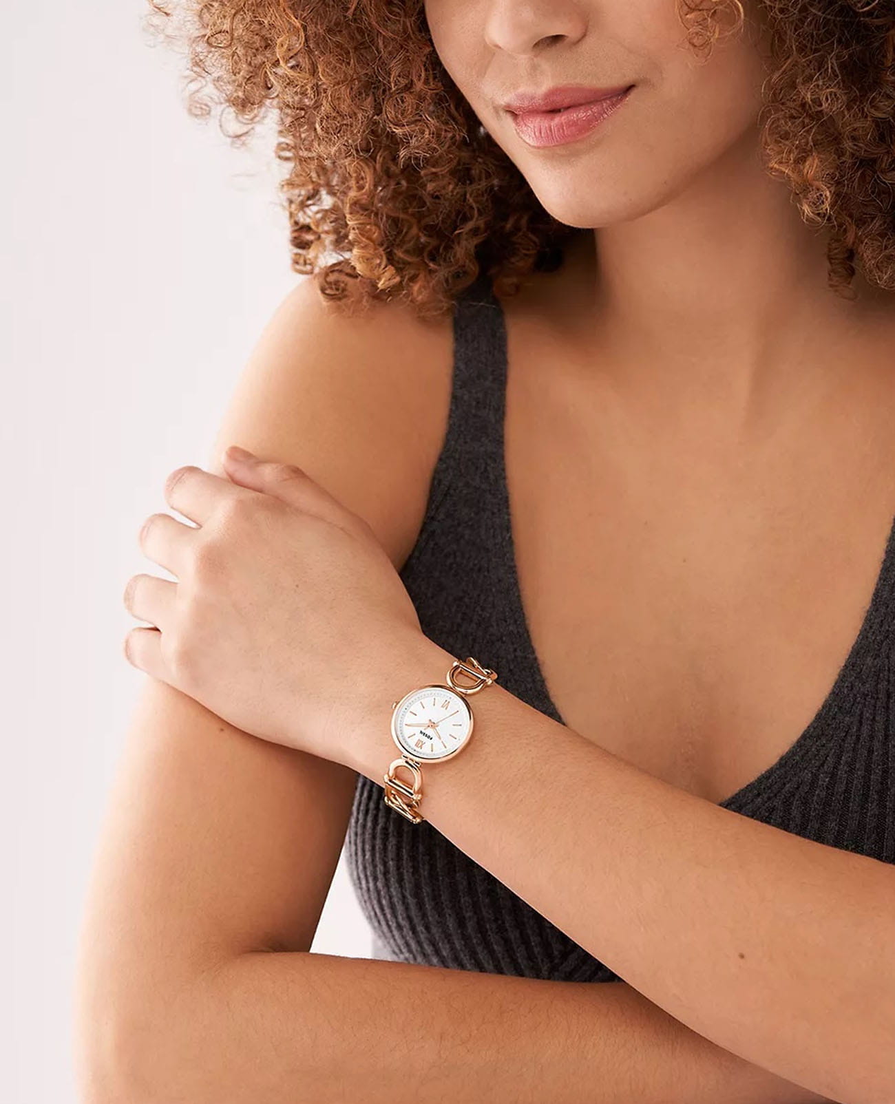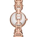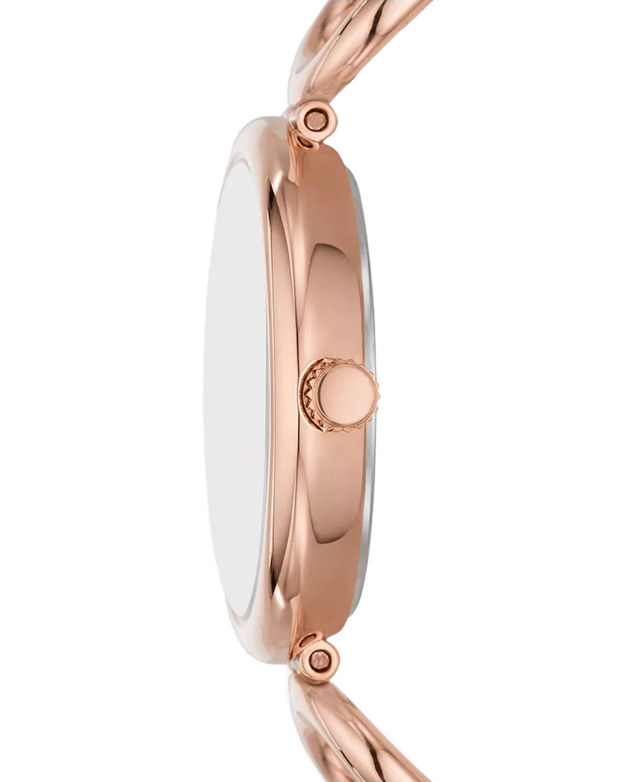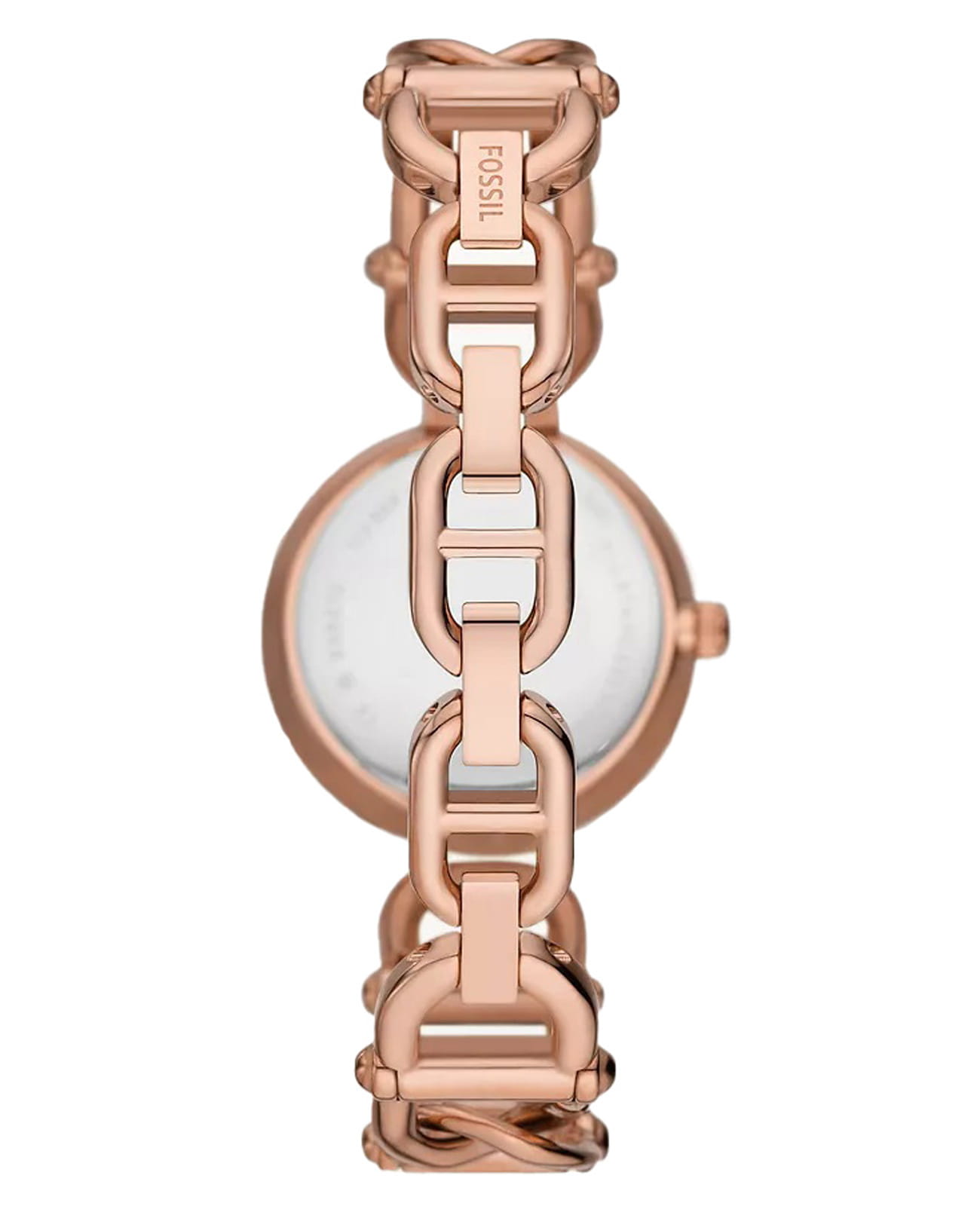 Женские американские часы с минеральным стекломМинеральное стеклоМинеральное стекло представляет собой искусственно выращенный минерал кварца. Такое стекло отличается особой устойчивостью к повреждениям и царапинам. Уступает по некоторым качествам сапфировому стеклу. Fossil Carlie ES5273, кварцевый механизм с высокой точностью. Корпус и браслет часов изготовлены из нержавеющей стали с IP-покрытиемIP-покрытиеМетод ионного напыления. Демонстрирует повышенную устойчивость к истиранию, окислению и химическим веществам. Под воздействием высокого давления и температуры около 1500°C молекулы металла надёжно соединяются с частицами корпуса часов.. Стрелки с люминесцентным покрытиемЛюминесцентное покрытиеПозволяет считывать показания времени в темноте. Производители наносят на стрелки, часовые индексы, безель или поверхность циферблата светонакопительный состав, дающий холодное свечение.. Рифленая заводная головка с защитой. Класс водозащиты: 50 метров, позволит защитить корпус от случайных брызг или капель дождя. Стальной браслет в виде звеньев на ювелирной застежке.
