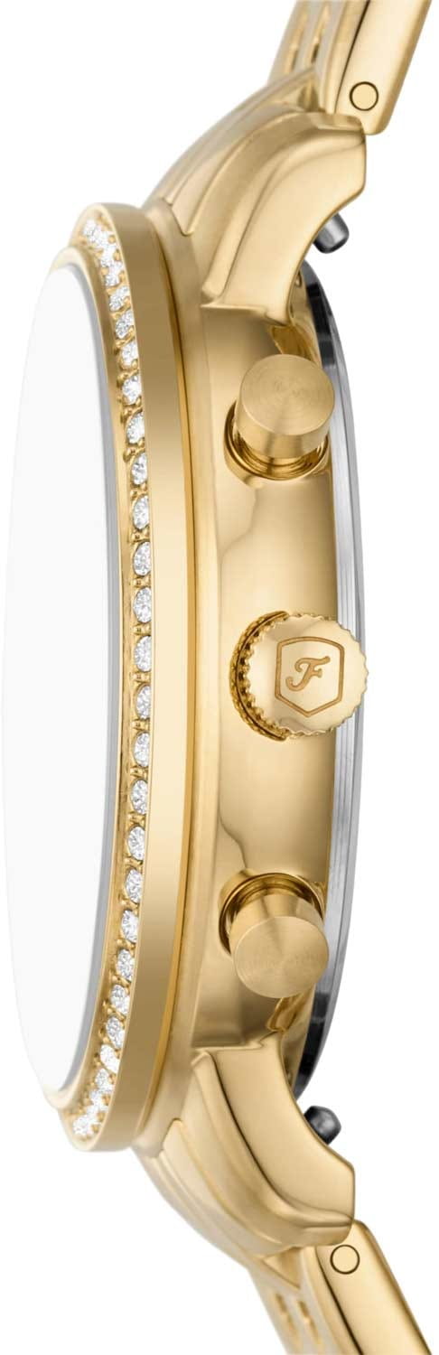 Fossil ES5358 – это изысканные женские часы-хронографХронографФункция позволяет измерять отрезки времени с особой точностью: часы, минуты, секунды. Верным признаком хронографа является наличие на циферблате 3 дополнительных окошек-счётчиков. с секундомеромСекундомерСекундоме́р — прибор, способный измерять интервалы времени с точностью до долей секунды., которые станут идеальным дополнением к вашему стилю, предлагая баланс между функциональностью и эстетикой. Эти часы изготовлены в США и оснащены надежным кварцевым механизмом, что обеспечивает точность и долговечность. Корпус часов выполнен из прочной стали с золотистым IP-покрытиемIP-покрытиеМетод ионного напыления. Демонстрирует повышенную устойчивость к истиранию, окислению и химическим веществам. Под воздействием высокого давления и температуры около 1500°C молекулы металла надёжно соединяются с частицами корпуса часов., а безельБезельВнешний ободок, закрепляющий стекло. В спортивных часах так называется поворотное кольцо с делениями на циферблате, выполняет роль таймера – замеряет отрезки времени на шкале. Неподвижный безель – элемент декора. Однонаправленно вращающийся безель на дайверских часах позволяет фиксировать моменты погружения и выныривания на поверхность. дополнен кристаллами, добавляя блеска и шарма. Белый перламутровый циферблат гармонично сочетается с маркировкой в виде штрихов и римскими цифрами VI и XII, придавая часам классический вид. Окошко даты, расположенное между отметками 4 и 5 часов, добавляет удобства в повседневном использовании. Часы обладают водозащитой 50WR, что позволяет не беспокоиться о случайных попаданиях влаги. Минеральное стеклоМинеральное стеклоМинеральное стекло представляет собой искусственно выращенный минерал кварца. Такое стекло отличается особой устойчивостью к повреждениям и царапинам. Уступает по некоторым качествам сапфировому стеклу. защищает циферблат от царапин и повреждений. Стрелки с люминесцентным покрытиемЛюминесцентное покрытиеПозволяет считывать показания времени в темноте. Производители наносят на стрелки, часовые индексы, безель или поверхность циферблата светонакопительный состав, дающий холодное свечение. позволяют легко считывать время даже в условиях низкой освещенности. Стальной браслет с золотистым IP-покрытиемIP-покрытиеМетод ионного напыления. Демонстрирует повышенную устойчивость к истиранию, окислению и химическим веществам. Под воздействием высокого давления и температуры около 1500°C молекулы металла надёжно соединяются с частицами корпуса часов. и раскладной застёжкойРаскладная застёжкаТакой тип застёжки используется только на браслетах из металла. Она никогда не раскрывается полностью, происходит разделение на 2 и более частей. Раскладывающая застёжка снизит вероятность потери часов к минимуму. обеспечивает комфортное ношение и надежную фиксацию на запястье, с габаритными размерами 36 мм в диаметре, шириной браслета 16 мм и длиной 175 мм. Эти часы — прекрасный выбор для тех, кто ценит стиль и качество в каждом элементе аксессуара.