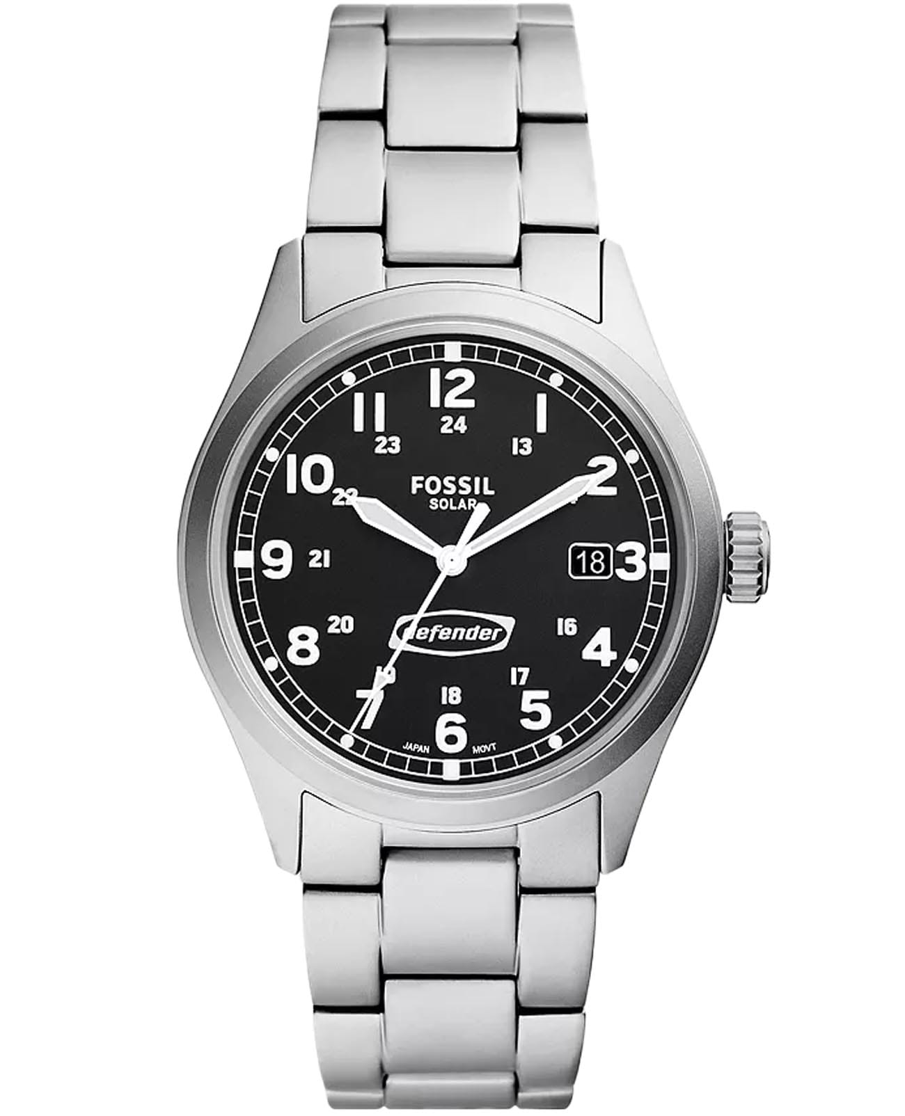 Мужские наручные часы Fossil Defender FS5973 с солнечной батарейкой. Корпус и браслет часов изготовлены из нержавеющей стали. Минеральное стеклоМинеральное стеклоМинеральное стекло представляет собой искусственно выращенный минерал кварца. Такое стекло отличается особой устойчивостью к повреждениям и царапинам. Уступает по некоторым качествам сапфировому стеклу. устойчивое к мелким механическим повреждениям. Стальной браслет на раскладной застёжкеРаскладная застёжкаТакой тип застёжки используется только на браслетах из металла. Она никогда не раскрывается полностью, происходит разделение на 2 и более частей. Раскладывающая застёжка снизит вероятность потери часов к минимуму.. Класс водозащиты: 100 метров, позволит плавать, нырять и заниматься другими водными видами спорта. Окошко даты находится в положении 3 часа. Стрелки и метки с люминесцентным покрытиемЛюминесцентное покрытиеПозволяет считывать показания времени в темноте. Производители наносят на стрелки, часовые индексы, безель или поверхность циферблата светонакопительный состав, дающий холодное свечение..
