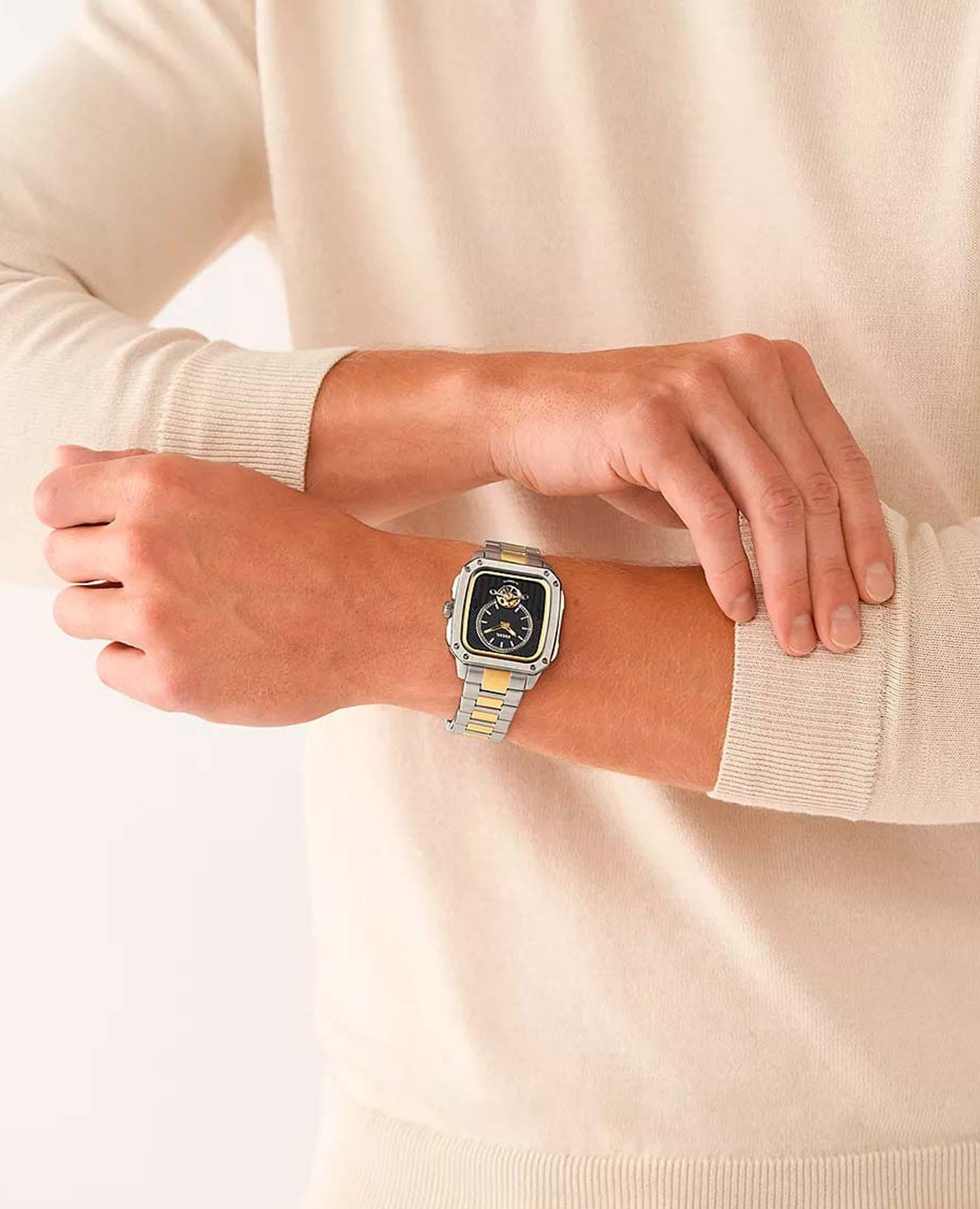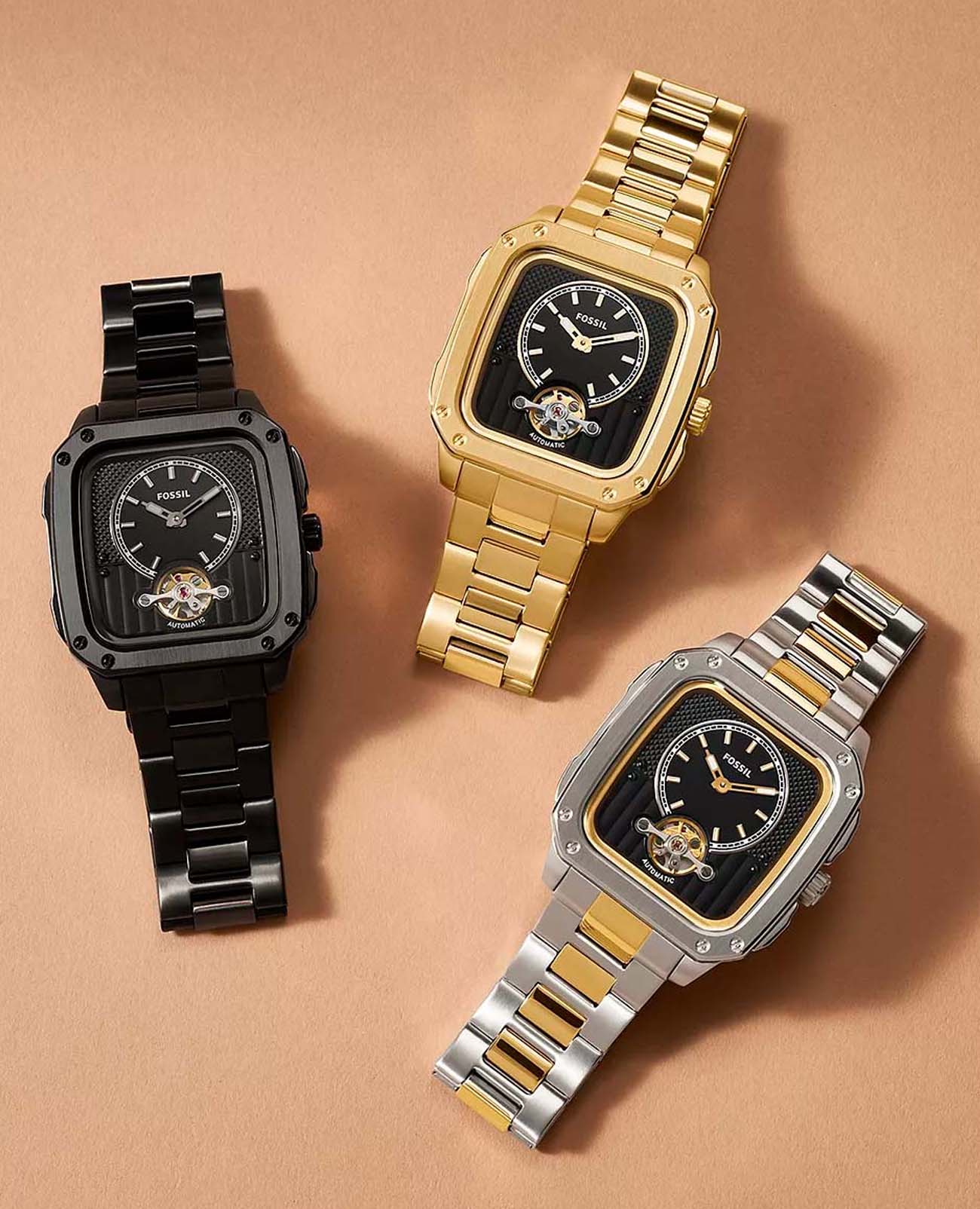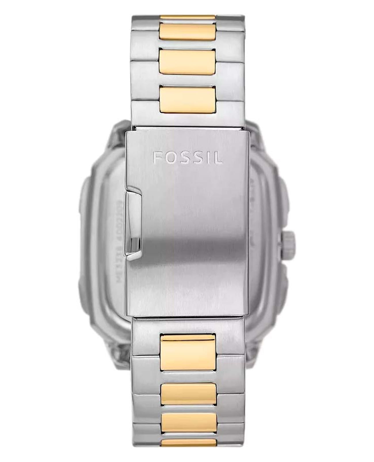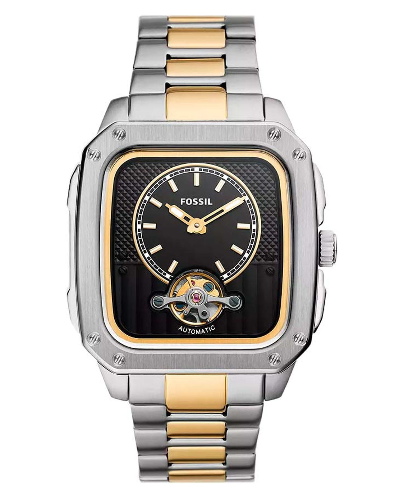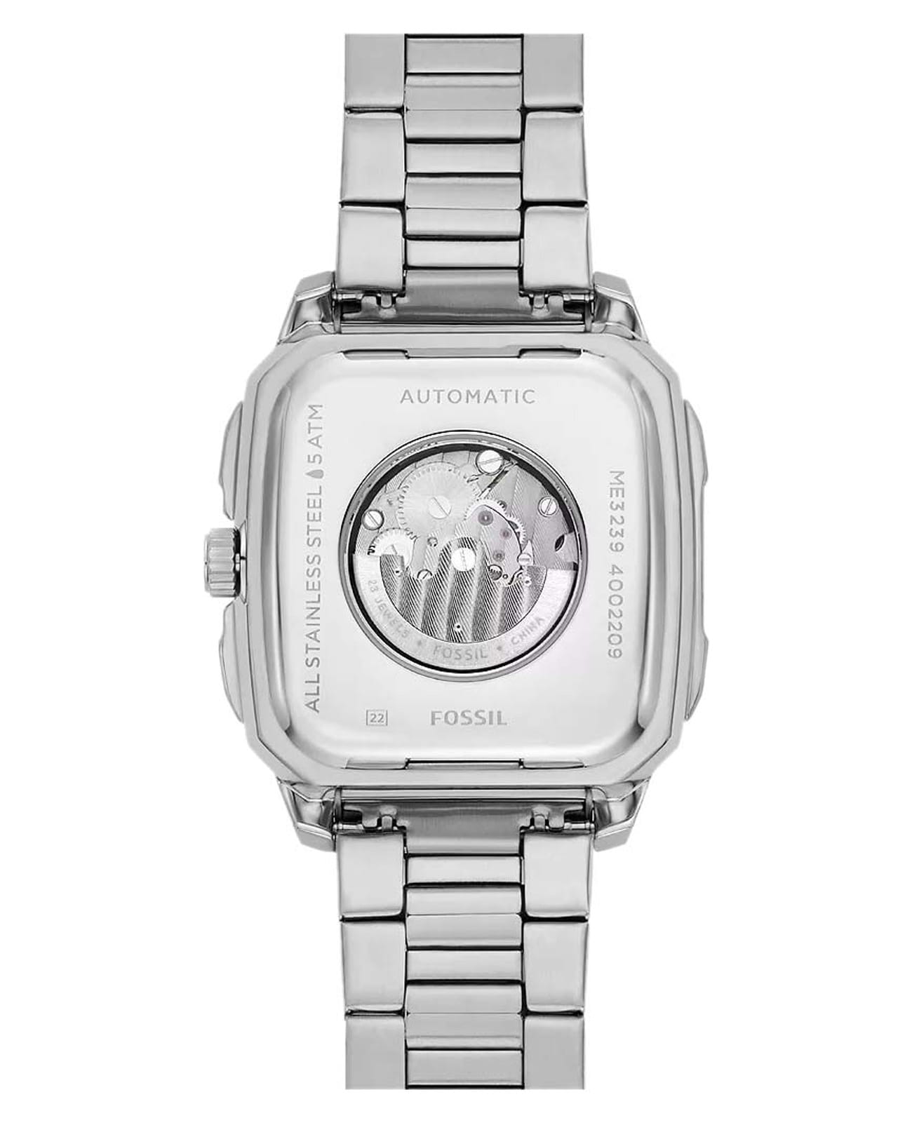 Мужские американские механические часы с автоподзаводом и с минеральным стекломМинеральное стеклоМинеральное стекло представляет собой искусственно выращенный минерал кварца. Такое стекло отличается особой устойчивостью к повреждениям и царапинам. Уступает по некоторым качествам сапфировому стеклу. Fossil Inscription ME3237, кварцевый механизм с высокой точностью. Прямоугольный корпус часов изготовлен из нержавеющей стали. БезельБезельВнешний ободок, закрепляющий стекло. В спортивных часах так называется поворотное кольцо с делениями на циферблате, выполняет роль таймера – замеряет отрезки времени на шкале. Неподвижный безель – элемент декора. Однонаправленно вращающийся безель на дайверских часах позволяет фиксировать моменты погружения и выныривания на поверхность. дополнен стильными винтами. Прозрачное окошко на текстурированном циферблате позволяет наблюдать за мерным ходом часового механизма. Метки в виде штрихов. Рифленая заводная головка. Метки и стрелки с люминесцентным покрытиемЛюминесцентное покрытиеПозволяет считывать показания времени в темноте. Производители наносят на стрелки, часовые индексы, безель или поверхность циферблата светонакопительный состав, дающий холодное свечение.. Рифленая заводная головка с защитой. Класс водозащиты: 50 метров, позволит защитить корпус от случайных брызг или капель дождя. Стальной браслет с частичным IP-покрытиемIP-покрытиеМетод ионного напыления. Демонстрирует повышенную устойчивость к истиранию, окислению и химическим веществам. Под воздействием высокого давления и температуры около 1500°C молекулы металла надёжно соединяются с частицами корпуса часов. на раскладной застёжкеРаскладная застёжкаТакой тип застёжки используется только на браслетах из металла. Она никогда не раскрывается полностью, происходит разделение на 2 и более частей. Раскладывающая застёжка снизит вероятность потери часов к минимуму..