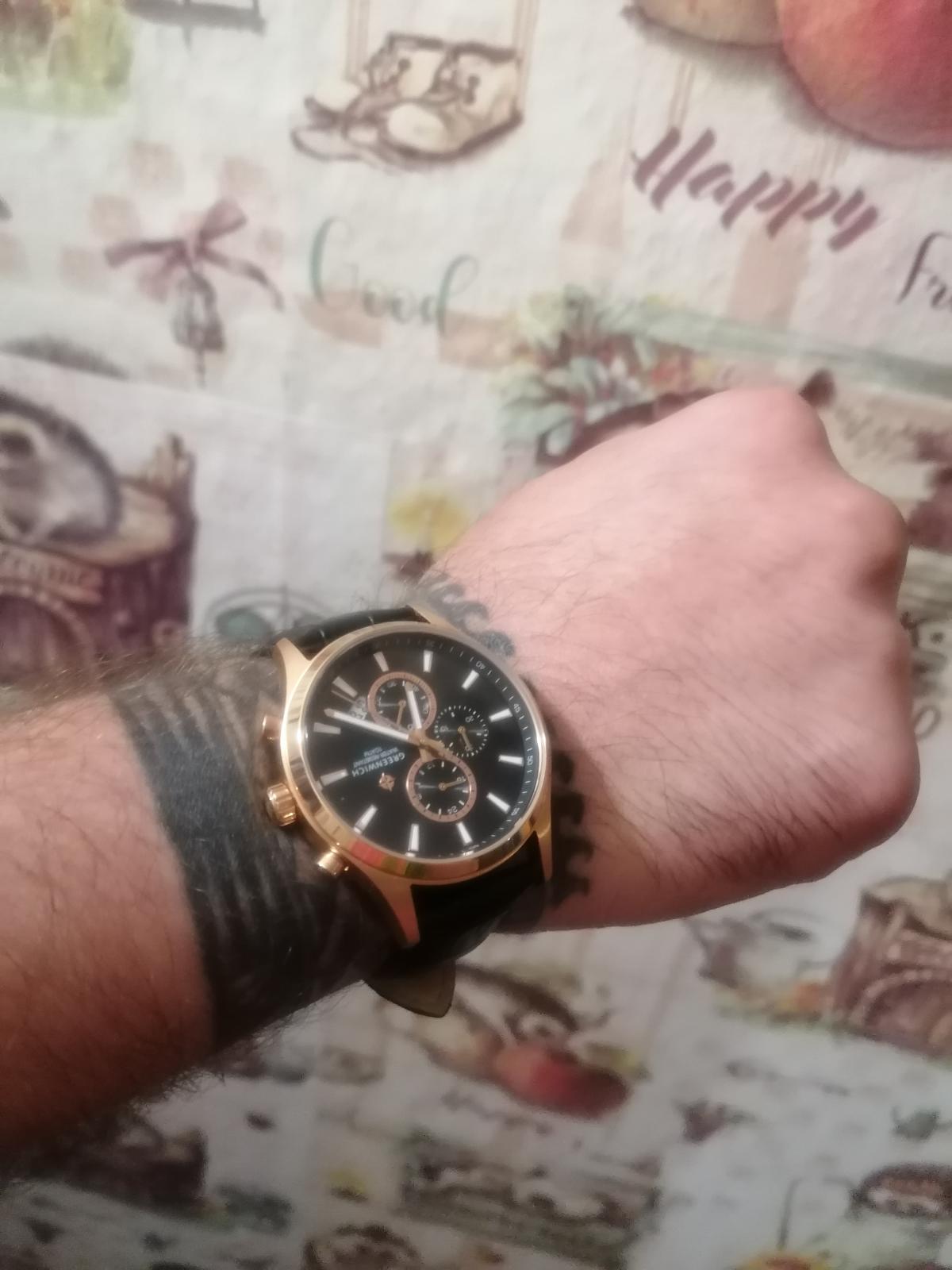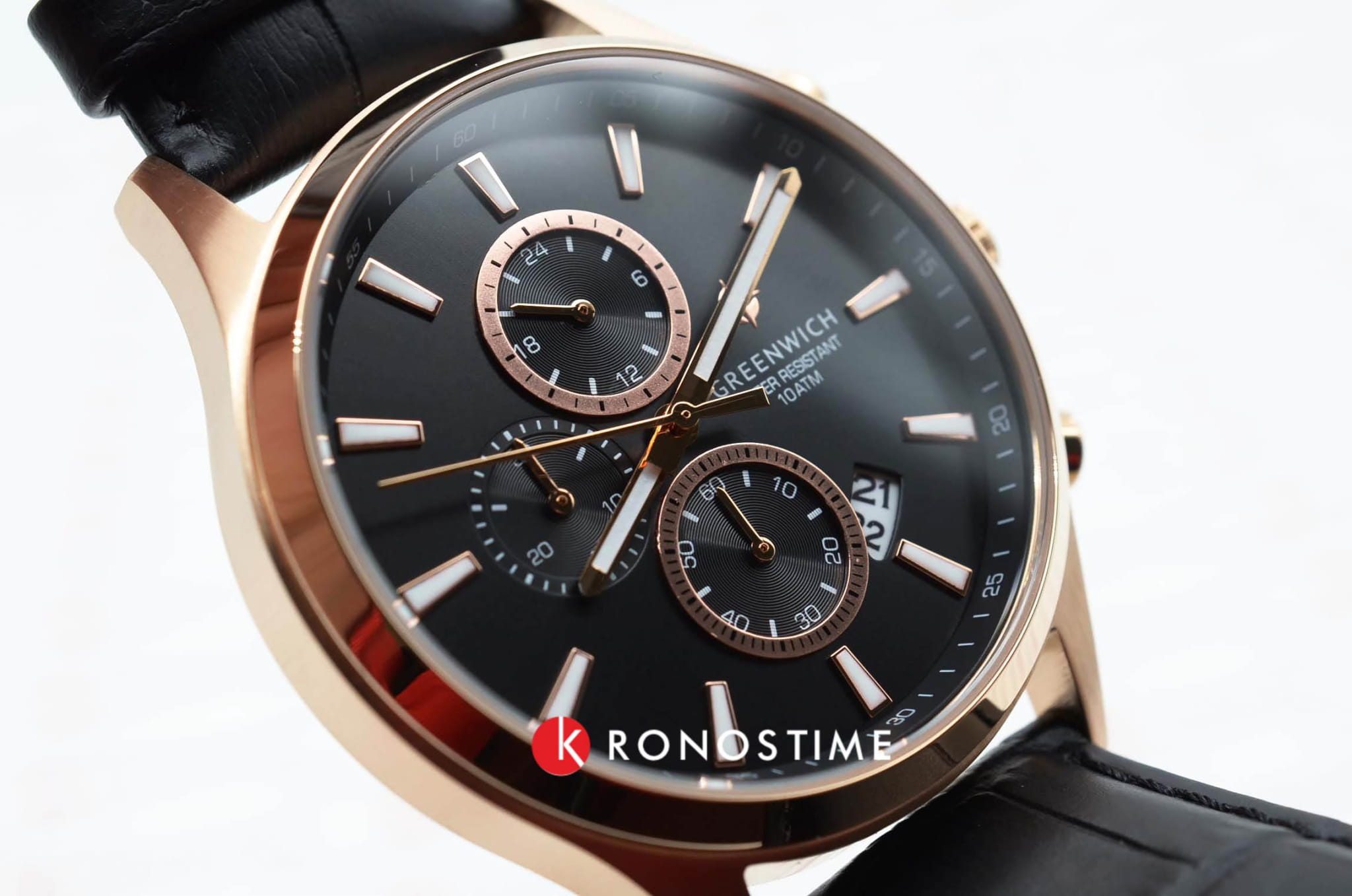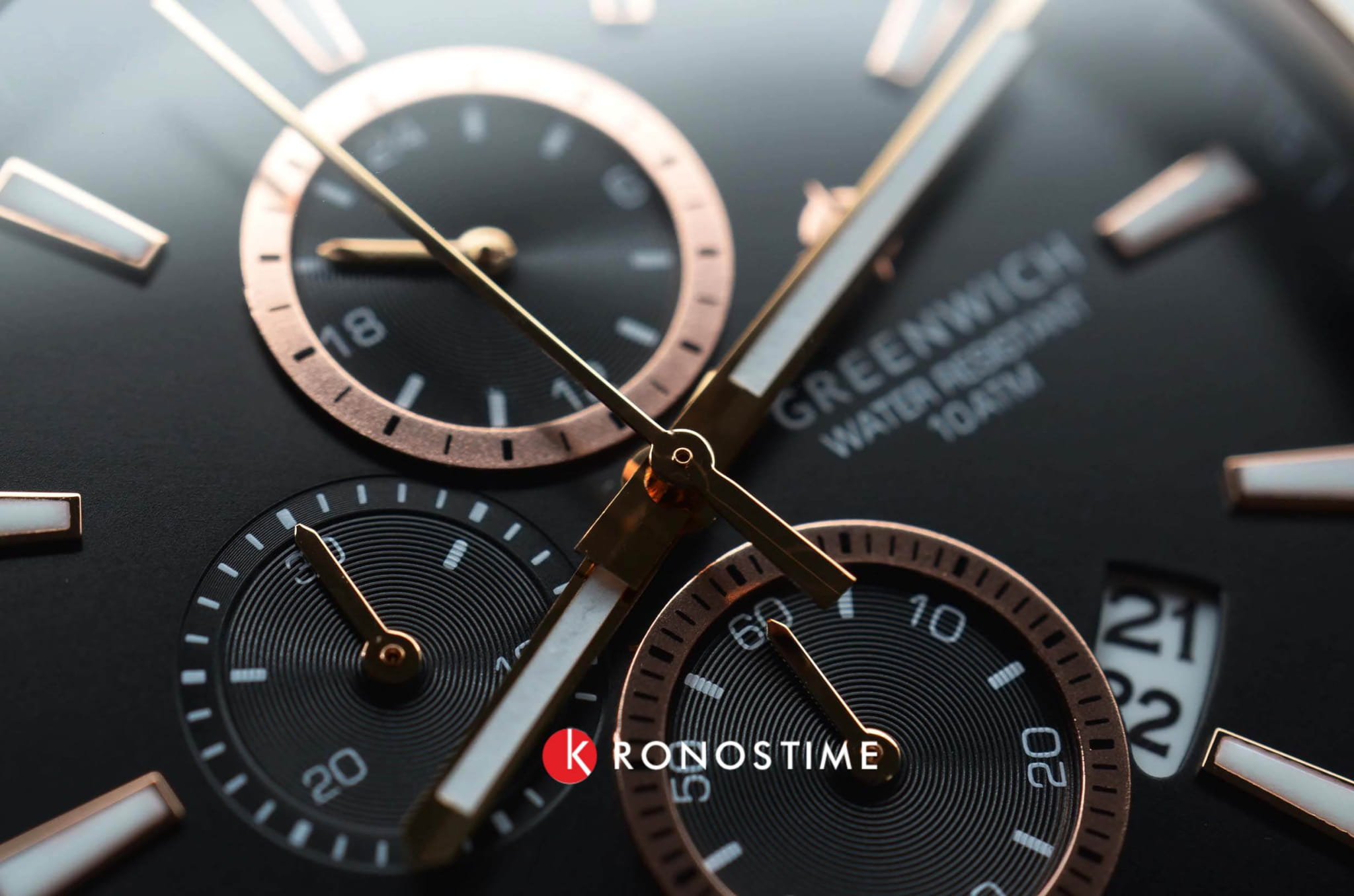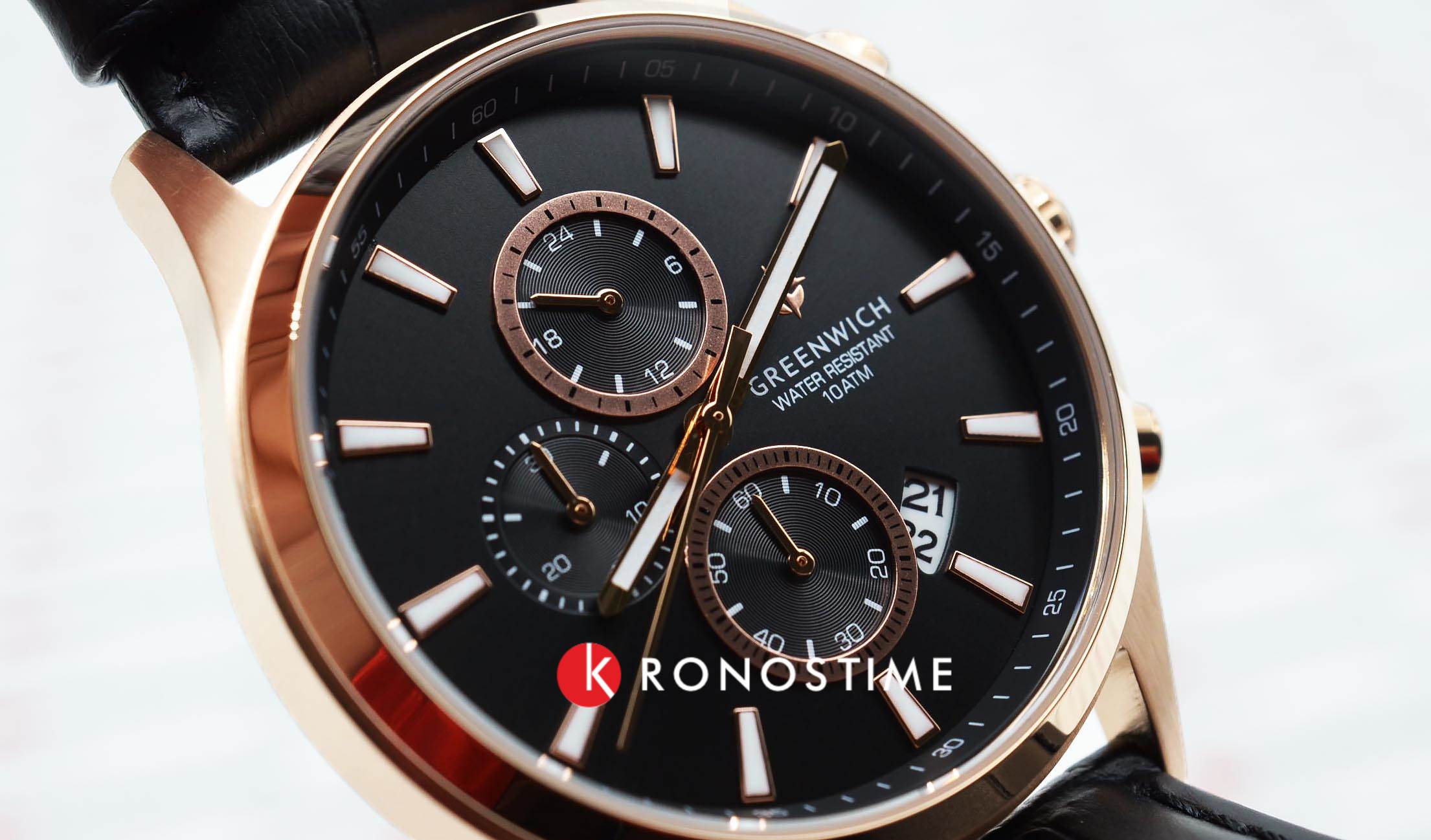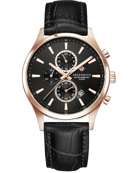Мужские английские часы c хронографомХронографФункция позволяет измерять отрезки времени с особой точностью: часы, минуты, секунды. Верным признаком хронографа является наличие на циферблате 3 дополнительных окошек-счётчиков. Greenwich Navigator GW 053.41.31, кварцевый механизм с высокой точностью. Класс водозащиты: 100 метров, позволит плавать, нырять и заниматься другими водными видами спорта. Корпус часов изготовлен из стали с PVD-покрытиемPVDУльтратонкое покрытие наносится в технике вакуумного напыления, сочетает в себе нитрид титана особой прочности со слоем золота или оксида хрома. Несёт в себе декоративную или защитную функцию.. Минеральное стеклоМинеральное стеклоМинеральное стекло представляет собой искусственно выращенный минерал кварца. Такое стекло отличается особой устойчивостью к повреждениям и царапинам. Уступает по некоторым качествам сапфировому стеклу. устойчивое к мелким механическим повреждениям. Стрелки и метки с люминесцентным покрытиемЛюминесцентное покрытиеПозволяет считывать показания времени в темноте. Производители наносят на стрелки, часовые индексы, безель или поверхность циферблата светонакопительный состав, дающий холодное свечение.. Кожаный ремешок на стандартной застёжке. СекундомерСекундомерСекундоме́р — прибор, способный измерять интервалы времени с точностью до долей секунды.. Окошко даты находится в положении между 4 и 5 часов.