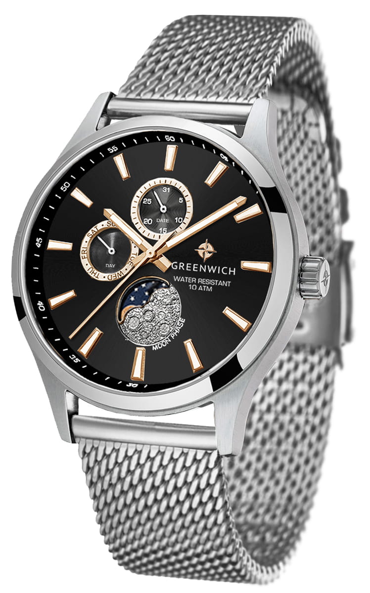 Мужские наручные часы Greenwich Moon Walker GW 058.19.35 представляют собой классический вариант для повседневной носки. Циферблат украшается брендовым логотипом, изображающим Розу Ветров. Эмблема мореплавательского духа символизирует удачу, стремление достигнуть поставленной цели. Часы характеризуются традиционными формами, лаконичным исполнением, что делает модель элегантным дополнением к деловому костюму. Надёжный корпус из нержавеющей стали спасает японский механизм от повреждений и ударов. Минеральное стеклоМинеральное стеклоМинеральное стекло представляет собой искусственно выращенный минерал кварца. Такое стекло отличается особой устойчивостью к повреждениям и царапинам. Уступает по некоторым качествам сапфировому стеклу. отличается устойчивостью к образованию царапин на поверхности. Стрелки и метки с люминесцентным покрытиемЛюминесцентное покрытиеПозволяет считывать показания времени в темноте. Производители наносят на стрелки, часовые индексы, безель или поверхность циферблата светонакопительный состав, дающий холодное свечение.. Лунный календарь находится в позиции 6 часов. Стальной браслет миланского плетения на раскладной застёжкеРаскладная застёжкаТакой тип застёжки используется только на браслетах из металла. Она никогда не раскрывается полностью, происходит разделение на 2 и более частей. Раскладывающая застёжка снизит вероятность потери часов к минимуму..
