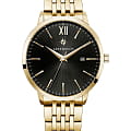 Мужские английские часы Greenwich GW 061.20.11 с минеральным стекломМинеральное стеклоМинеральное стекло представляет собой искусственно выращенный минерал кварца. Такое стекло отличается особой устойчивостью к повреждениям и царапинам. Уступает по некоторым качествам сапфировому стеклу.. Классические мужские часы серии Brig прекрасно подойдут как под костюм, так и под одежду направления casual. В часах установлен точный японский механизм Miyota. Корпус часов изготовлен из нержавеющей гипоаллергенной стали с PVDPVDУльтратонкое покрытие наносится в технике вакуумного напыления, сочетает в себе нитрид титана особой прочности со слоем золота или оксида хрома. Несёт в себе декоративную или защитную функцию. покрытием из желтого золота: он изящно смотрится на руке и не создает неудобств при контакте с одеждой с длинным рукавом. Размер корпуса 41 мм. Полировка на циферблате черного цвета выполнена в виде солнечных лучей. Индексы часов изготовлены вручную и закреплены на двух штифтах. Выпуклая форма рисок создает эффект игры солнечных бликов. Объемные часовая и минутная стрелки имеют мечеобразную форму. В модели представлена дополнительная функция – дата. Ее окошко расположено на уровне трех часов. Циферблат надежно защищен минеральным стеклом. Часы установлены на стальной браслет с надежной застежкой-клипсой. Логотип марки – изображение «розы ветров», символа удачи и новых открытий – расположен на циферблате, заводной головке и внутренней части бралета. Задняя крышка часов украшена изображениями логотипа и корабля, который является символом марки Greenwich.