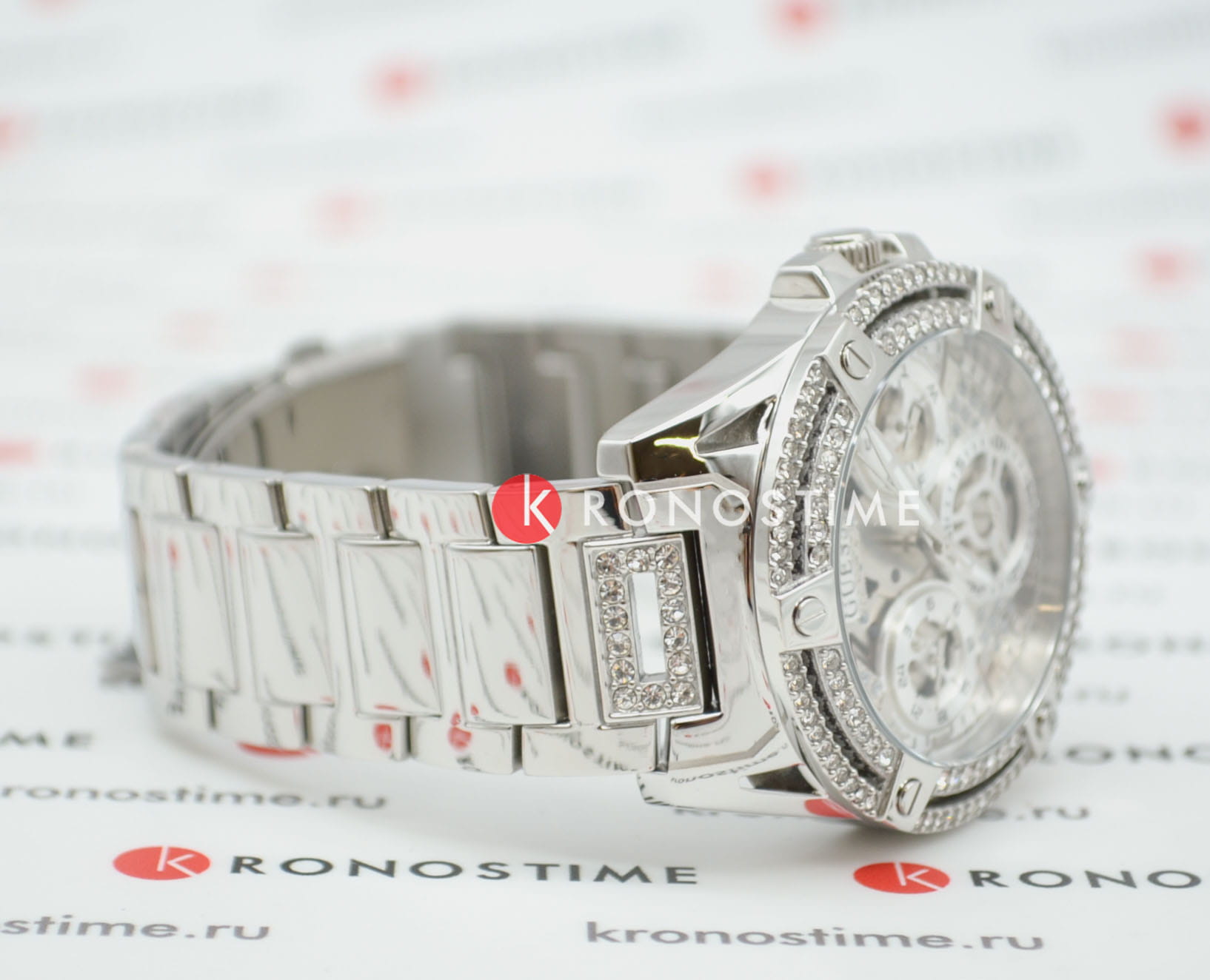 Женские наручные часы-скелетоны Guess Queen GW0464L1 с минеральным стекломМинеральное стеклоМинеральное стекло представляет собой искусственно выращенный минерал кварца. Такое стекло отличается особой устойчивостью к повреждениям и царапинам. Уступает по некоторым качествам сапфировому стеклу., кварцевый механизм с высокой точностью. Класс водозащиты: 30 метров, позволит защитить корпус от случайных брызг или капель дождя. Корпус часов изготовлен из стали. Браслет с раскладной застёжкойРаскладная застёжкаТакой тип застёжки используется только на браслетах из металла. Она никогда не раскрывается полностью, происходит разделение на 2 и более частей. Раскладывающая застёжка снизит вероятность потери часов к минимуму.. 12-ти и 24-х часовой формат времени, дата и день недели вынесены на отдельные циферблаты. Метки в виде штрихов. Рифленая заводная головка с защитой. Стрелки с люминесцентным покрытиемЛюминесцентное покрытиеПозволяет считывать показания времени в темноте. Производители наносят на стрелки, часовые индексы, безель или поверхность циферблата светонакопительный состав, дающий холодное свечение..