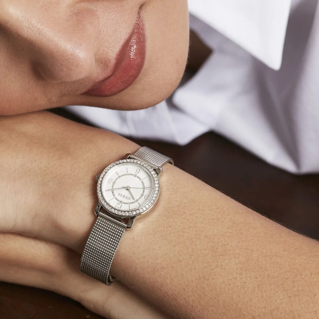 Женские наручные часы Guess Melody GW0534L1 с минеральным стекломМинеральное стеклоМинеральное стекло представляет собой искусственно выращенный минерал кварца. Такое стекло отличается особой устойчивостью к повреждениям и царапинам. Уступает по некоторым качествам сапфировому стеклу., кварцевый механизм с высокой точностью. Класс водозащиты: 30 метров, позволит защитить корпус от случайных брызг или капель дождя. Корпус часов изготовлен из стали. Браслет миланского плетения на раскладной застёжкеРаскладная застёжкаТакой тип застёжки используется только на браслетах из металла. Она никогда не раскрывается полностью, происходит разделение на 2 и более частей. Раскладывающая застёжка снизит вероятность потери часов к минимуму.. БезельБезельВнешний ободок, закрепляющий стекло. В спортивных часах так называется поворотное кольцо с делениями на циферблате, выполняет роль таймера – замеряет отрезки времени на шкале. Неподвижный безель – элемент декора. Однонаправленно вращающийся безель на дайверских часах позволяет фиксировать моменты погружения и выныривания на поверхность. инкрустирован кристаллами. Циферблат выполнен по технологии Sunray (солнечные лучи). Метки в виде штрихов и арабских цифр. Рифленая заводная головка.
