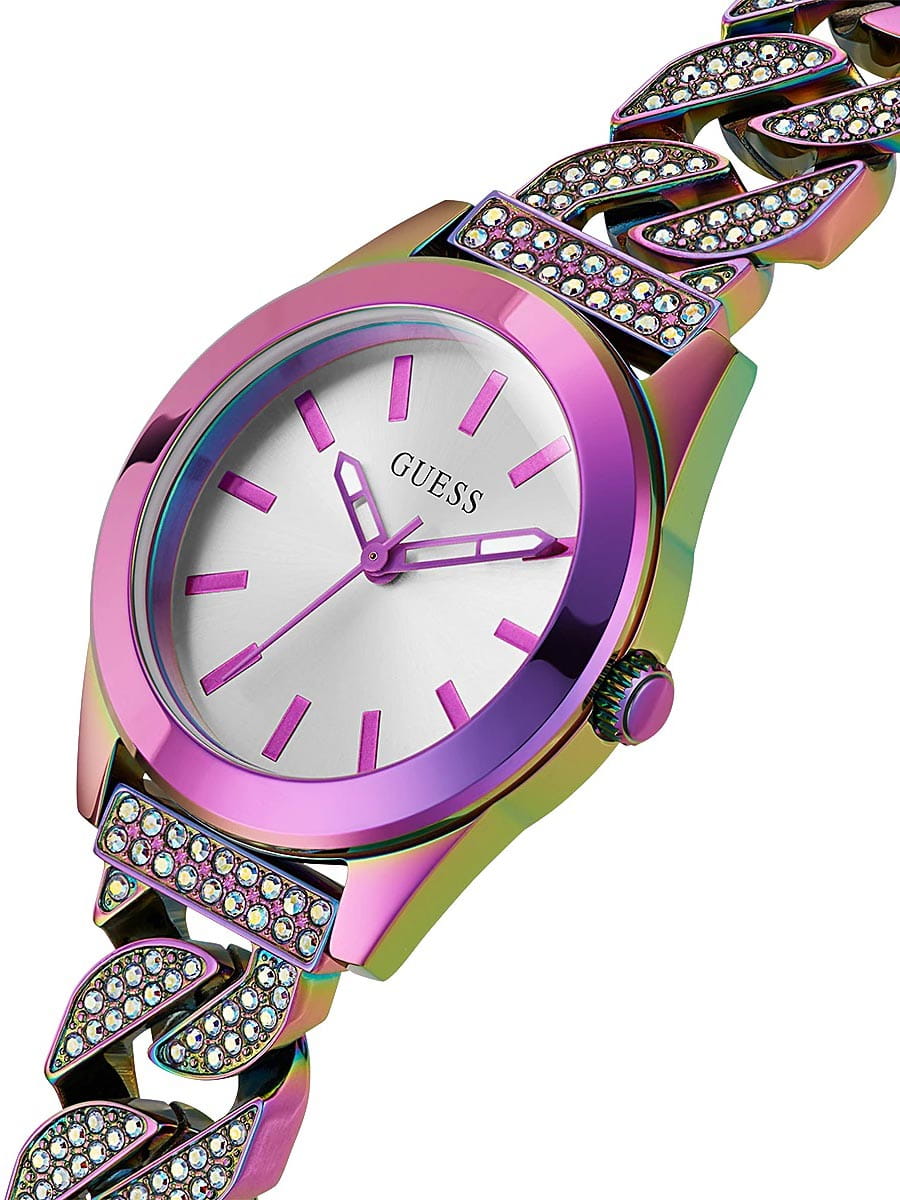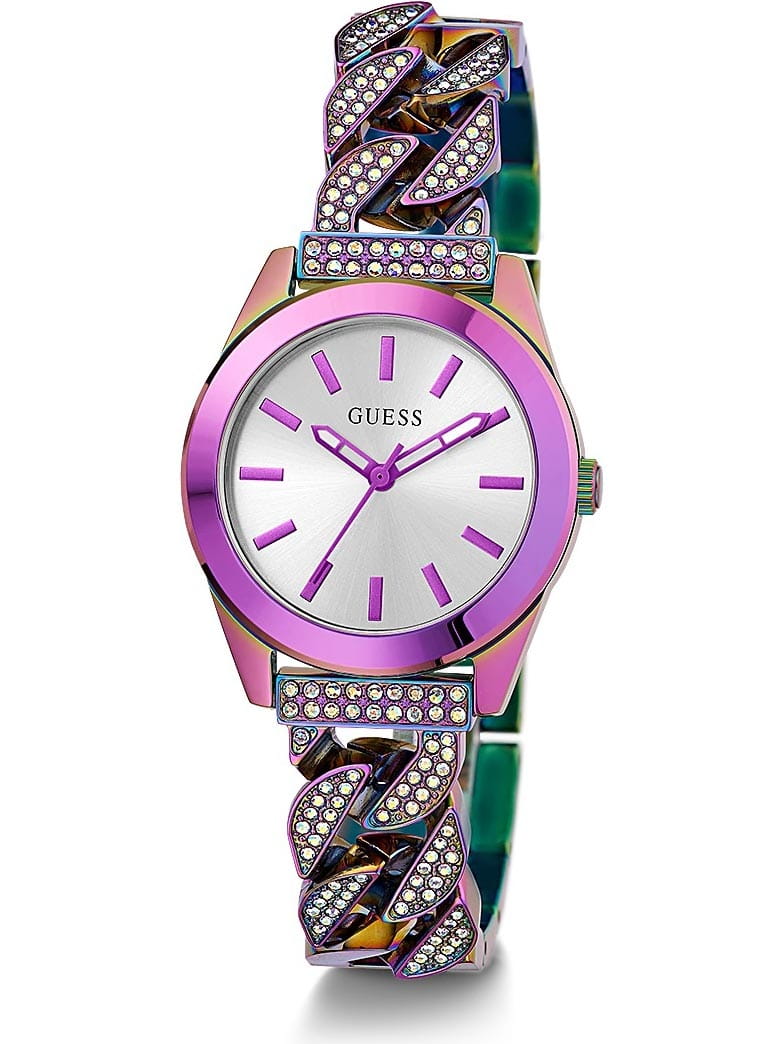 Мужские наручные часы Guess Trend GW0546L3 с минеральным стекломМинеральное стеклоМинеральное стекло представляет собой искусственно выращенный минерал кварца. Такое стекло отличается особой устойчивостью к повреждениям и царапинам. Уступает по некоторым качествам сапфировому стеклу., кварцевый механизм с высокой точностью. Класс водозащиты: 30 метров, позволит защитить корпус от случайных брызг или капель дождя. Стрелки с люминесцентным покрытиемЛюминесцентное покрытиеПозволяет считывать показания времени в темноте. Производители наносят на стрелки, часовые индексы, безель или поверхность циферблата светонакопительный состав, дающий холодное свечение.. Корпус часов и браслет изготовлены из стали с IP-покрытиемIP-покрытиеМетод ионного напыления. Демонстрирует повышенную устойчивость к истиранию, окислению и химическим веществам. Под воздействием высокого давления и температуры около 1500°C молекулы металла надёжно соединяются с частицами корпуса часов.. Браслет с ювелирной застежкой и украшен кристаллами.