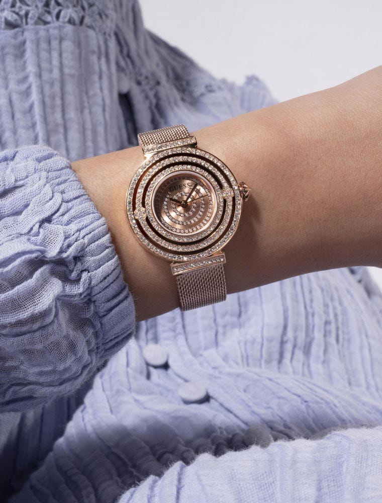 Женские наручные часы Guess GW0550L3 с минеральным стекломМинеральное стеклоМинеральное стекло представляет собой искусственно выращенный минерал кварца. Такое стекло отличается особой устойчивостью к повреждениям и царапинам. Уступает по некоторым качествам сапфировому стеклу., кварцевый механизм с высокой точностью. Класс водозащиты: 30 метров, позволит защитить корпус от случайных брызг или капель дождя. Корпус часов изготовлен из стали с IP-покрытиемIP-покрытиеМетод ионного напыления. Демонстрирует повышенную устойчивость к истиранию, окислению и химическим веществам. Под воздействием высокого давления и температуры около 1500°C молекулы металла надёжно соединяются с частицами корпуса часов.. Браслет с раскладной застёжкойРаскладная застёжкаТакой тип застёжки используется только на браслетах из металла. Она никогда не раскрывается полностью, происходит разделение на 2 и более частей. Раскладывающая застёжка снизит вероятность потери часов к минимуму. с IP-покрытиемIP-покрытиеМетод ионного напыления. Демонстрирует повышенную устойчивость к истиранию, окислению и химическим веществам. Под воздействием высокого давления и температуры около 1500°C молекулы металла надёжно соединяются с частицами корпуса часов.. Корпус и циферблат украшены кристаллами. Круглый стальной корпус, украшенный кристаллами. Циферблат выполнен по технологии Sunray (солнечные лучи). Браслет миланского плетения.