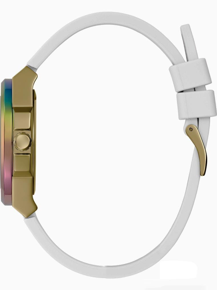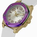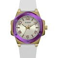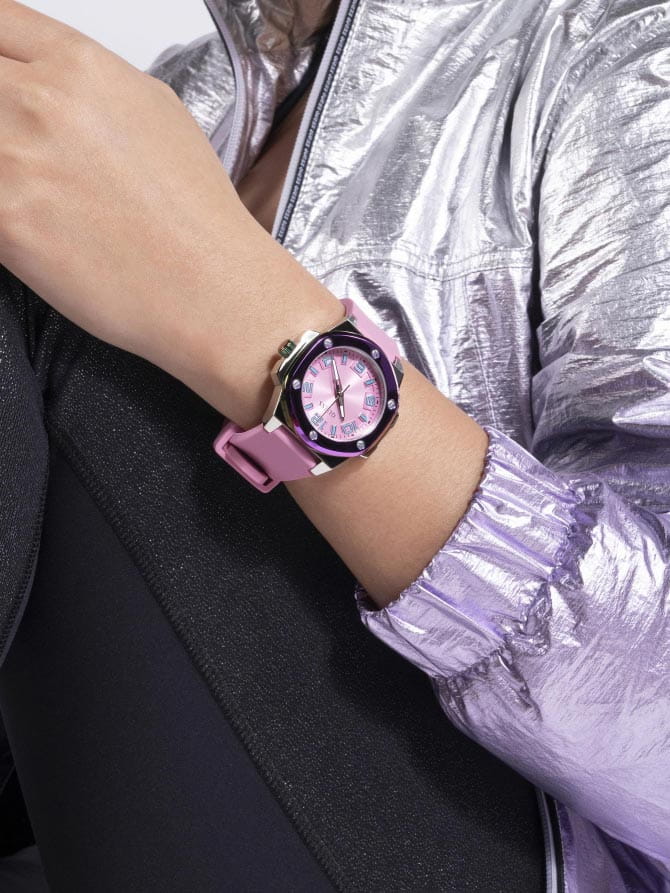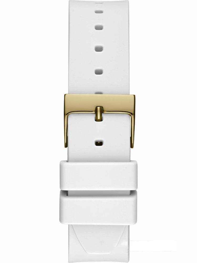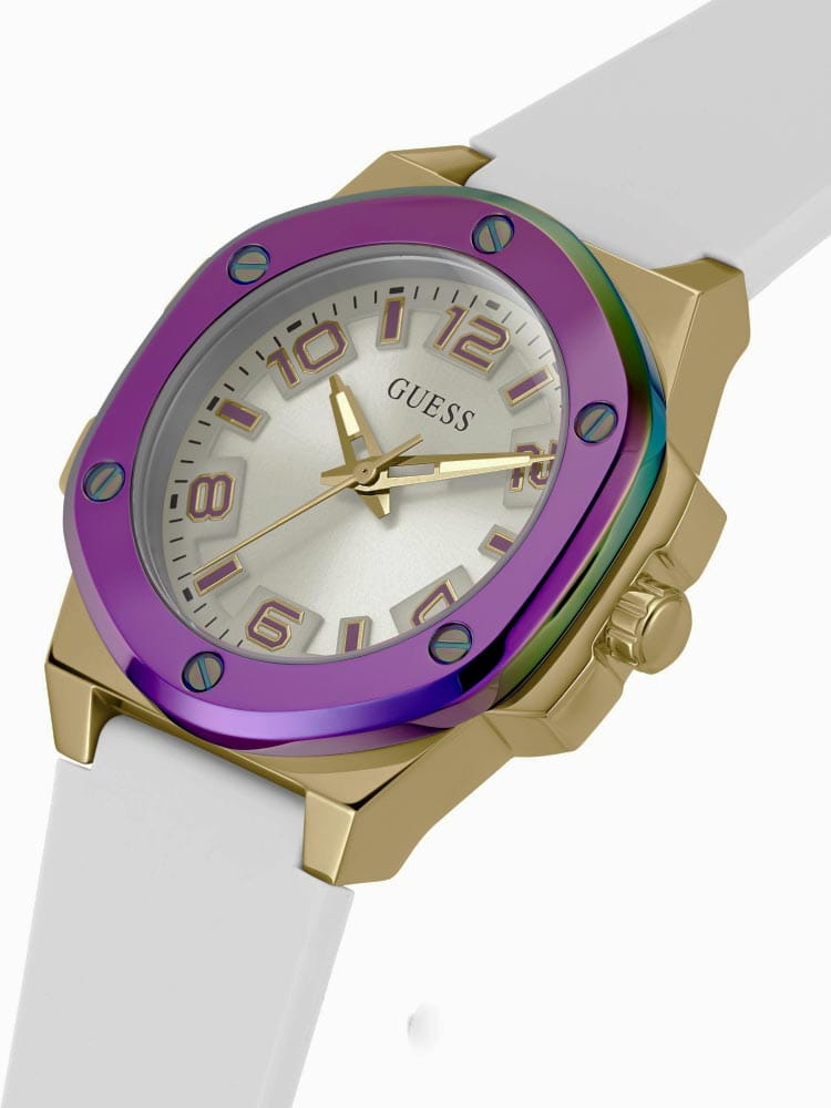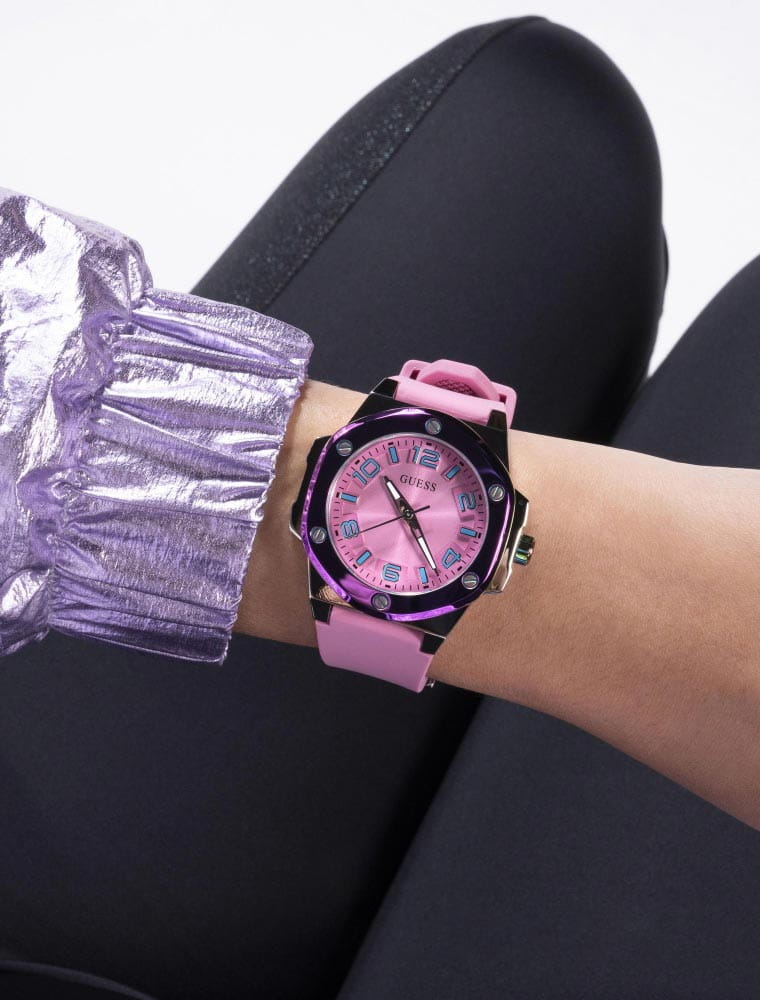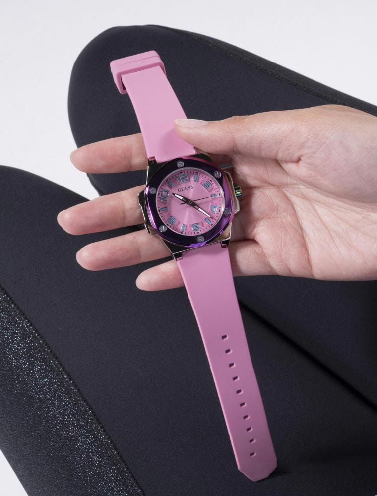 Женские наручные часы Guess Sport Steel GW0556L2 с минеральным стекломМинеральное стеклоМинеральное стекло представляет собой искусственно выращенный минерал кварца. Такое стекло отличается особой устойчивостью к повреждениям и царапинам. Уступает по некоторым качествам сапфировому стеклу., кварцевый механизм с высокой точностью. Стрелки и метки с люминесцентным покрытиемЛюминесцентное покрытиеПозволяет считывать показания времени в темноте. Производители наносят на стрелки, часовые индексы, безель или поверхность циферблата светонакопительный состав, дающий холодное свечение.. Класс водозащиты: 50 метров, позволит защитить корпус от случайных брызг или капель дождя. Корпус часов и безельБезельВнешний ободок, закрепляющий стекло. В спортивных часах так называется поворотное кольцо с делениями на циферблате, выполняет роль таймера – замеряет отрезки времени на шкале. Неподвижный безель – элемент декора. Однонаправленно вращающийся безель на дайверских часах позволяет фиксировать моменты погружения и выныривания на поверхность. изготовлены из стали с IP-покрытиемIP-покрытиеМетод ионного напыления. Демонстрирует повышенную устойчивость к истиранию, окислению и химическим веществам. Под воздействием высокого давления и температуры около 1500°C молекулы металла надёжно соединяются с частицами корпуса часов.. Силиконовый ремешок с классической застежкой.
