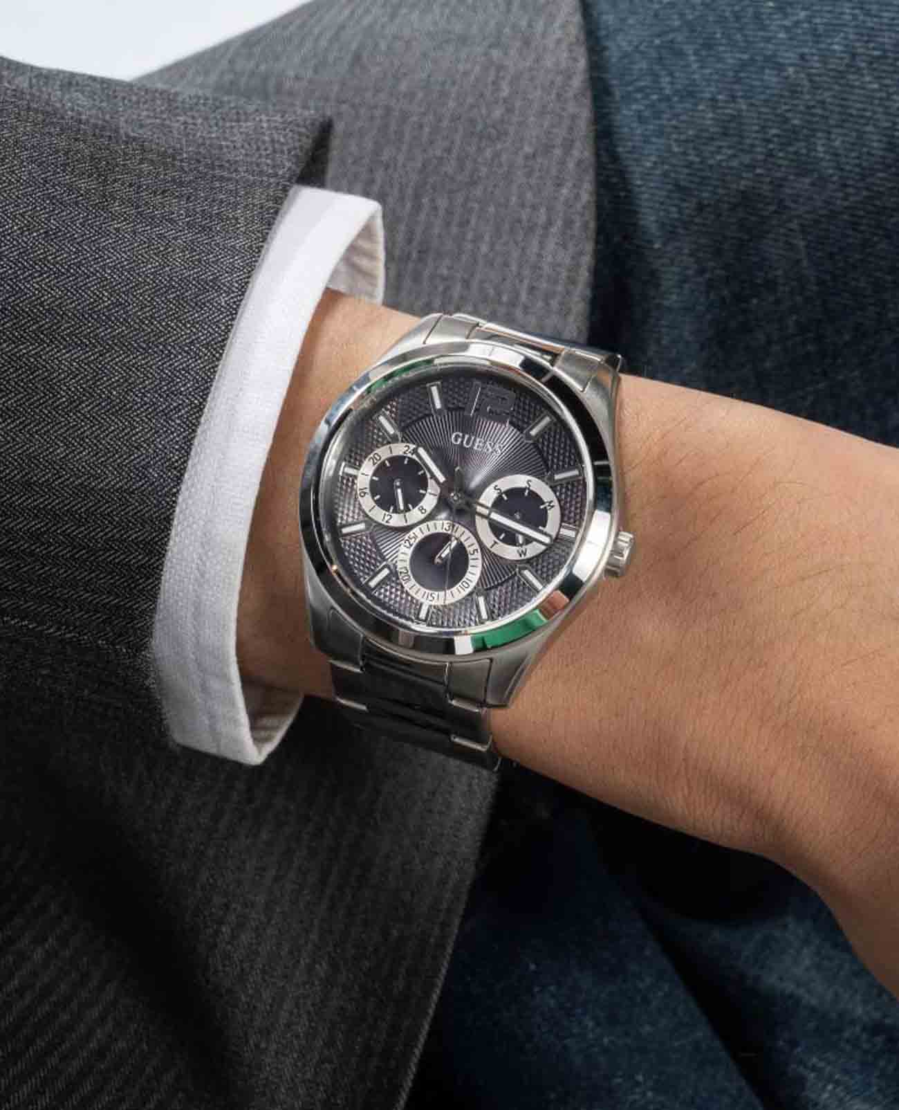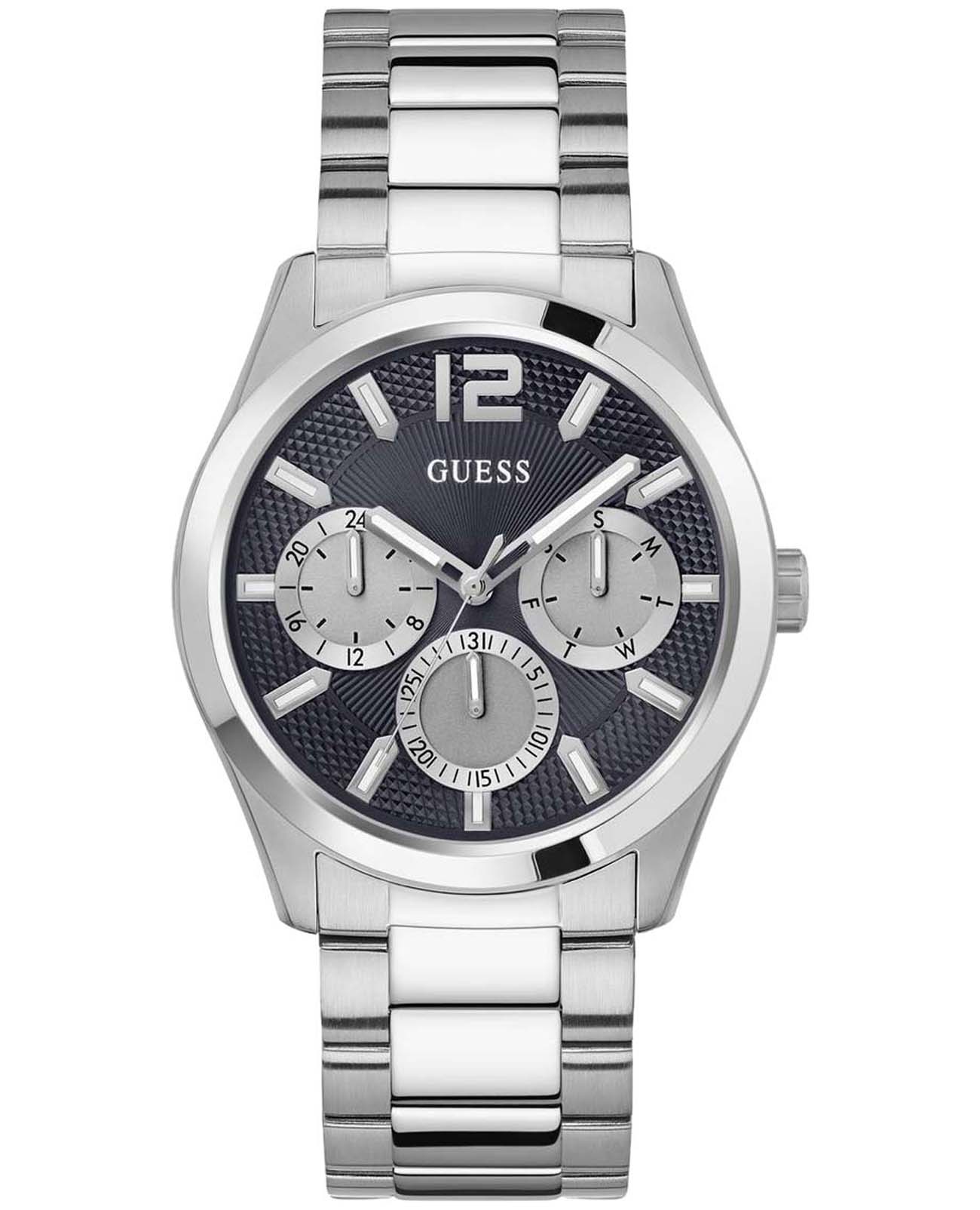 Мужские наручные часы с минеральным стекломМинеральное стеклоМинеральное стекло представляет собой искусственно выращенный минерал кварца. Такое стекло отличается особой устойчивостью к повреждениям и царапинам. Уступает по некоторым качествам сапфировому стеклу. Guess Dress GW0707G1, кварцевый механизм с высокой точностью. Корпус часов изготовлен из стали. 24-х часовой формат времени, число и день недели отображаются на отдельных циферблатах. Стрелки с люминесцентным покрытиемЛюминесцентное покрытиеПозволяет считывать показания времени в темноте. Производители наносят на стрелки, часовые индексы, безель или поверхность циферблата светонакопительный состав, дающий холодное свечение.. Класс водозащиты: 50 метров, позволит защитить корпус от случайных брызг или капель дождя. Стальной браслет на раскладной застёжкеРаскладная застёжкаТакой тип застёжки используется только на браслетах из металла. Она никогда не раскрывается полностью, происходит разделение на 2 и более частей. Раскладывающая застёжка снизит вероятность потери часов к минимуму..