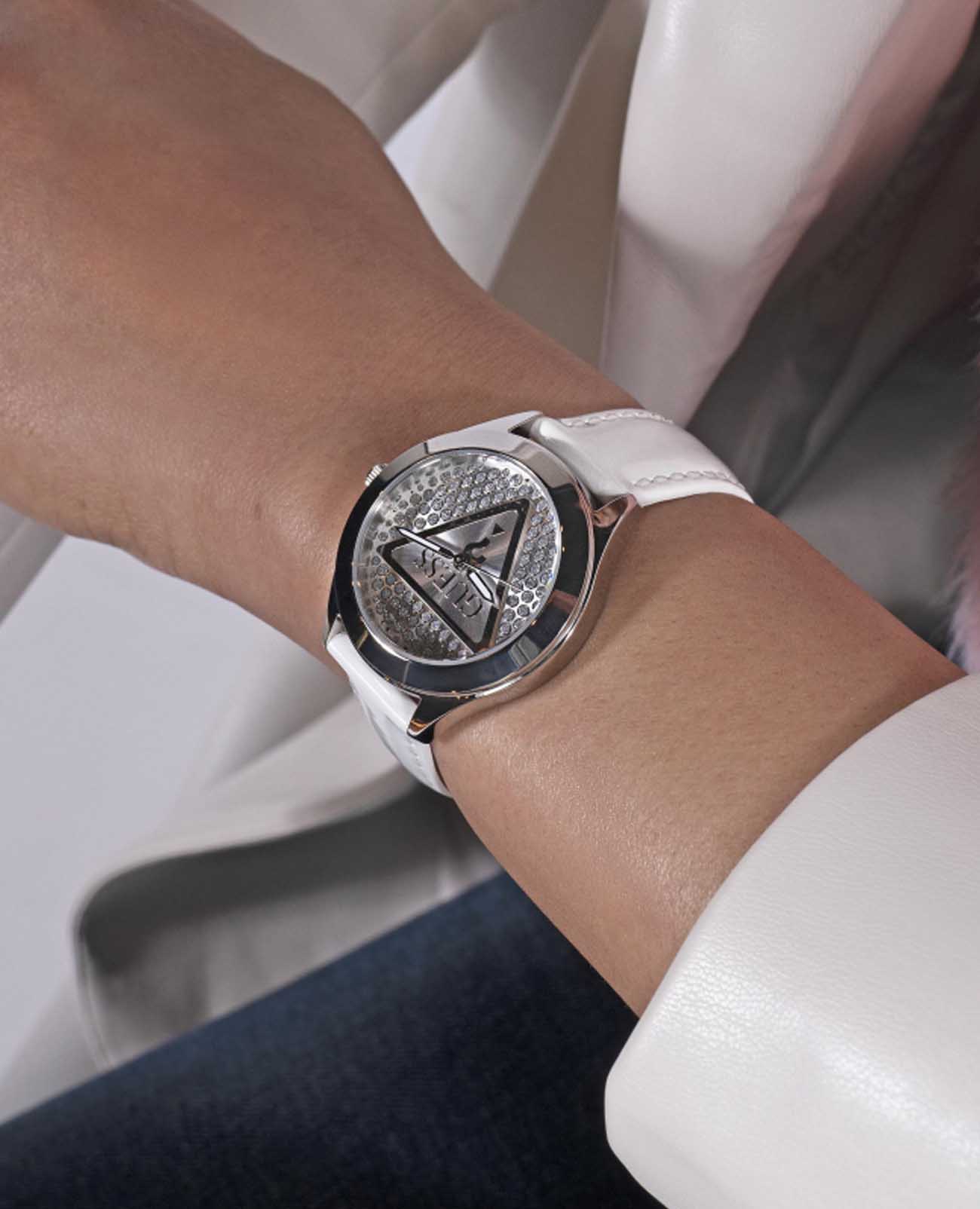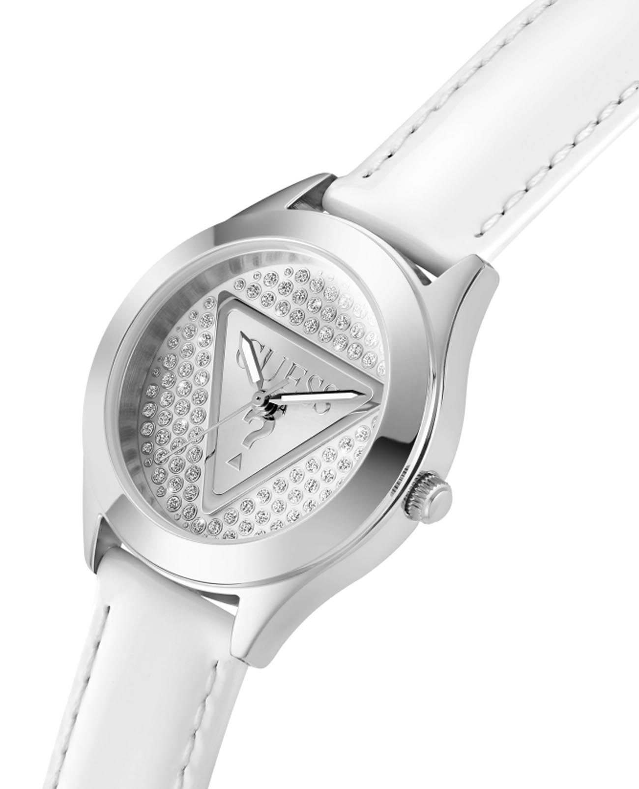 Женские наручные часы Guess Trend GW0745L3 с минеральным стекломМинеральное стеклоМинеральное стекло представляет собой искусственно выращенный минерал кварца. Такое стекло отличается особой устойчивостью к повреждениям и царапинам. Уступает по некоторым качествам сапфировому стеклу., кварцевый механизм с высокой точностью. Корпус часов изготовлен из стали. Циферблат украшен кристаллами. Стрелки с люминесцентным покрытиемЛюминесцентное покрытиеПозволяет считывать показания времени в темноте. Производители наносят на стрелки, часовые индексы, безель или поверхность циферблата светонакопительный состав, дающий холодное свечение.. Класс водозащиты: 30 метров, позволит защитить корпус от случайных брызг или капель дождя. Кожаный ремешок на стандартной застежке.
