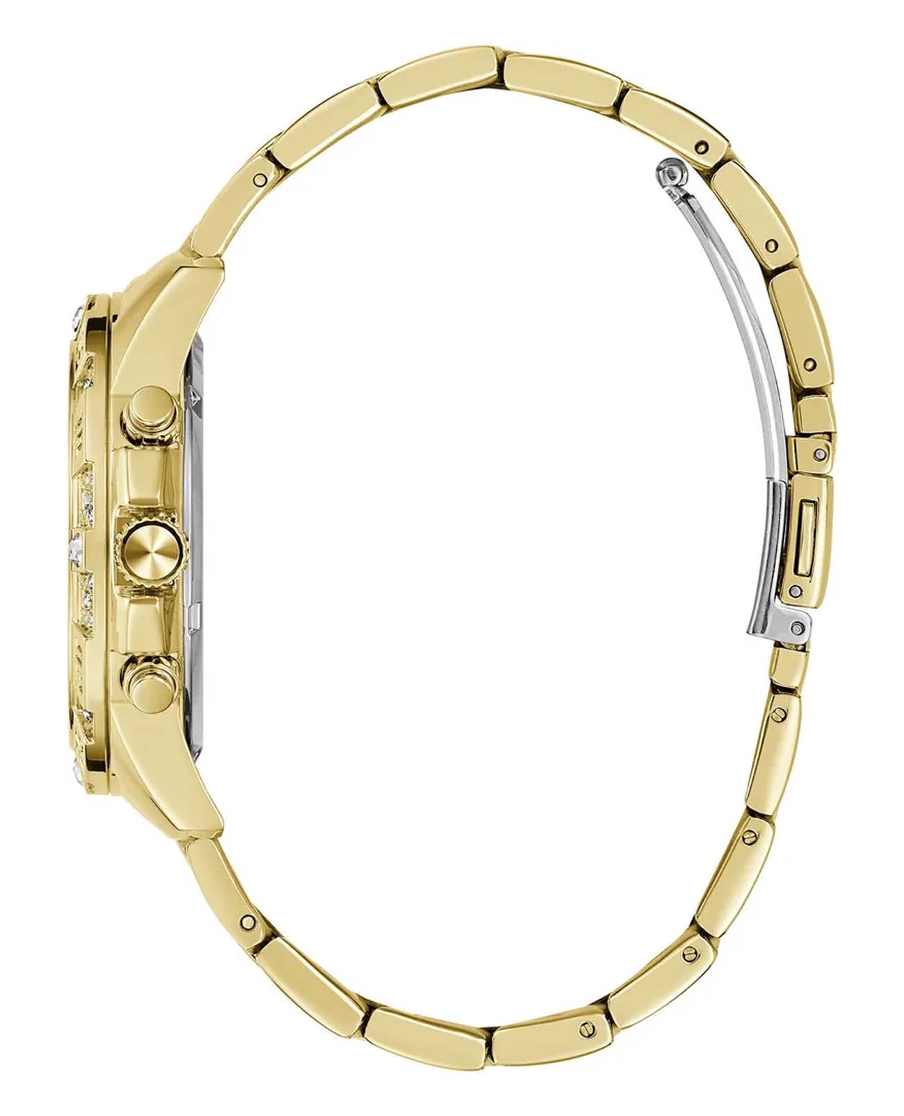Женские наручные часы Guess Dress GW0771L2 с минеральным стекломМинеральное стеклоМинеральное стекло представляет собой искусственно выращенный минерал кварца. Такое стекло отличается особой устойчивостью к повреждениям и царапинам. Уступает по некоторым качествам сапфировому стеклу., кварцевый механизм с высокой точностью. Корпус часов изготовлен из стали с IP-покрытиемIP-покрытиеМетод ионного напыления. Демонстрирует повышенную устойчивость к истиранию, окислению и химическим веществам. Под воздействием высокого давления и температуры около 1500°C молекулы металла надёжно соединяются с частицами корпуса часов.. БезельБезельВнешний ободок, закрепляющий стекло. В спортивных часах так называется поворотное кольцо с делениями на циферблате, выполняет роль таймера – замеряет отрезки времени на шкале. Неподвижный безель – элемент декора. Однонаправленно вращающийся безель на дайверских часах позволяет фиксировать моменты погружения и выныривания на поверхность. с IP-покрытиемIP-покрытиеМетод ионного напыления. Демонстрирует повышенную устойчивость к истиранию, окислению и химическим веществам. Под воздействием высокого давления и температуры около 1500°C молекулы металла надёжно соединяются с частицами корпуса часов. украшен кристаллами. Стрелки с люминесцентным покрытиемЛюминесцентное покрытиеПозволяет считывать показания времени в темноте. Производители наносят на стрелки, часовые индексы, безель или поверхность циферблата светонакопительный состав, дающий холодное свечение.. Класс водозащиты: 50 метров, позволит защитить корпус от случайных брызг или капель дождя. Стальной браслет с IP-покрытиемIP-покрытиеМетод ионного напыления. Демонстрирует повышенную устойчивость к истиранию, окислению и химическим веществам. Под воздействием высокого давления и температуры около 1500°C молекулы металла надёжно соединяются с частицами корпуса часов. на раскладной застёжкеРаскладная застёжкаТакой тип застёжки используется только на браслетах из металла. Она никогда не раскрывается полностью, происходит разделение на 2 и более частей. Раскладывающая застёжка снизит вероятность потери часов к минимуму..
