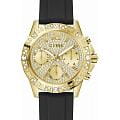 Женские наручные часы Guess Dress GW0772L5 с минеральным стекломМинеральное стеклоМинеральное стекло представляет собой искусственно выращенный минерал кварца. Такое стекло отличается особой устойчивостью к повреждениям и царапинам. Уступает по некоторым качествам сапфировому стеклу., кварцевый механизм с высокой точностью. Корпус часов изготовлен из стали с PVD-покрытиемPVDУльтратонкое покрытие наносится в технике вакуумного напыления, сочетает в себе нитрид титана особой прочности со слоем золота или оксида хрома. Несёт в себе декоративную или защитную функцию.. БезельБезельВнешний ободок, закрепляющий стекло. В спортивных часах так называется поворотное кольцо с делениями на циферблате, выполняет роль таймера – замеряет отрезки времени на шкале. Неподвижный безель – элемент декора. Однонаправленно вращающийся безель на дайверских часах позволяет фиксировать моменты погружения и выныривания на поверхность. с PVD-покрытиемPVDУльтратонкое покрытие наносится в технике вакуумного напыления, сочетает в себе нитрид титана особой прочности со слоем золота или оксида хрома. Несёт в себе декоративную или защитную функцию. украшен кристаллами. Стрелки с люминесцентным покрытиемЛюминесцентное покрытиеПозволяет считывать показания времени в темноте. Производители наносят на стрелки, часовые индексы, безель или поверхность циферблата светонакопительный состав, дающий холодное свечение.. Класс водозащиты: 50 метров, позволит защитить корпус от случайных брызг или капель дождя. Силиконовый ремешок с простой ремешковой застежкой.