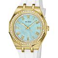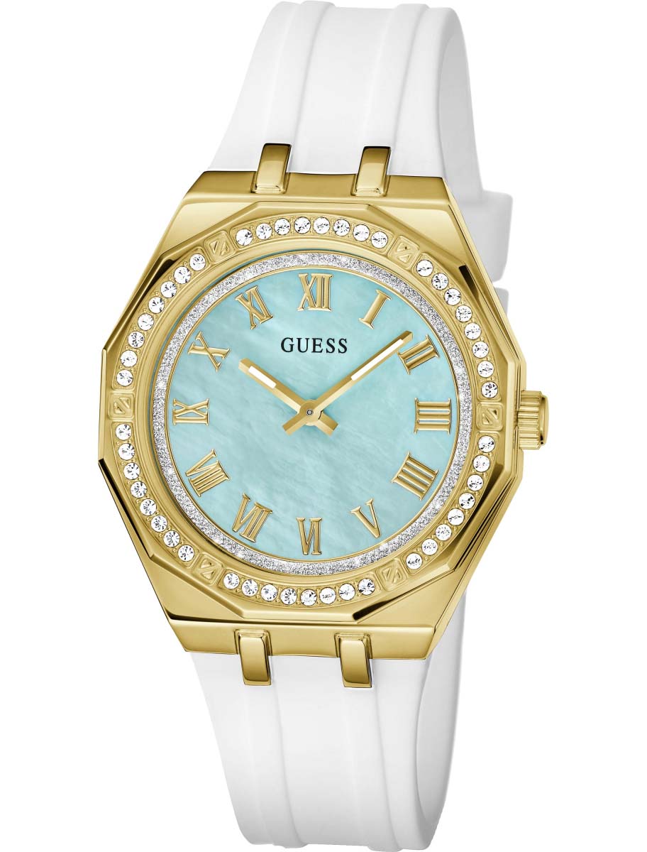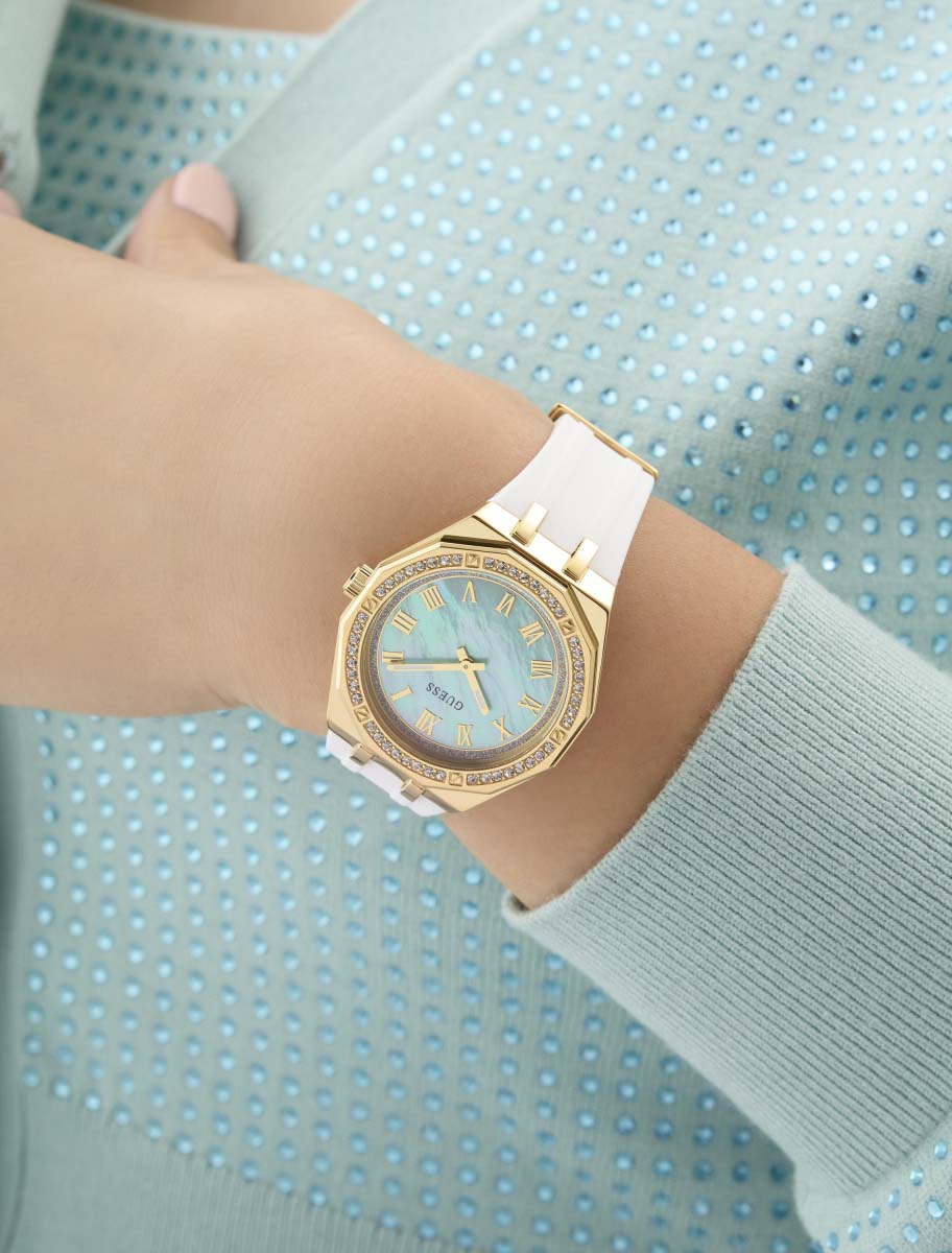 Часы Guess Dress 17300 — это изысканный аксессуар, который станет отличным дополнением к образу современной женщины. Эти наручные оснащены надежным кварцевым механизмом. Стальной корпус с золотистым IP-покрытиемIP-покрытиеМетод ионного напыления. Демонстрирует повышенную устойчивость к истиранию, окислению и химическим веществам. Под воздействием высокого давления и температуры около 1500°C молекулы металла надёжно соединяются с частицами корпуса часов. придаёт часам элегантный и стильный вид. Римские цифры обеспечивают удобное считывание времени и добавляют классический штрих. Люминесцентное покрытиеЛюминесцентное покрытиеПозволяет считывать показания времени в темноте. Производители наносят на стрелки, часовые индексы, безель или поверхность циферблата светонакопительный состав, дающий холодное свечение. на стрелках обеспечивает отличную видимость в темноте. Силиконовый браслет имеет белый цвет и гарантирует комфортное ношение и надежную фиксацию на запястье. Водозащита 50WR позволяет не беспокоиться о случайных брызгах и контакте с водой. Минеральное стеклоМинеральное стеклоМинеральное стекло представляет собой искусственно выращенный минерал кварца. Такое стекло отличается особой устойчивостью к повреждениям и царапинам. Уступает по некоторым качествам сапфировому стеклу. защищает циферблат от царапин и повреждений, обеспечивая долговечность и сохранность внешнего вида.