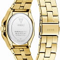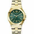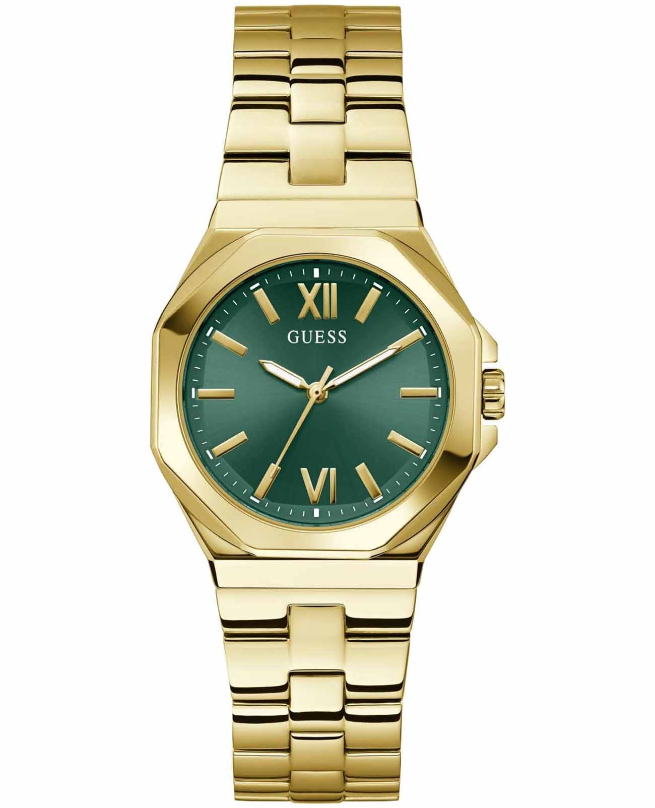 Часы Guess GW0873L2 — это изысканный аксессуар, который станет отличным дополнением к образу современной женщины. Эти наручные оснащены надежным кварцевым механизмом. Стальной корпус с золотистым IP-покрытиемIP-покрытиеМетод ионного напыления. Демонстрирует повышенную устойчивость к истиранию, окислению и химическим веществам. Под воздействием высокого давления и температуры около 1500°C молекулы металла надёжно соединяются с частицами корпуса часов. придаёт часам элегантный и стильный вид. Зеленый циферблат, выполненный по технологии Sunray, создает эффект солнечных лучей, добавляя глубину и выразительность дизайну. Метки в виде штрихов и римские цифры VI и XII обеспечивают удобное считывание времени и добавляют классический штрих. Люминесцентное покрытиеЛюминесцентное покрытиеПозволяет считывать показания времени в темноте. Производители наносят на стрелки, часовые индексы, безель или поверхность циферблата светонакопительный состав, дающий холодное свечение. на стрелках обеспечивает отличную видимость в темноте. Часы оснащены рифленой заводной головкой с защитой, что обеспечивает удобство и надежность в использовании. Стальной браслет с золотистым IP-покрытиемIP-покрытиеМетод ионного напыления. Демонстрирует повышенную устойчивость к истиранию, окислению и химическим веществам. Под воздействием высокого давления и температуры около 1500°C молекулы металла надёжно соединяются с частицами корпуса часов. и раскладной застежкойРаскладная застёжкаТакой тип застёжки используется только на браслетах из металла. Она никогда не раскрывается полностью, происходит разделение на 2 и более частей. Раскладывающая застёжка снизит вероятность потери часов к минимуму. гарантирует комфортное ношение и надежную фиксацию на запястье. Водозащита 50WR позволяет не беспокоиться о случайных брызгах и контакте с водой. Минеральное стеклоМинеральное стеклоМинеральное стекло представляет собой искусственно выращенный минерал кварца. Такое стекло отличается особой устойчивостью к повреждениям и царапинам. Уступает по некоторым качествам сапфировому стеклу. защищает циферблат от царапин и повреждений, обеспечивая долговечность и сохранность внешнего вида.