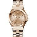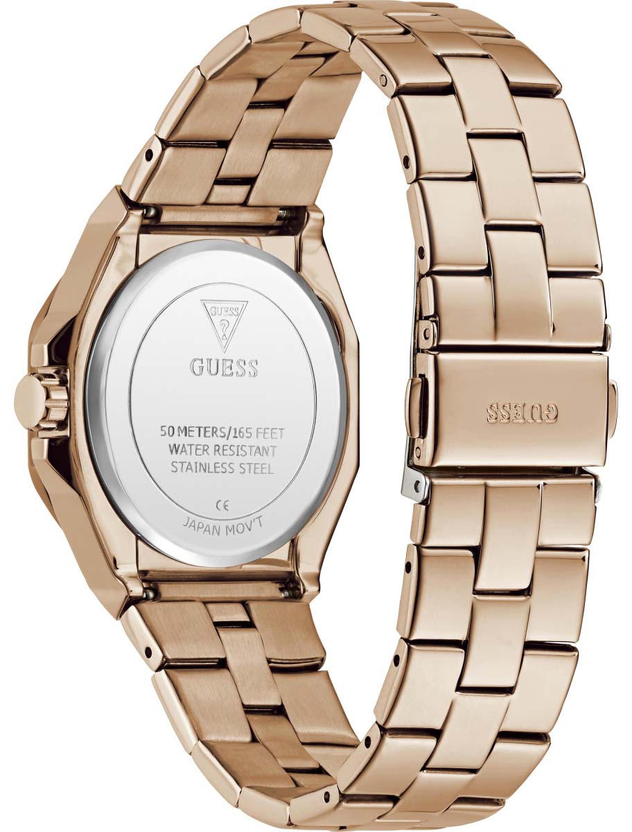 Часы Guess GW0873L3 — это изысканный аксессуар, который станет отличным дополнением к образу современной женщины. Эти наручные оснащены надежным кварцевым механизмом. Стальной корпус с золотистым IP-покрытиемIP-покрытиеМетод ионного напыления. Демонстрирует повышенную устойчивость к истиранию, окислению и химическим веществам. Под воздействием высокого давления и температуры около 1500°C молекулы металла надёжно соединяются с частицами корпуса часов. придаёт часам элегантный и стильный вид. Циферблат золотого цвета, выполненный по технологии Sunray, создает эффект солнечных лучей, добавляя глубину и выразительность дизайну. Метки в виде штрихов и римские цифры VI и XII обеспечивают удобное считывание времени и добавляют классический штрих. Люминесцентное покрытиеЛюминесцентное покрытиеПозволяет считывать показания времени в темноте. Производители наносят на стрелки, часовые индексы, безель или поверхность циферблата светонакопительный состав, дающий холодное свечение. на стрелках обеспечивает отличную видимость в темноте. Часы оснащены рифленой заводной головкой с защитой, что обеспечивает удобство и надежность в использовании. Стальной браслет с золотистым IP-покрытиемIP-покрытиеМетод ионного напыления. Демонстрирует повышенную устойчивость к истиранию, окислению и химическим веществам. Под воздействием высокого давления и температуры около 1500°C молекулы металла надёжно соединяются с частицами корпуса часов. и раскладной застежкойРаскладная застёжкаТакой тип застёжки используется только на браслетах из металла. Она никогда не раскрывается полностью, происходит разделение на 2 и более частей. Раскладывающая застёжка снизит вероятность потери часов к минимуму. гарантирует комфортное ношение и надежную фиксацию на запястье. Водозащита 50WR позволяет не беспокоиться о случайных брызгах и контакте с водой. Минеральное стеклоМинеральное стеклоМинеральное стекло представляет собой искусственно выращенный минерал кварца. Такое стекло отличается особой устойчивостью к повреждениям и царапинам. Уступает по некоторым качествам сапфировому стеклу. защищает циферблат от царапин и повреждений, обеспечивая долговечность и сохранность внешнего вида.