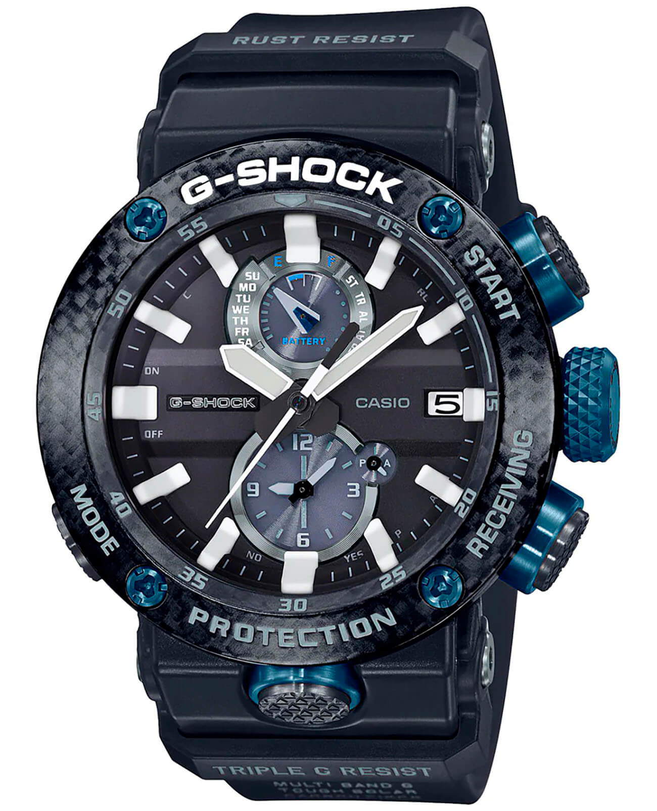 Внушительный аксессуар стильно смотрится на широком запястье, гармонично смотрятся крупные детали в голубом цвете. Задняя крышка здесь отсутствует, ударопрочный корпусУдаропрочный корпусМеханизм заключён в корпус, выполненный из современных материалов, устойчивых к ударам, механическим повреждениям и падению с высоты: инновационный пластик, карбон, нержавеющая сталь, титан. сделан из монолитного углеродного монокока, вдохновлённого конструкцией ранних самолётов. Он состоит из 52 карбоновых слоёв, уникальная текстура просматривается на боковых частях безеляБезельВнешний ободок, закрепляющий стекло. В спортивных часах так называется поворотное кольцо с делениями на циферблате, выполняет роль таймера – замеряет отрезки времени на шкале. Неподвижный безель – элемент декора. Однонаправленно вращающийся безель на дайверских часах позволяет фиксировать моменты погружения и выныривания на поверхность. – с успехом реализована технология Carbon Core GuardCarbon Core Guard Новейшая структура корпуса, разработанная Casio. Полиуретановая пластина дополнительно усилена карбоновыми вставками, что придаёт специальную защиту от механических повреждений. Карбон отличается лёгкостью и прочностью.. Полимерный ремешок тоже имеет усиление карбоновыми волокнами. Наручные часы обладают полезным функционалом: BluetoothBluetoothСовременная технология, позволяющая синхронизировать часы с телефоном и переносить данные. Часы с Bluetooth расширяют возможности вашего смартфона и делают его использование ещё более удобным., будильник, мировое времяМировое время Полезное часовое усложнение, отображающее время в основных городах и известных областях по всему миру, оно связано с часовыми поясами, удобно для путешественников и бизнесменов. , таймер, приём радиосигнала, питание от солнечной батареи . Сапфировое стекло с антибликовой обработкой. Яркая люминесцентная подсветкаЛюминесцентное покрытиеПозволяет считывать показания времени в темноте. Производители наносят на стрелки, часовые индексы, безель или поверхность циферблата светонакопительный состав, дающий холодное свечение.. Габариты: 50,1 x 46,4 x 16,9 мм.