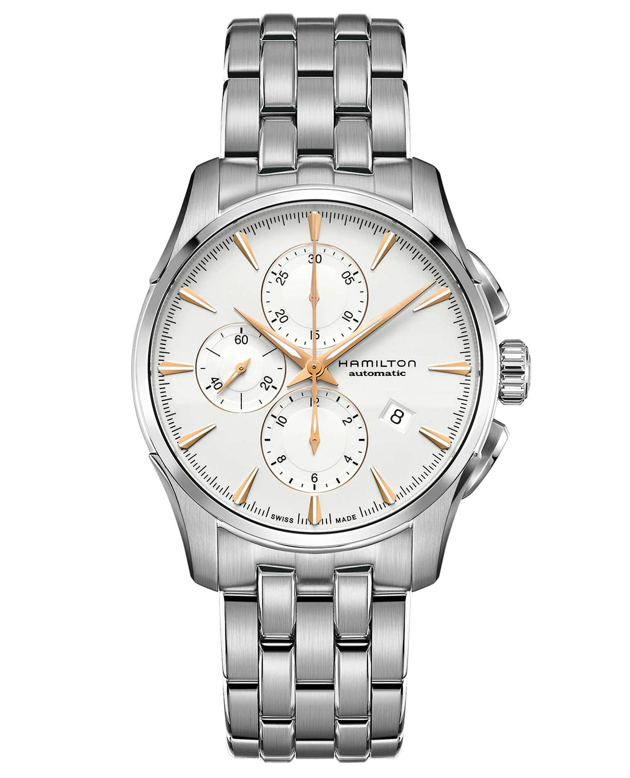 Jazzmaster Auto Chrono - это часы, которые легко приспосабливаются к ритмам современной жизни, продолжая при этом танцевать в такт собственному барабану. Для тех, кто любит традиции, но ценит инновации, модель H-21 с 60-часовым запасом хода выполнена в корпусе с плавными изгибами и чистыми линиями. Часы-хронографХронографФункция позволяет измерять отрезки времени с особой точностью: часы, минуты, секунды. Верным признаком хронографа является наличие на циферблате 3 дополнительных окошек-счётчиков. H32586111 с механическим механизмом (автоматический калибр) высокой точности. Сапфировое стеклоСапфировое стеклоПрочный и надёжный материал из кристалла сапфира синтетического происхождения, характеризующийся особой твёрдостью и устойчивостью к царапинам и повреждениям. устойчивое к появлению царапин, обладающее высокой прозрачностью. Класс водозащиты: 100 метров, позволит плавать, нырять и заниматься другими водными видами спорта. Корпус часов изготовлен из нержавеющей стали. Браслет с раскладной застёжкойРаскладная застёжкаТакой тип застёжки используется только на браслетах из металла. Она никогда не раскрывается полностью, происходит разделение на 2 и более частей. Раскладывающая застёжка снизит вероятность потери часов к минимуму..