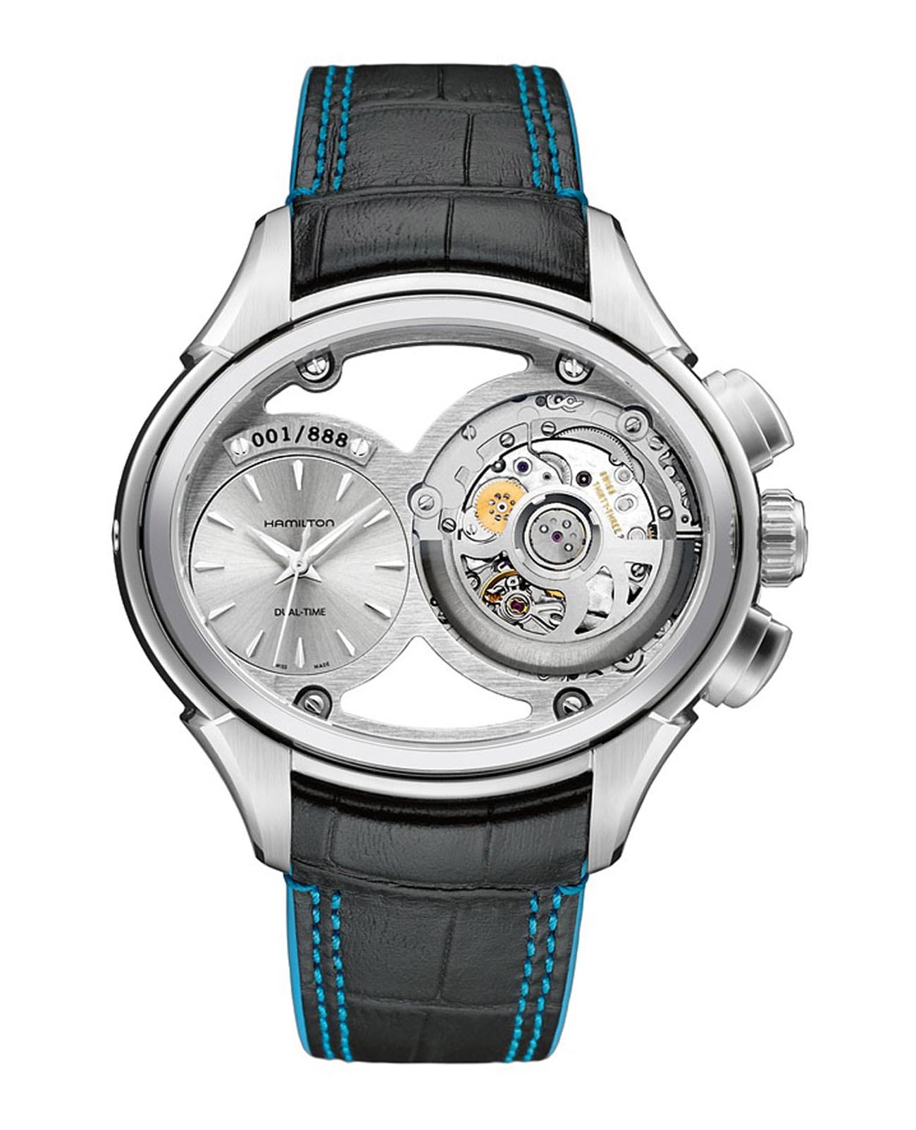 Мужские лимитированные двусторонние часы-скелетоны с двумя циферблатами Hamilton Jazzmaster Face 2 Face Limited Edition H32856705. Надёжным механизм с автоматическим подзаводом. Корпус часов изготовлен из нержавеющей стали. Сапфировое стеклоСапфировое стеклоПрочный и надёжный материал из кристалла сапфира синтетического происхождения, характеризующийся особой твёрдостью и устойчивостью к царапинам и повреждениям. устойчивое к мелким механическим повреждениям. Кожаный ремешок с раскладной застёжкойРаскладная застёжкаТакой тип застёжки используется только на браслетах из металла. Она никогда не раскрывается полностью, происходит разделение на 2 и более частей. Раскладывающая застёжка снизит вероятность потери часов к минимуму.. Стрелки с люминесцентным покрытиемЛюминесцентное покрытиеПозволяет считывать показания времени в темноте. Производители наносят на стрелки, часовые индексы, безель или поверхность циферблата светонакопительный состав, дающий холодное свечение.. Класс водозащиты: 50 метров, позволит защитить корпус от случайных брызг или капель дождя. Часы можно носить двумя способами, обе стороны могут быть настроены на разные часовые пояса.