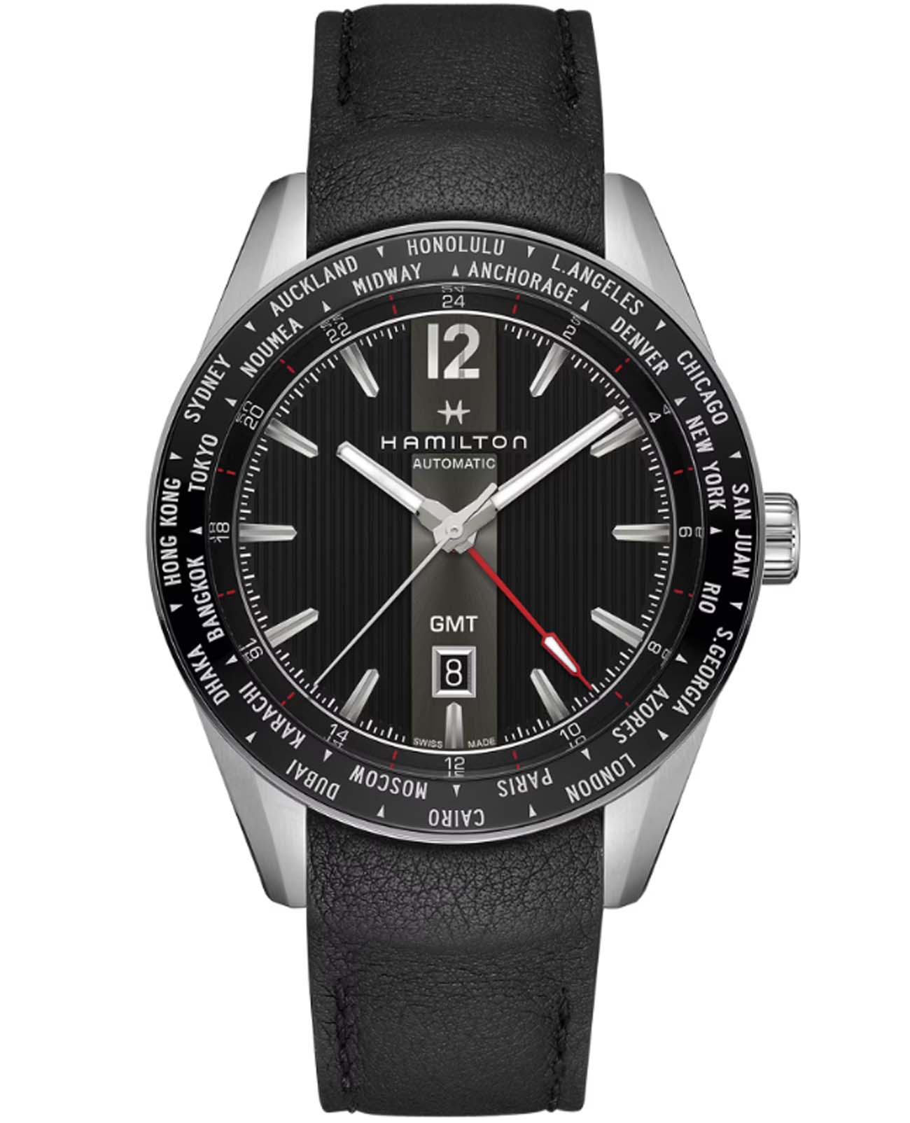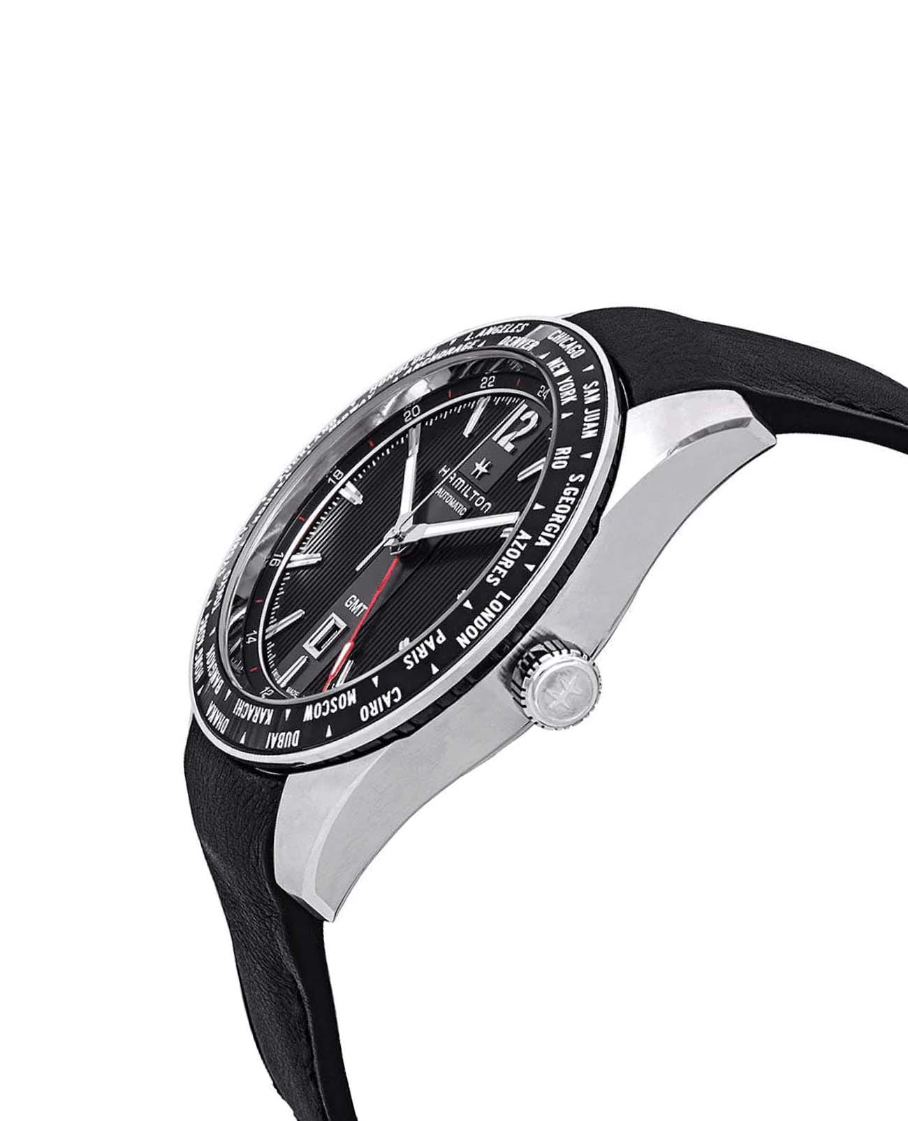 Мужские механические швейцарские часы Hamilton Broadway GMTGMTОтображение времени второго часового пояса.Такая функция особенно актуальна для путешественников и бизнесменов,которые общаются с людьми из разных стран,теперь вы всегда будете знать,какой час у вашего партнёра или близкого человека. Limited Edition H43725731. Сапфировое стеклоСапфировое стеклоПрочный и надёжный материал из кристалла сапфира синтетического происхождения, характеризующийся особой твёрдостью и устойчивостью к царапинам и повреждениям. устойчивое к появлению царапин, обладающее высокой прозрачностью. Класс водозащиты: 50 метров, позволит защитить корпус от случайных брызг или капель дождя. Корпус часов изготовлен из стали. Стрелки и метки с люминесцентным покрытиемЛюминесцентное покрытиеПозволяет считывать показания времени в темноте. Производители наносят на стрелки, часовые индексы, безель или поверхность циферблата светонакопительный состав, дающий холодное свечение.. Кожаный ремешок с раскладной застёжкойРаскладная застёжкаТакой тип застёжки используется только на браслетах из металла. Она никогда не раскрывается полностью, происходит разделение на 2 и более частей. Раскладывающая застёжка снизит вероятность потери часов к минимуму.. Окошко даты находится в положении 6 часов. БезельБезельВнешний ободок, закрепляющий стекло. В спортивных часах так называется поворотное кольцо с делениями на циферблате, выполняет роль таймера – замеряет отрезки времени на шкале. Неподвижный безель – элемент декора. Однонаправленно вращающийся безель на дайверских часах позволяет фиксировать моменты погружения и выныривания на поверхность. с PVD-покрытиемPVDУльтратонкое покрытие наносится в технике вакуумного напыления, сочетает в себе нитрид титана особой прочности со слоем золота или оксида хрома. Несёт в себе декоративную или защитную функцию..