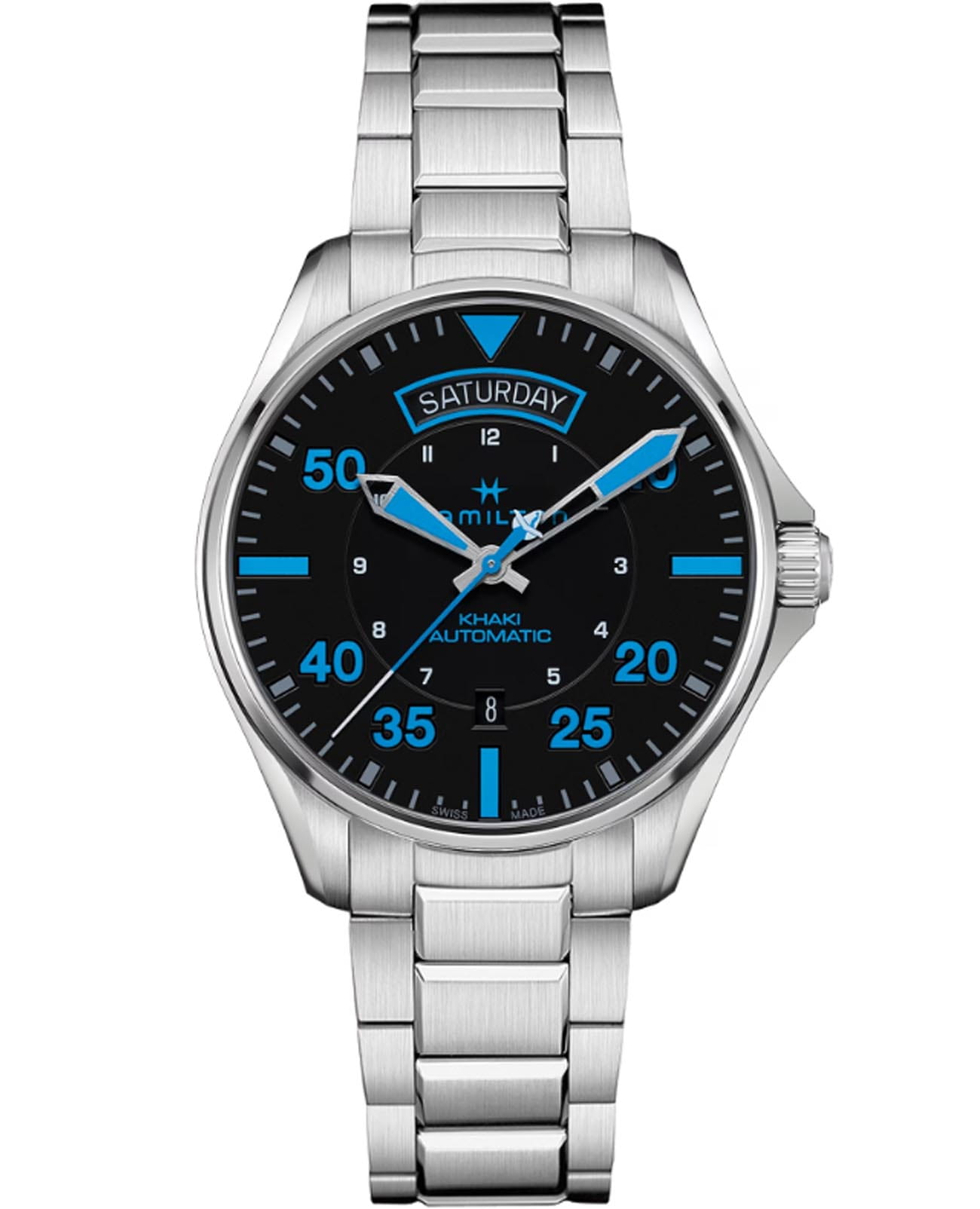 Мужские наручные часы Hamilton Khaki Aviation Pilot Day Date Air Zermatt Auto H64625131 с автоматическим механизмом. Корпус и браслет изготовлены из нержавеющей стали. Стальной браслет на раскладной застёжкеРаскладная застёжкаТакой тип застёжки используется только на браслетах из металла. Она никогда не раскрывается полностью, происходит разделение на 2 и более частей. Раскладывающая застёжка снизит вероятность потери часов к минимуму.. Стрелки и метки с люминесцентным покрытиемЛюминесцентное покрытиеПозволяет считывать показания времени в темноте. Производители наносят на стрелки, часовые индексы, безель или поверхность циферблата светонакопительный состав, дающий холодное свечение.. Сапфировое стеклоСапфировое стеклоПрочный и надёжный материал из кристалла сапфира синтетического происхождения, характеризующийся особой твёрдостью и устойчивостью к царапинам и повреждениям. устойчивое к мелким механическим повреждениям. Класс водозащиты: 100 метров, позволит плавать, нырять и заниматься другими водными видами спорта. Окошко дня недели и даты находятся в положении 12 и 6 часов.