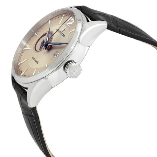 Мужские швейцарские часы Hamilton Jazzmaster H89545721 сочетают классическую элегантность с современной механикой в корпусе из нержавеющей стали диаметром 42 мм, дополненном устойчивым к царапинам сапфировым стекломСапфировое стеклоПрочный и надёжный материал из кристалла сапфира синтетического происхождения, характеризующийся особой твёрдостью и устойчивостью к царапинам и повреждениям.. Бежевый циферблат с контрастными синими стрелками подчеркивает аристократизм модели, а арабский индекс на 12 часах обеспечивают функциональность 15. Механизм Hamilton Calibre H-13 с увеличенным 80-часовым запасом хода гарантирует точность хода и удобство ношения, дополнен функцией индикации даты в положении "3 часа". Ремешок из телячьей кожи шириной 22 мм со складной застежкой обеспечивает комфорт, а водонепроницаемость 5 ATM (50 метров) защищает от бытовых воздействий. Прозрачная задняя крышка демонстрирует искусство швейцарского механизма, подчеркивая статус коллекционного аксессуара.