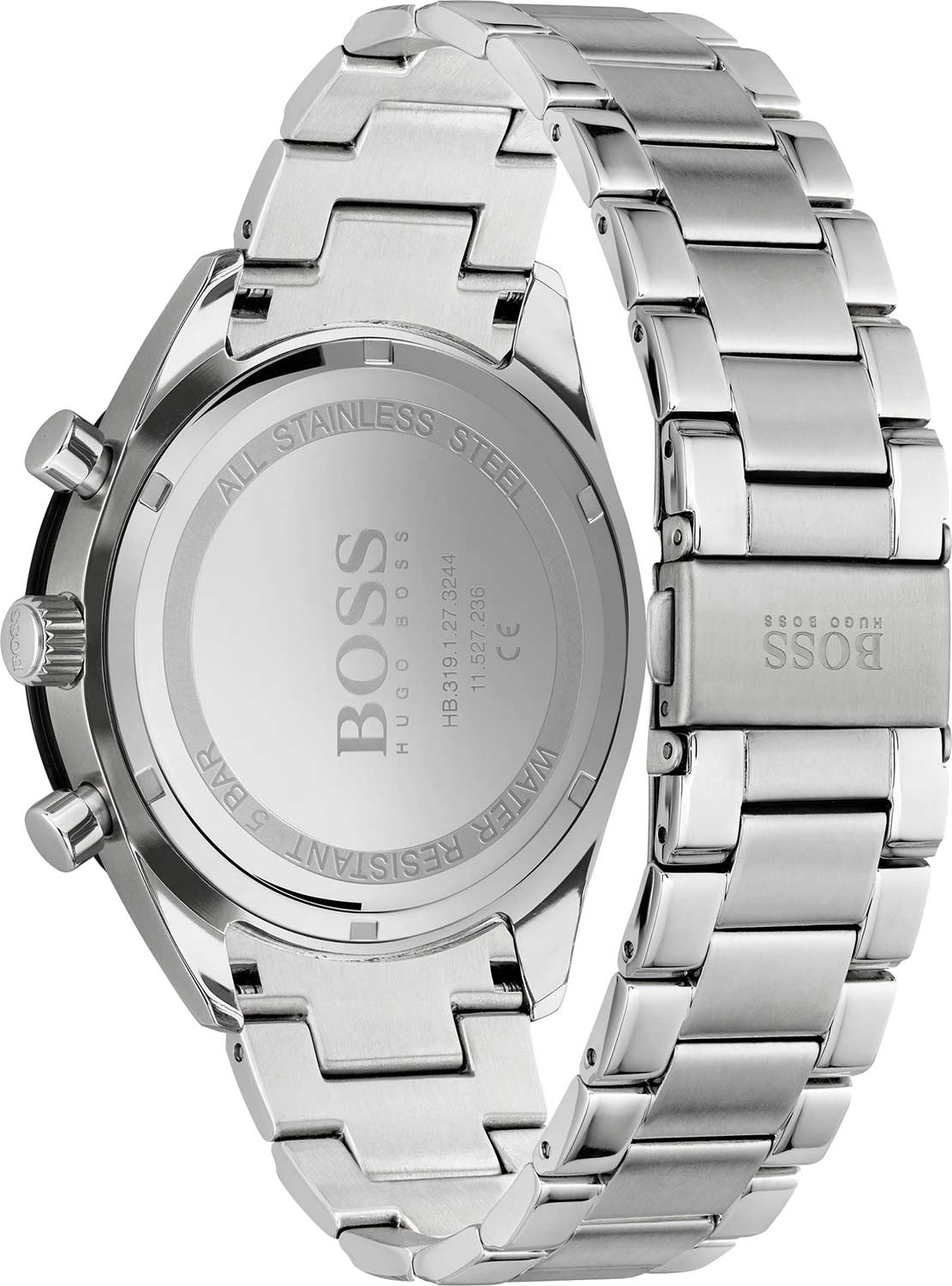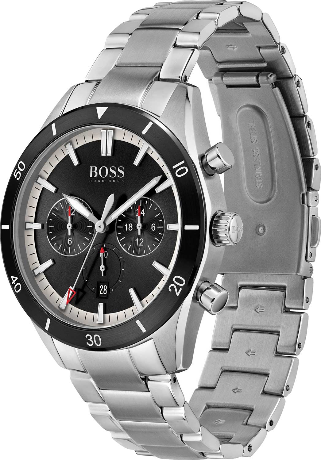 Мужские часы Hugo Boss HB1513862 коллекции Santiago представлены в круглом 44-мм корпусе из нержавеющей стали 316L с IP-покрытиемIP-покрытиеМетод ионного напыления. Демонстрирует повышенную устойчивость к истиранию, окислению и химическим веществам. Под воздействием высокого давления и температуры около 1500°C молекулы металла надёжно соединяются с частицами корпуса часов.. Оснащены кварцевым механизмом с функциями хронографаХронографФункция позволяет измерять отрезки времени с особой точностью: часы, минуты, секунды. Верным признаком хронографа является наличие на циферблате 3 дополнительных окошек-счётчиков., секундомеромСекундомерСекундоме́р — прибор, способный измерять интервалы времени с точностью до долей секунды. и тахиметрической шкалойТахиметрРазмеченная шкала, располагается на ободке или безеле часов. Тахиметр позволяет рассчитать скорость на определённом участке пути, расстояние измеряется в километрах или милях., а также индикацией даты. Черный циферблат с метками в виде штрихов защищен устойчивым к царапинам минеральным стекломМинеральное стеклоМинеральное стекло представляет собой искусственно выращенный минерал кварца. Такое стекло отличается особой устойчивостью к повреждениям и царапинам. Уступает по некоторым качествам сапфировому стеклу.. Браслет из стали 316L дополнен раскладной застёжкойРаскладная застёжкаТакой тип застёжки используется только на браслетах из металла. Она никогда не раскрывается полностью, происходит разделение на 2 и более частей. Раскладывающая застёжка снизит вероятность потери часов к минимуму.. Водонепроницаемость 50 метров (5 ATM) обеспечивает защиту от брызг и дождя.