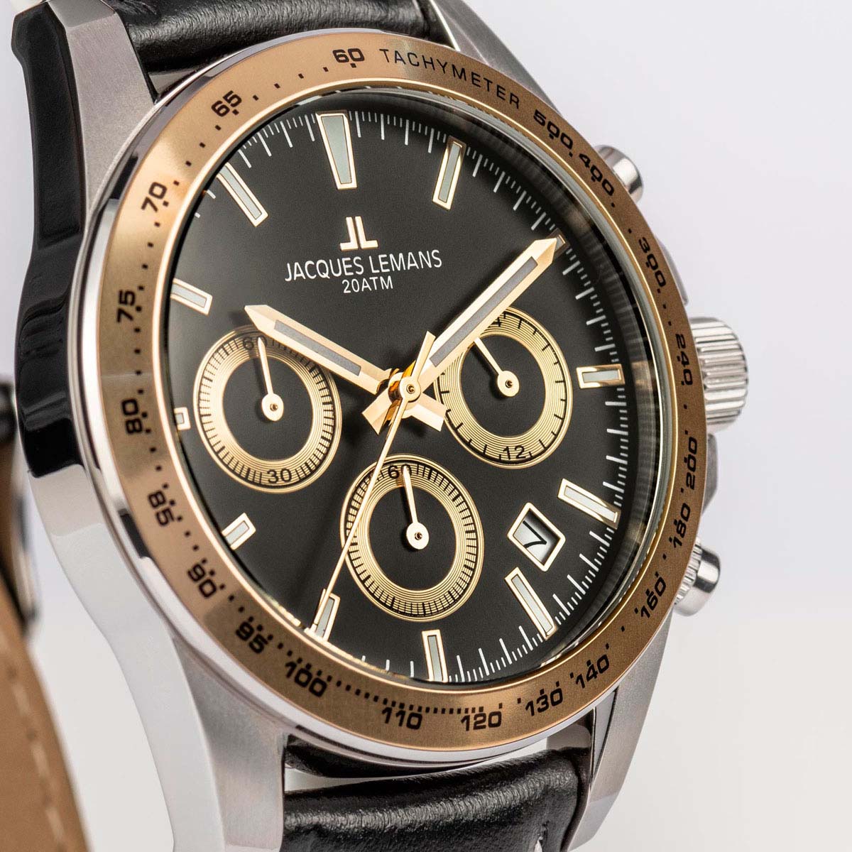 Мужские часы Jacques Lemans Liverpool 1-1877D с минеральным стекломМинеральное стеклоМинеральное стекло представляет собой искусственно выращенный минерал кварца. Такое стекло отличается особой устойчивостью к повреждениям и царапинам. Уступает по некоторым качествам сапфировому стеклу., кварцевый механизм с высокой точностью. Часы- хронографХронографФункция позволяет измерять отрезки времени с особой точностью: часы, минуты, секунды. Верным признаком хронографа является наличие на циферблате 3 дополнительных окошек-счётчиков. с секундомеромСекундомерСекундоме́р — прибор, способный измерять интервалы времени с точностью до долей секунды. представляют собой стильный аксессуар, отражающий идеальное сочетание современного дизайна, надёжности и функциональности.  Неподвижный безельБезельВнешний ободок, закрепляющий стекло. В спортивных часах так называется поворотное кольцо с делениями на циферблате, выполняет роль таймера – замеряет отрезки времени на шкале. Неподвижный безель – элемент декора. Однонаправленно вращающийся безель на дайверских часах позволяет фиксировать моменты погружения и выныривания на поверхность. из нержавеющей стали с PVDPVDУльтратонкое покрытие наносится в технике вакуумного напыления, сочетает в себе нитрид титана особой прочности со слоем золота или оксида хрома. Несёт в себе декоративную или защитную функцию. покрытием и с тахиметромТахиметрРазмеченная шкала, располагается на ободке или безеле часов. Тахиметр позволяет рассчитать скорость на определённом участке пути, расстояние измеряется в километрах или милях.. На циферблате расположены два дополнительных индикатора и окошко даты. Стрелки и метки с люминесцентным покрытиемЛюминесцентное покрытиеПозволяет считывать показания времени в темноте. Производители наносят на стрелки, часовые индексы, безель или поверхность циферблата светонакопительный состав, дающий холодное свечение.. Класс водозащиты: 200 метров, позволит плавать, нырять и заниматься другими водными видами спорта. Рифленая заводная головка с защитой. Ремешок из натуральной кожи на стандартной застежке.