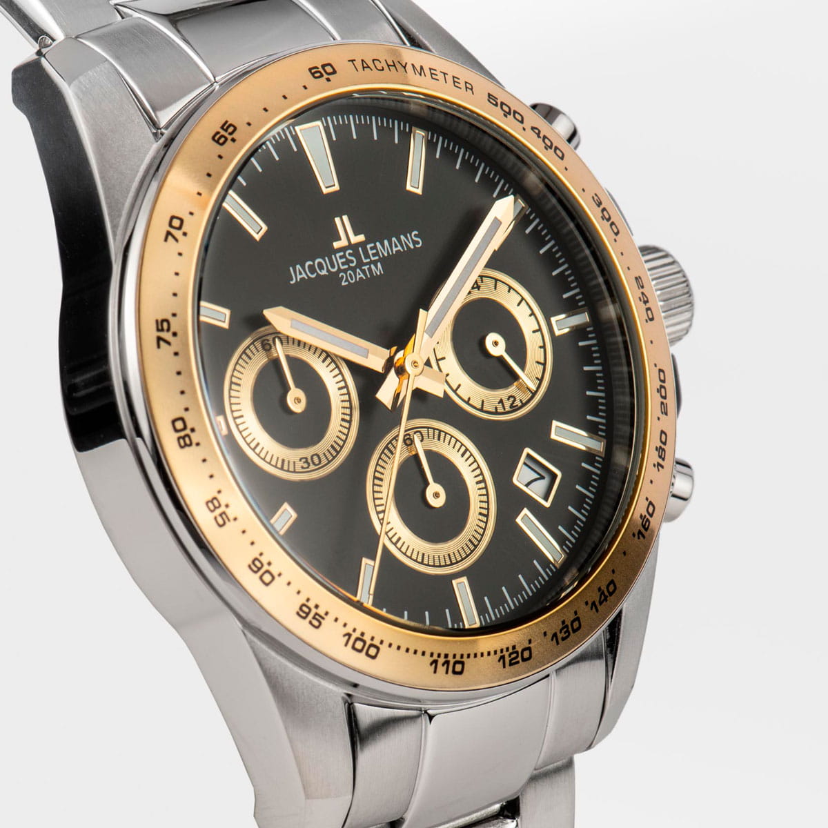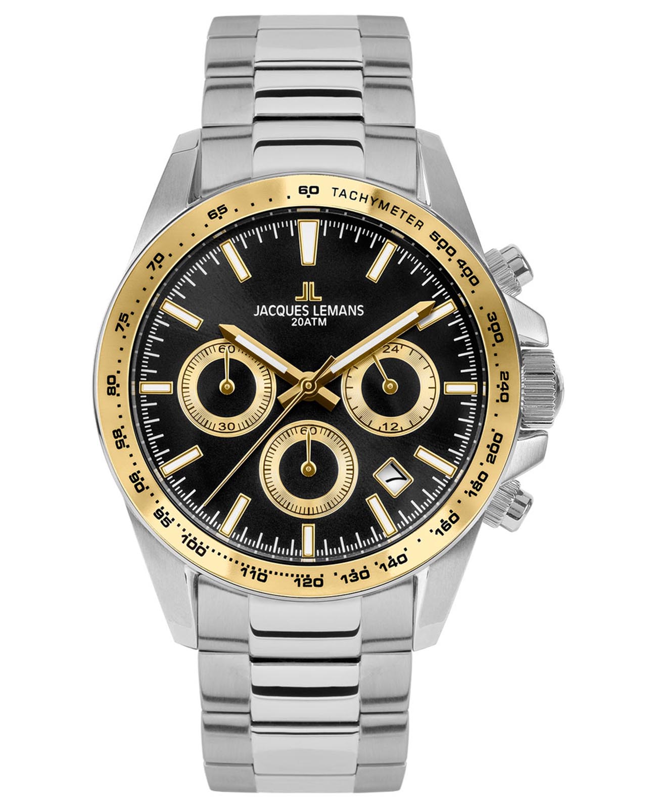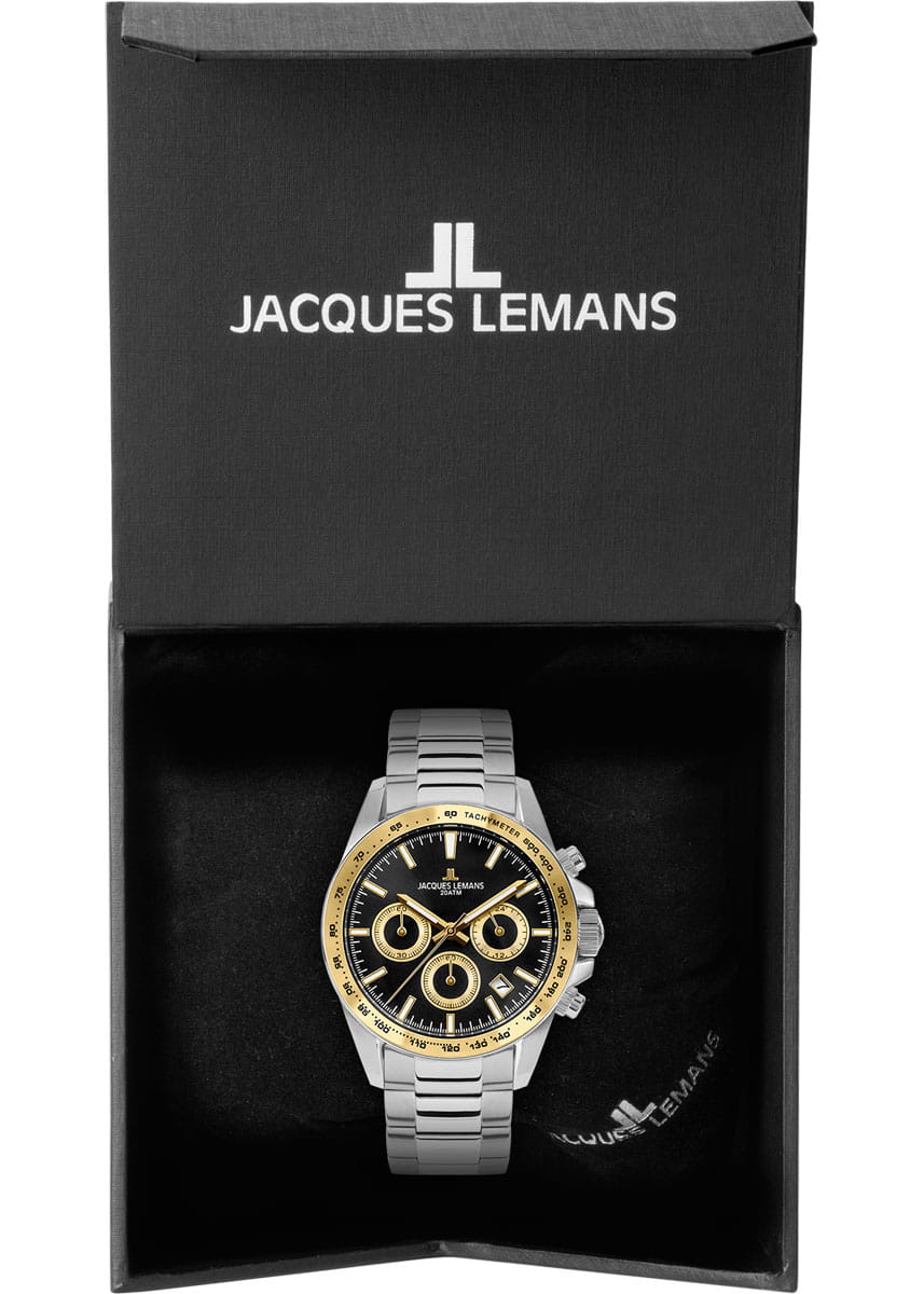 Мужские часы Jacques Lemans Liverpool 1-1877H с минеральным стекломМинеральное стеклоМинеральное стекло представляет собой искусственно выращенный минерал кварца. Такое стекло отличается особой устойчивостью к повреждениям и царапинам. Уступает по некоторым качествам сапфировому стеклу., кварцевый механизм с высокой точностью. Часы- хронографХронографФункция позволяет измерять отрезки времени с особой точностью: часы, минуты, секунды. Верным признаком хронографа является наличие на циферблате 3 дополнительных окошек-счётчиков. с секундомеромСекундомерСекундоме́р — прибор, способный измерять интервалы времени с точностью до долей секунды. представляют собой стильный аксессуар, отражающий идеальное сочетание современного дизайна, надёжности и функциональности.  Неподвижный безельБезельВнешний ободок, закрепляющий стекло. В спортивных часах так называется поворотное кольцо с делениями на циферблате, выполняет роль таймера – замеряет отрезки времени на шкале. Неподвижный безель – элемент декора. Однонаправленно вращающийся безель на дайверских часах позволяет фиксировать моменты погружения и выныривания на поверхность. из нержавеющей стали с PVDPVDУльтратонкое покрытие наносится в технике вакуумного напыления, сочетает в себе нитрид титана особой прочности со слоем золота или оксида хрома. Несёт в себе декоративную или защитную функцию. покрытием и с тахиметромТахиметрРазмеченная шкала, располагается на ободке или безеле часов. Тахиметр позволяет рассчитать скорость на определённом участке пути, расстояние измеряется в километрах или милях.. На циферблате расположены два дополнительных индикатора и окошко даты. Стрелки и метки с люминесцентным покрытиемЛюминесцентное покрытиеПозволяет считывать показания времени в темноте. Производители наносят на стрелки, часовые индексы, безель или поверхность циферблата светонакопительный состав, дающий холодное свечение.. Класс водозащиты: 200 метров, позволит плавать, нырять и заниматься другими водными видами спорта. Рифленая заводная головка с защитой. Браслет из нержавеющей стали на раскладной застёжкеРаскладная застёжкаТакой тип застёжки используется только на браслетах из металла. Она никогда не раскрывается полностью, происходит разделение на 2 и более частей. Раскладывающая застёжка снизит вероятность потери часов к минимуму..