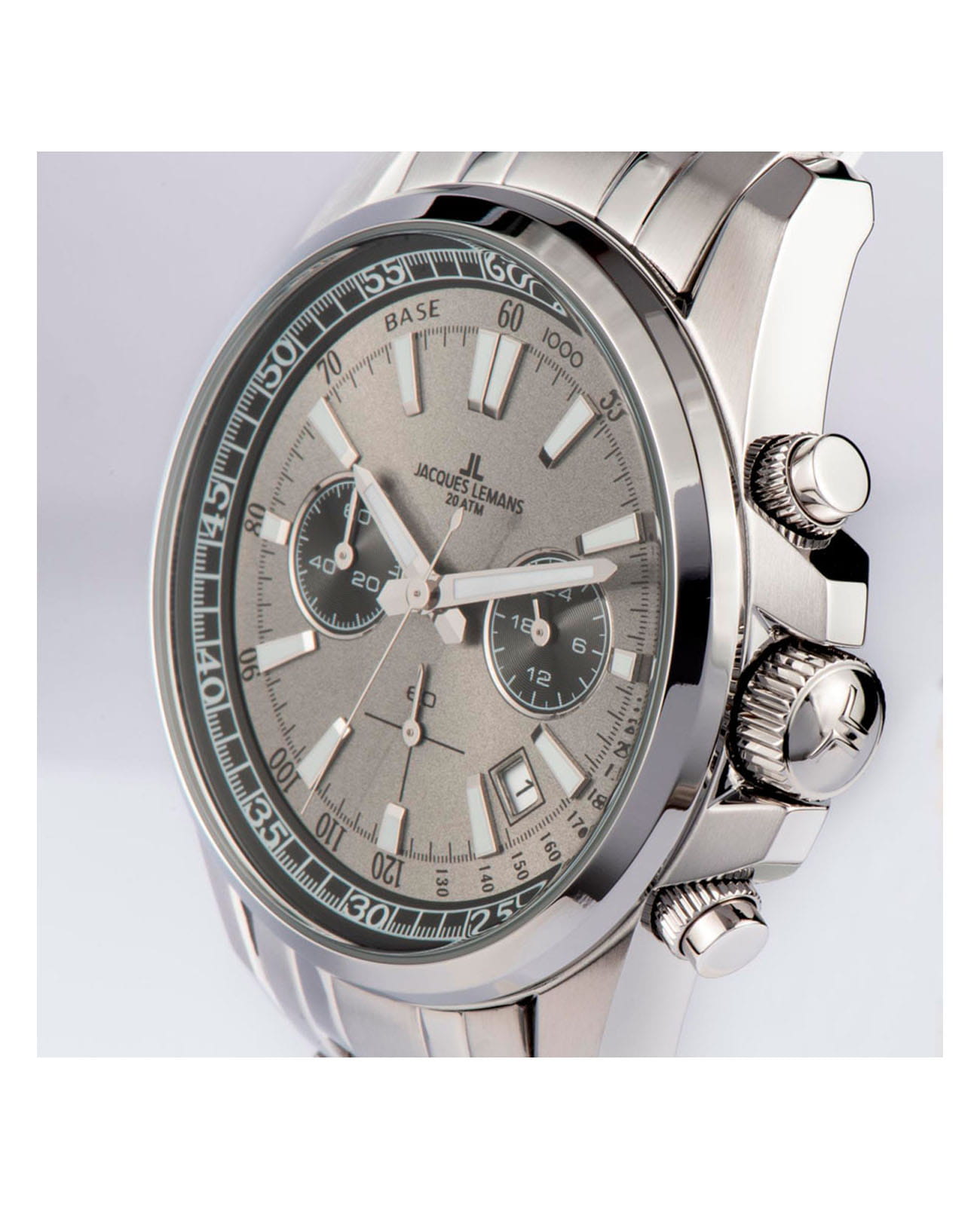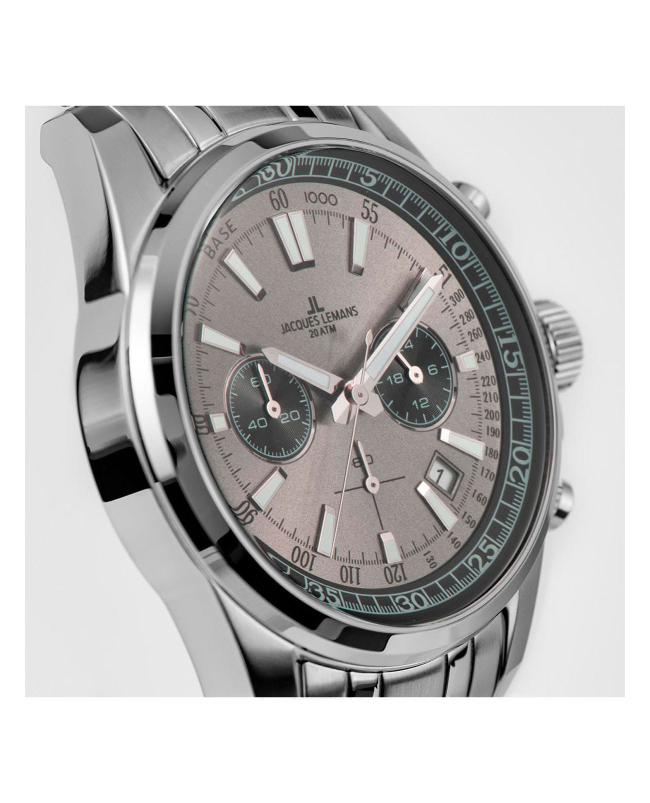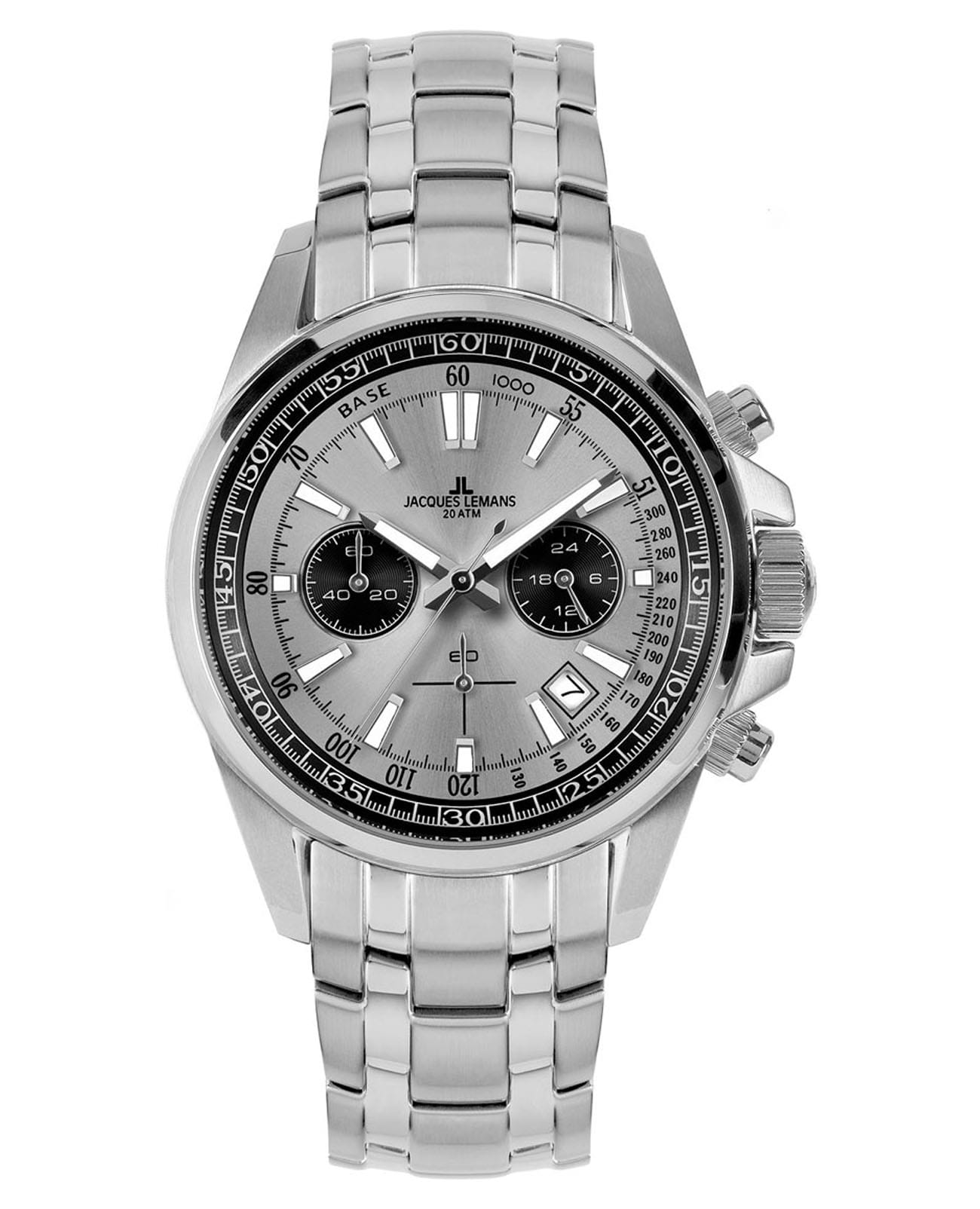Мужские австрийские часы-хронографХронографФункция позволяет измерять отрезки времени с особой точностью: часы, минуты, секунды. Верным признаком хронографа является наличие на циферблате 3 дополнительных окошек-счётчиков. c секундомеромСекундомерСекундоме́р — прибор, способный измерять интервалы времени с точностью до долей секунды. Jacques Lemans Sport 1-2117ZA, кварцевый механизм с высокой точностью. Минеральное стеклоМинеральное стеклоМинеральное стекло представляет собой искусственно выращенный минерал кварца. Такое стекло отличается особой устойчивостью к повреждениям и царапинам. Уступает по некоторым качествам сапфировому стеклу. устойчивое к мелким механическим повреждениям. Корпус часов изготовлен из стали. Циферблат выполнен по технологии Sunray (солнечные лучи). Стрелки и метки с люминесцентным покрытиемЛюминесцентное покрытиеПозволяет считывать показания времени в темноте. Производители наносят на стрелки, часовые индексы, безель или поверхность циферблата светонакопительный состав, дающий холодное свечение.. Окошко даты находится в положении между 4 и 5 часов. Класс водозащиты: 200 метров, позволит плавать, нырять и заниматься другими водными видами спорта. Стальной браслет на раскладной застёжкеРаскладная застёжкаТакой тип застёжки используется только на браслетах из металла. Она никогда не раскрывается полностью, происходит разделение на 2 и более частей. Раскладывающая застёжка снизит вероятность потери часов к минимуму..