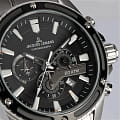 Мужские часы Jacques Lemans Liverpool 1-2141E с минеральным стекломМинеральное стеклоМинеральное стекло представляет собой искусственно выращенный минерал кварца. Такое стекло отличается особой устойчивостью к повреждениям и царапинам. Уступает по некоторым качествам сапфировому стеклу., кварцевый механизм с высокой точностью. Часы- хронографХронографФункция позволяет измерять отрезки времени с особой точностью: часы, минуты, секунды. Верным признаком хронографа является наличие на циферблате 3 дополнительных окошек-счётчиков. с секундомеромСекундомерСекундоме́р — прибор, способный измерять интервалы времени с точностью до долей секунды. представляют собой стильный аксессуар, отражающий идеальное сочетание современного дизайна, надёжности и функциональности. БезельБезельВнешний ободок, закрепляющий стекло. В спортивных часах так называется поворотное кольцо с делениями на циферблате, выполняет роль таймера – замеряет отрезки времени на шкале. Неподвижный безель – элемент декора. Однонаправленно вращающийся безель на дайверских часах позволяет фиксировать моменты погружения и выныривания на поверхность. из нержавеющей стали с PVDPVDУльтратонкое покрытие наносится в технике вакуумного напыления, сочетает в себе нитрид титана особой прочности со слоем золота или оксида хрома. Несёт в себе декоративную или защитную функцию. покрытием и с декоративными прорезями крепится к корпусу шестью винтами. На циферблате расположены три дополнительных индикатора и окошко даты. Стрелки и метки с люминесцентным покрытиемЛюминесцентное покрытиеПозволяет считывать показания времени в темноте. Производители наносят на стрелки, часовые индексы, безель или поверхность циферблата светонакопительный состав, дающий холодное свечение.. Класс водозащиты: 200 метров, позволит плавать, нырять и заниматься другими водными видами спорта. Браслет из нержавеющей стали на раскладной застёжкеРаскладная застёжкаТакой тип застёжки используется только на браслетах из металла. Она никогда не раскрывается полностью, происходит разделение на 2 и более частей. Раскладывающая застёжка снизит вероятность потери часов к минимуму..