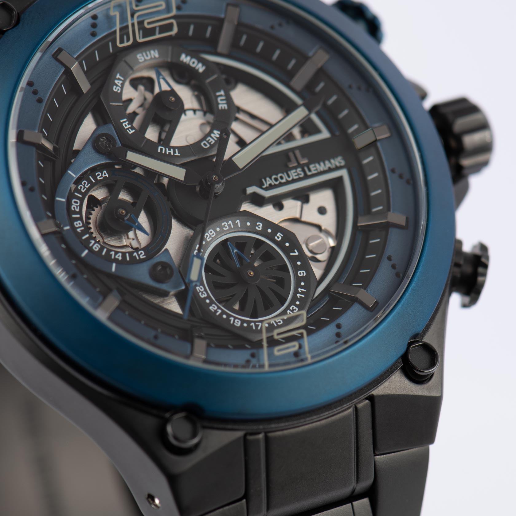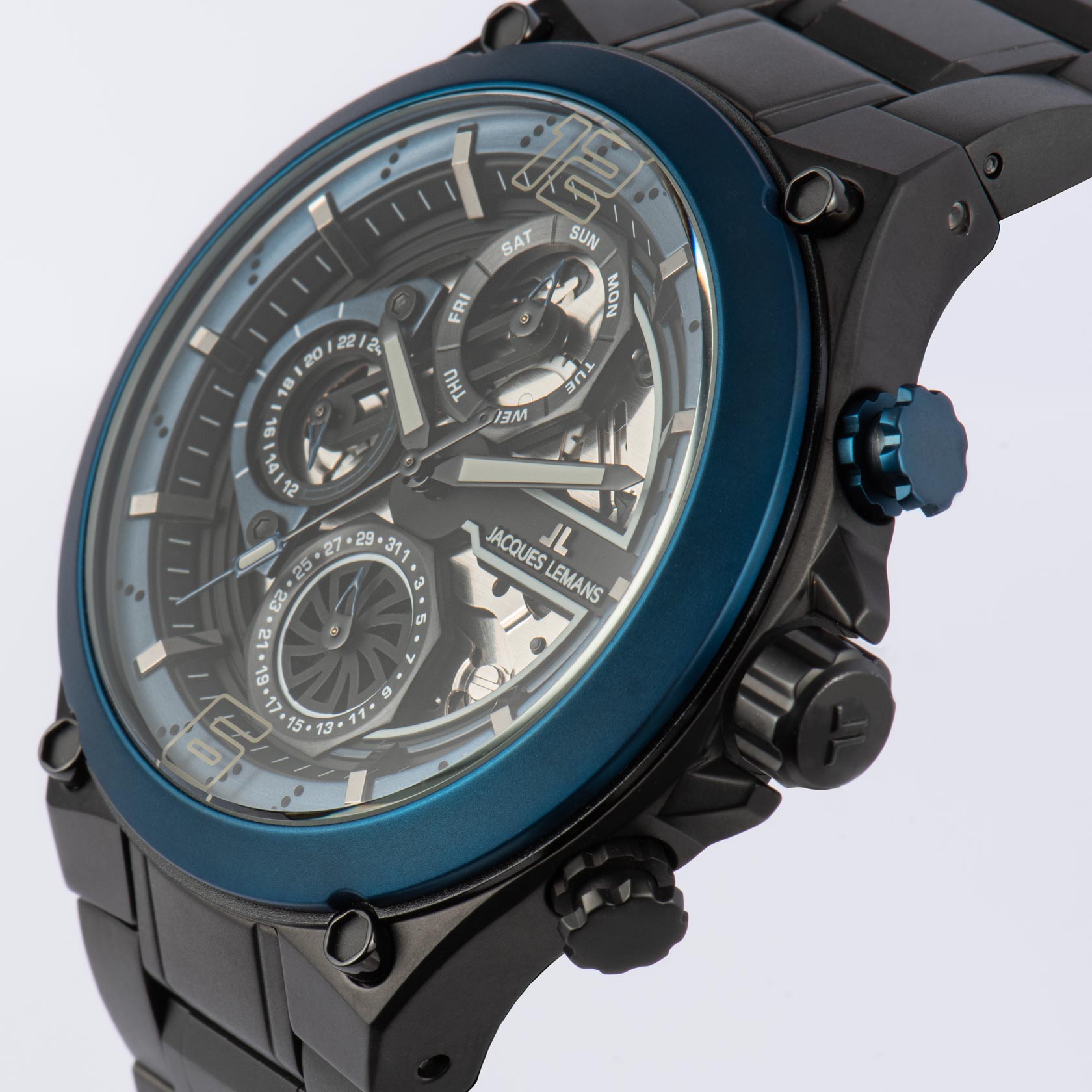 Мужские часы Jacques Lemans Sport 1-2150G с минеральным стекломМинеральное стеклоМинеральное стекло представляет собой искусственно выращенный минерал кварца. Такое стекло отличается особой устойчивостью к повреждениям и царапинам. Уступает по некоторым качествам сапфировому стеклу., кварцевый механизм с высокой точностью. Часы- хронографХронографФункция позволяет измерять отрезки времени с особой точностью: часы, минуты, секунды. Верным признаком хронографа является наличие на циферблате 3 дополнительных окошек-счётчиков. с секундомеромСекундомерСекундоме́р — прибор, способный измерять интервалы времени с точностью до долей секунды. представляют собой стильный аксессуар, отражающий идеальное сочетание современного дизайна, надёжности и функциональности. Неподвижный безельБезельВнешний ободок, закрепляющий стекло. В спортивных часах так называется поворотное кольцо с делениями на циферблате, выполняет роль таймера – замеряет отрезки времени на шкале. Неподвижный безель – элемент декора. Однонаправленно вращающийся безель на дайверских часах позволяет фиксировать моменты погружения и выныривания на поверхность. из нержавеющей стали с PVDPVDУльтратонкое покрытие наносится в технике вакуумного напыления, сочетает в себе нитрид титана особой прочности со слоем золота или оксида хрома. Несёт в себе декоративную или защитную функцию. покрытием. Особая привлекательность часов серии Manchester заключается в циферблате. Он прозрачный — это дает возможность разглядеть кварцевый механизм с функциями даты, дня недели и индикатора 24-х часов. Стрелки и метки с люминесцентным покрытиемЛюминесцентное покрытиеПозволяет считывать показания времени в темноте. Производители наносят на стрелки, часовые индексы, безель или поверхность циферблата светонакопительный состав, дающий холодное свечение.. Класс водозащиты: 100 метров, позволит плавать, нырять и заниматься другими водными видами спорта. Браслет из нержавеющей стали с PVDPVDУльтратонкое покрытие наносится в технике вакуумного напыления, сочетает в себе нитрид титана особой прочности со слоем золота или оксида хрома. Несёт в себе декоративную или защитную функцию. покрытием на раскладной застёжкеРаскладная застёжкаТакой тип застёжки используется только на браслетах из металла. Она никогда не раскрывается полностью, происходит разделение на 2 и более частей. Раскладывающая застёжка снизит вероятность потери часов к минимуму..