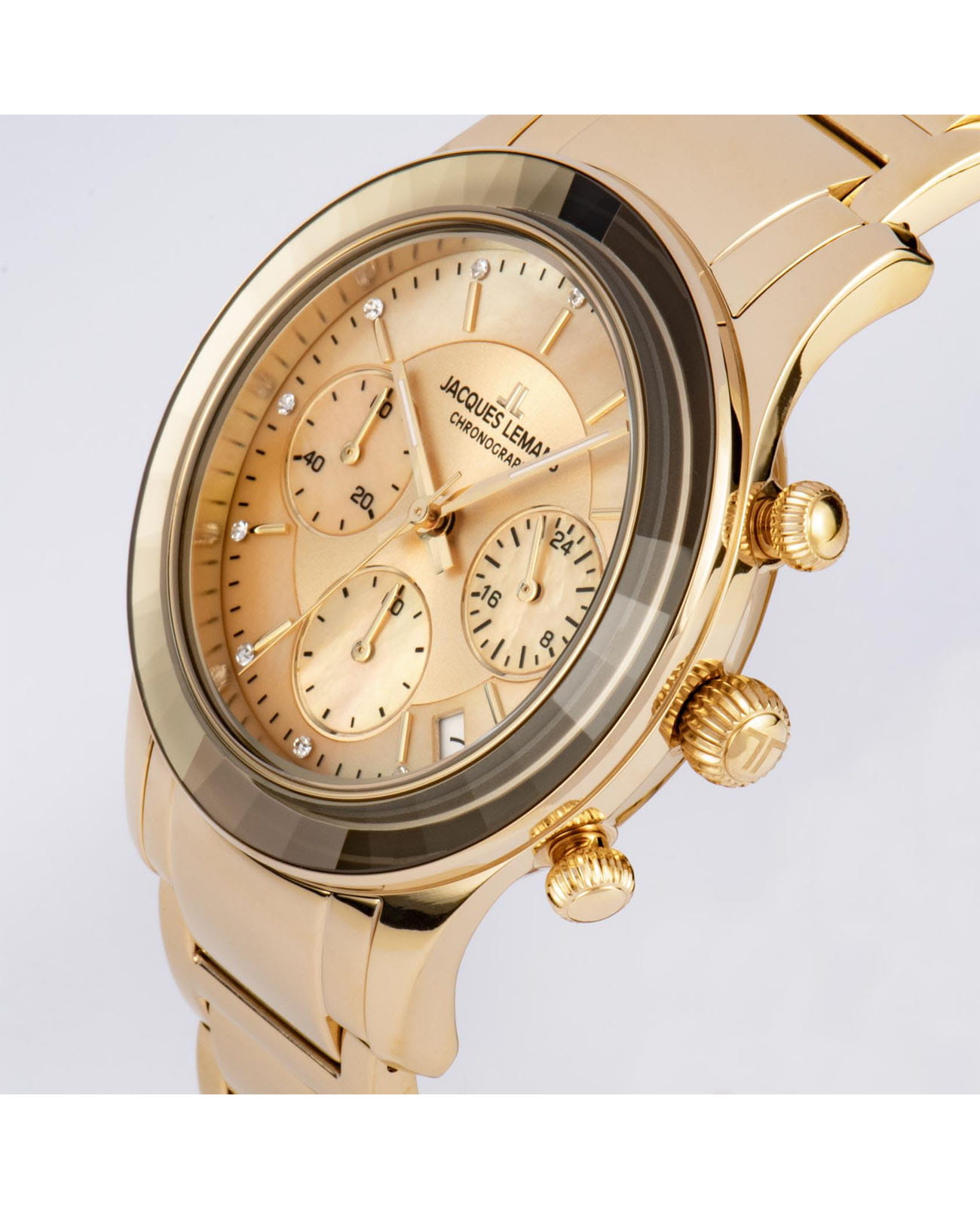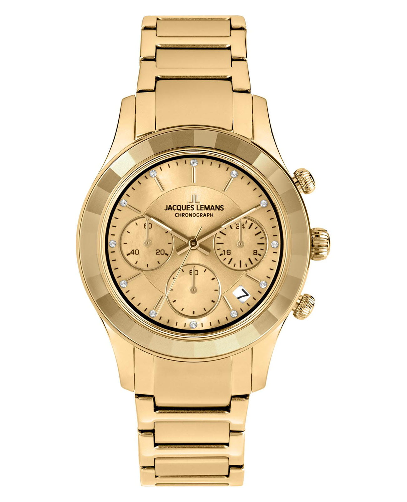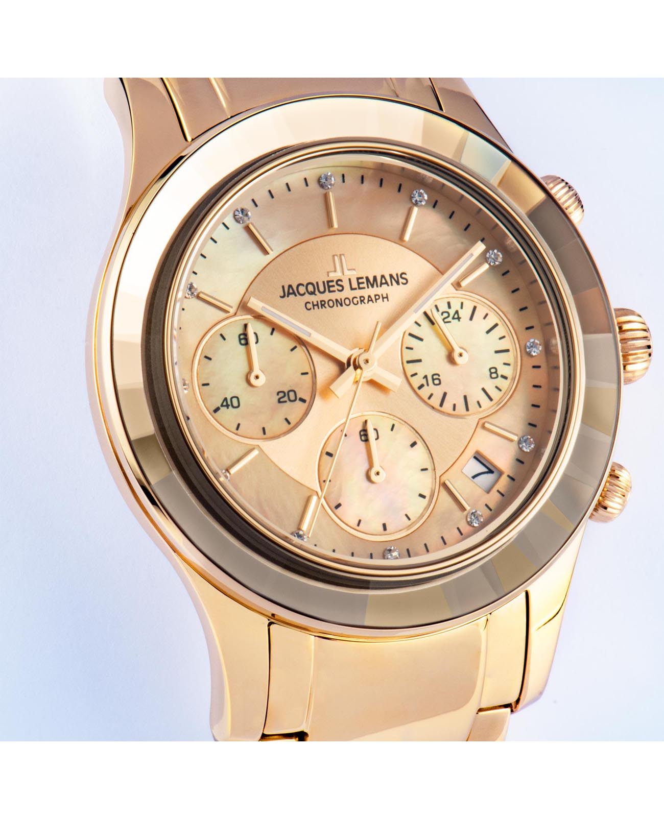 Женские часы-хронографХронографФункция позволяет измерять отрезки времени с особой точностью: часы, минуты, секунды. Верным признаком хронографа является наличие на циферблате 3 дополнительных окошек-счётчиков. c секундомеромСекундомерСекундоме́р — прибор, способный измерять интервалы времени с точностью до долей секунды. Jacques Lemans Venice 1-2151H, кварцевый механизм с высокой точностью. Минеральное стеклоМинеральное стеклоМинеральное стекло представляет собой искусственно выращенный минерал кварца. Такое стекло отличается особой устойчивостью к повреждениям и царапинам. Уступает по некоторым качествам сапфировому стеклу. устойчивое к мелким механическим повреждениям. Корпус из нержавеющей стали с PVDPVDУльтратонкое покрытие наносится в технике вакуумного напыления, сочетает в себе нитрид титана особой прочности со слоем золота или оксида хрома. Несёт в себе декоративную или защитную функцию. покрытием. Широкий безельБезельВнешний ободок, закрепляющий стекло. В спортивных часах так называется поворотное кольцо с делениями на циферблате, выполняет роль таймера – замеряет отрезки времени на шкале. Неподвижный безель – элемент декора. Однонаправленно вращающийся безель на дайверских часах позволяет фиксировать моменты погружения и выныривания на поверхность. с гранями. На циферблате расположены три дополнительных индикатора. Окошко даты находится в положении между 4 и 5 часов. Стрелки с люминесцентным покрытиемЛюминесцентное покрытиеПозволяет считывать показания времени в темноте. Производители наносят на стрелки, часовые индексы, безель или поверхность циферблата светонакопительный состав, дающий холодное свечение.. Каждая накладная риска украшена кристаллом Swarowski. Класс водозащиты: 50 метров, позволит защитить корпус от случайных брызг или капель дождя. Браслет из нержавеющей стали с частичным PVDPVDУльтратонкое покрытие наносится в технике вакуумного напыления, сочетает в себе нитрид титана особой прочности со слоем золота или оксида хрома. Несёт в себе декоративную или защитную функцию. покрытием на раскладной застёжкеРаскладная застёжкаТакой тип застёжки используется только на браслетах из металла. Она никогда не раскрывается полностью, происходит разделение на 2 и более частей. Раскладывающая застёжка снизит вероятность потери часов к минимуму..