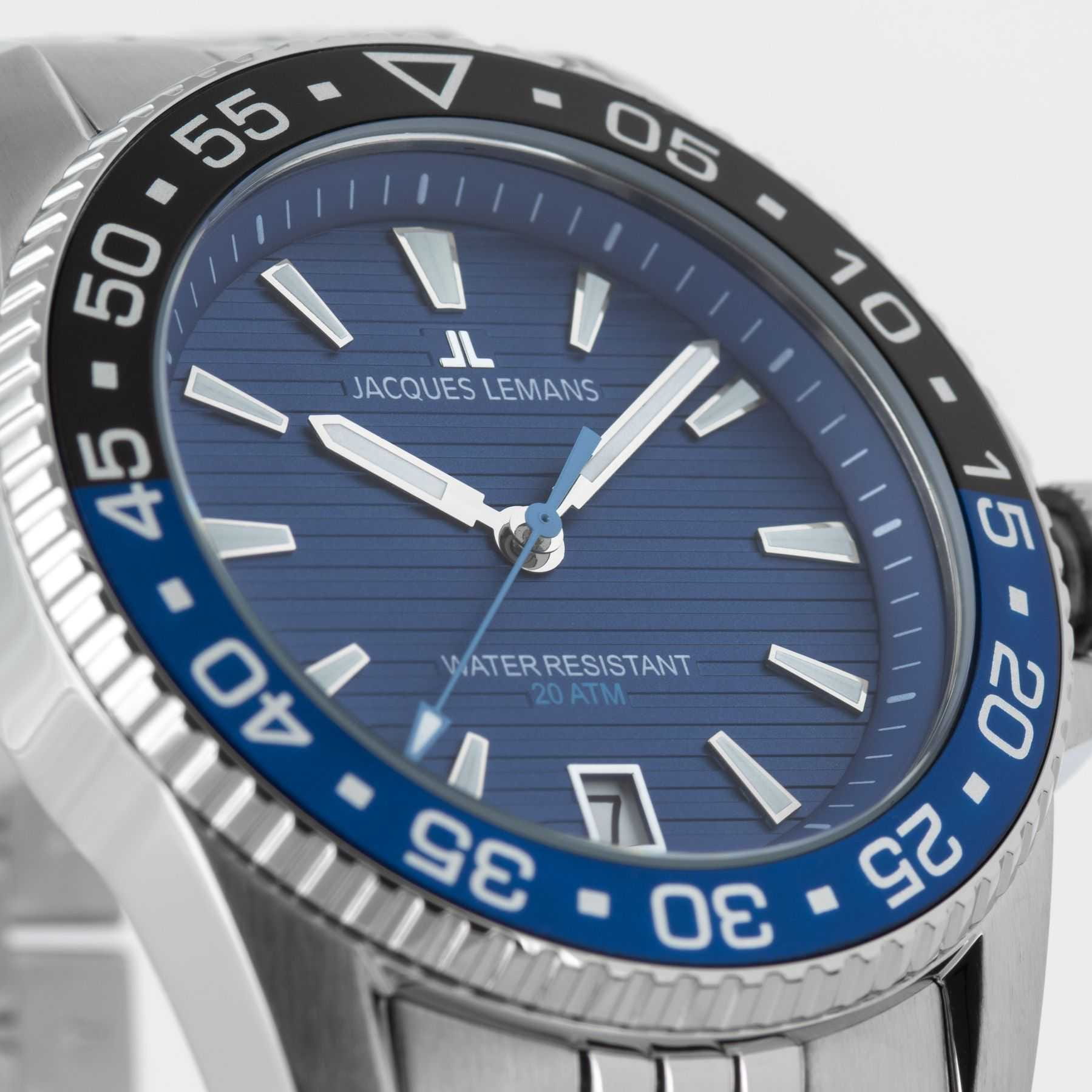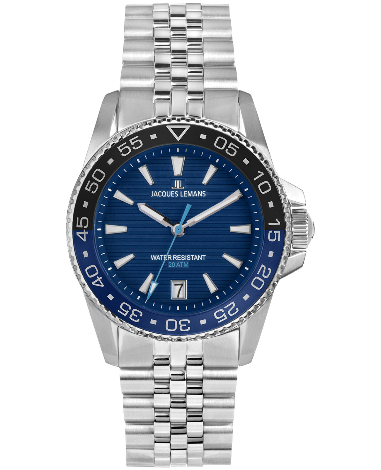 Мужские спортивные часы Jacques Lemans Liverpool Diver 1-2205i представляют собой стильный аксессуар, отражающий идеальное сочетание современного дизайна, надёжности и функциональности. Корпус из нержавеющей стали диаметром 41 мм идеально сбалансирован и элегантен. Ударопрочное минеральное стеклоМинеральное стеклоМинеральное стекло представляет собой искусственно выращенный минерал кварца. Такое стекло отличается особой устойчивостью к повреждениям и царапинам. Уступает по некоторым качествам сапфировому стеклу. Crystex защищает циферблат от царапин. Широкий безельБезельВнешний ободок, закрепляющий стекло. В спортивных часах так называется поворотное кольцо с делениями на циферблате, выполняет роль таймера – замеряет отрезки времени на шкале. Неподвижный безель – элемент декора. Однонаправленно вращающийся безель на дайверских часах позволяет фиксировать моменты погружения и выныривания на поверхность. с PVD-покрытиемPVDУльтратонкое покрытие наносится в технике вакуумного напыления, сочетает в себе нитрид титана особой прочности со слоем золота или оксида хрома. Несёт в себе декоративную или защитную функцию., на который вынесена дополнительная индикация секунд. Стальной браслет на раскладной застёжке с фиксаторомРаскладная застёжкаТакой тип застёжки используется только на браслетах из металла. Она никогда не раскрывается полностью, происходит разделение на 2 и более частей. Раскладывающая застёжка снизит вероятность потери часов к минимуму. обеспечивает комфортное ношение. Водозащита 200 метров позволит плавать, нырять и заниматься другими водными видами спорта. Стрелки и метки с люминесцентным покрытиемЛюминесцентное покрытиеПозволяет считывать показания времени в темноте. Производители наносят на стрелки, часовые индексы, безель или поверхность циферблата светонакопительный состав, дающий холодное свечение. позволяющие легко определять время даже в темноте. Окошко даты находится в положении 6 часов. Это аксессуар для мужчины, который ценит классический стиль и функциональность.
