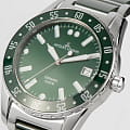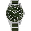 Часы с явными спортивными акцентами могут выглядеть элегантно. Крупный корпус диаметром 42 мм сделан из нержавеющей стали, на широкий безельБезельВнешний ободок, закрепляющий стекло. В спортивных часах так называется поворотное кольцо с делениями на циферблате, выполняет роль таймера – замеряет отрезки времени на шкале. Неподвижный безель – элемент декора. Однонаправленно вращающийся безель на дайверских часах позволяет фиксировать моменты погружения и выныривания на поверхность. вынесена дополнительная индикация. Точный кварцевый механизм отвечает за движение хорошо читаемых стрелок, покрытых люминесцентным составомЛюминесцентное покрытиеПозволяет считывать показания времени в темноте. Производители наносят на стрелки, часовые индексы, безель или поверхность циферблата светонакопительный состав, дающий холодное свечение.. Таким же образом выделены и индексы, поэтому время по этим часам легко определить даже в темноте. В положении «3 часа» находится окошко даты. Еще одна спортивная составляющая — повышенная водостойкость, равная 10 атмосфер: в часах можно плавать. Вместе с этим, модель идеально впишется и в классический образ, и в повседневный. Особая деталь — звенья браслета из высокотехнологичной керамикиВысокотехнологичная керамикаИнновационный запатентованный Rado материал с гладкой или матовой поверхностью. Керамика за счёт кристаллической структуры обладает повышенной устойчивостью от возникновения царапин. Материал способен принимать температуру тела человека, обеспечивая невероятный комфорт при ношении. зеленого цвета, в тон циферблату. Этот материал удобно носить даже в мороз: он быстро нагревается до комфортной температуры тела. К тому же, керамика стойко сопротивляется появлению микроцарапин. На браслет установлена раскладная застёжкаРаскладная застёжкаТакой тип застёжки используется только на браслетах из металла. Она никогда не раскрывается полностью, происходит разделение на 2 и более частей. Раскладывающая застёжка снизит вероятность потери часов к минимуму..
