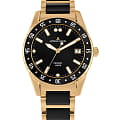 Часы с явными спортивными акцентами могут выглядеть элегантно. Крупный корпус диаметром 42 мм сделан из нержавеющей стали с PVD-покрытиемPVDУльтратонкое покрытие наносится в технике вакуумного напыления, сочетает в себе нитрид титана особой прочности со слоем золота или оксида хрома. Несёт в себе декоративную или защитную функцию., на широкий безельБезельВнешний ободок, закрепляющий стекло. В спортивных часах так называется поворотное кольцо с делениями на циферблате, выполняет роль таймера – замеряет отрезки времени на шкале. Неподвижный безель – элемент декора. Однонаправленно вращающийся безель на дайверских часах позволяет фиксировать моменты погружения и выныривания на поверхность. вынесена дополнительная индикация. Точный кварцевый механизм отвечает за движение хорошо читаемых стрелок, покрытых люминесцентным составомЛюминесцентное покрытиеПозволяет считывать показания времени в темноте. Производители наносят на стрелки, часовые индексы, безель или поверхность циферблата светонакопительный состав, дающий холодное свечение.. Таким же образом выделены и индексы, поэтому время по этим часам легко определить даже в темноте. В положении «3 часа» находится окошко даты. Еще одна спортивная составляющая — повышенная водостойкость, равная 10 атмосфер: в часах можно плавать. Вместе с этим, модель идеально впишется и в классический образ, и в повседневный. Особая деталь — звенья браслета из высокотехнологичной керамикиВысокотехнологичная керамикаИнновационный запатентованный Rado материал с гладкой или матовой поверхностью. Керамика за счёт кристаллической структуры обладает повышенной устойчивостью от возникновения царапин. Материал способен принимать температуру тела человека, обеспечивая невероятный комфорт при ношении. черного цвета, в тон циферблату. Этот материал удобно носить даже в мороз: он быстро нагревается до комфортной температуры тела. К тому же, керамика стойко сопротивляется появлению микроцарапин. На браслет установлена раскладная застёжкаРаскладная застёжкаТакой тип застёжки используется только на браслетах из металла. Она никогда не раскрывается полностью, происходит разделение на 2 и более частей. Раскладывающая застёжка снизит вероятность потери часов к минимуму..