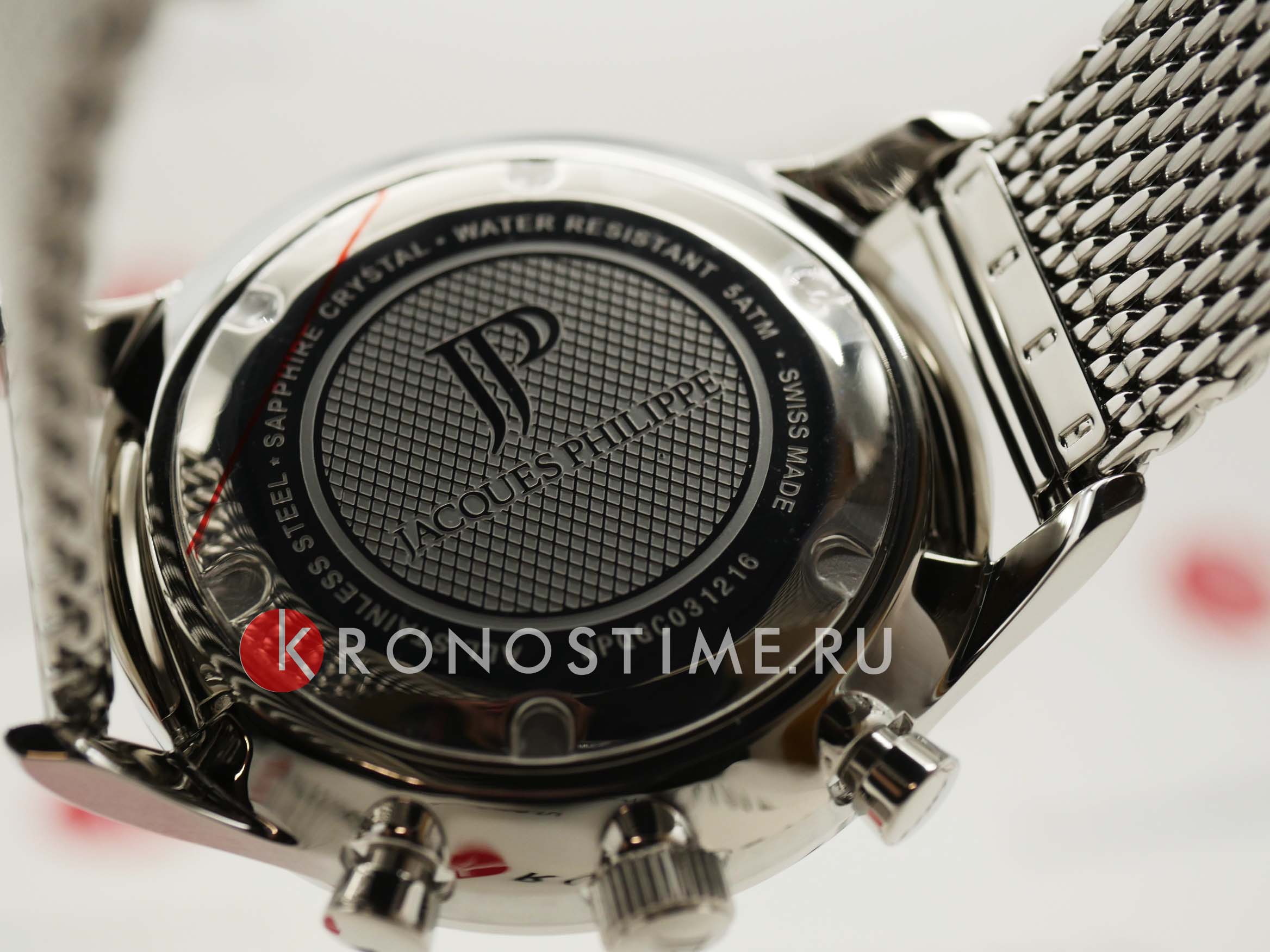 Швейцарские мужские часы-хронографХронографФункция позволяет измерять отрезки времени с особой точностью: часы, минуты, секунды. Верным признаком хронографа является наличие на циферблате 3 дополнительных окошек-счётчиков. Jacques Philippe Gallant JPQGC031216, кварцевый механизм с высокой точностью. Сапфировое стеклоСапфировое стеклоПрочный и надёжный материал из кристалла сапфира синтетического происхождения, характеризующийся особой твёрдостью и устойчивостью к царапинам и повреждениям. устойчивое к появлению царапин, обладающее высокой прозрачностью. Корпус часов изготовлен из нержавеющей стали. На циферблате три дополнительных индикатора. Стрелки с люминесцентным покрытиемЛюминесцентное покрытиеПозволяет считывать показания времени в темноте. Производители наносят на стрелки, часовые индексы, безель или поверхность циферблата светонакопительный состав, дающий холодное свечение.. Окошко даты находится между 4 и 5 часами. Класс водозащиты: 50 метров, позволит защитить корпус от случайных брызг или капель дождя. Стальной браслет миланского плетения на раскладном замкеРаскладной замокДанный вариант застежки используется только на часах с металлическим браслетом. Отличительная особенность такого крепления в том, что длина браслета становится универсальной и вы можете самостоятельно отрегулировать нужный вам размер – застежка просто двигается по браслету часов..